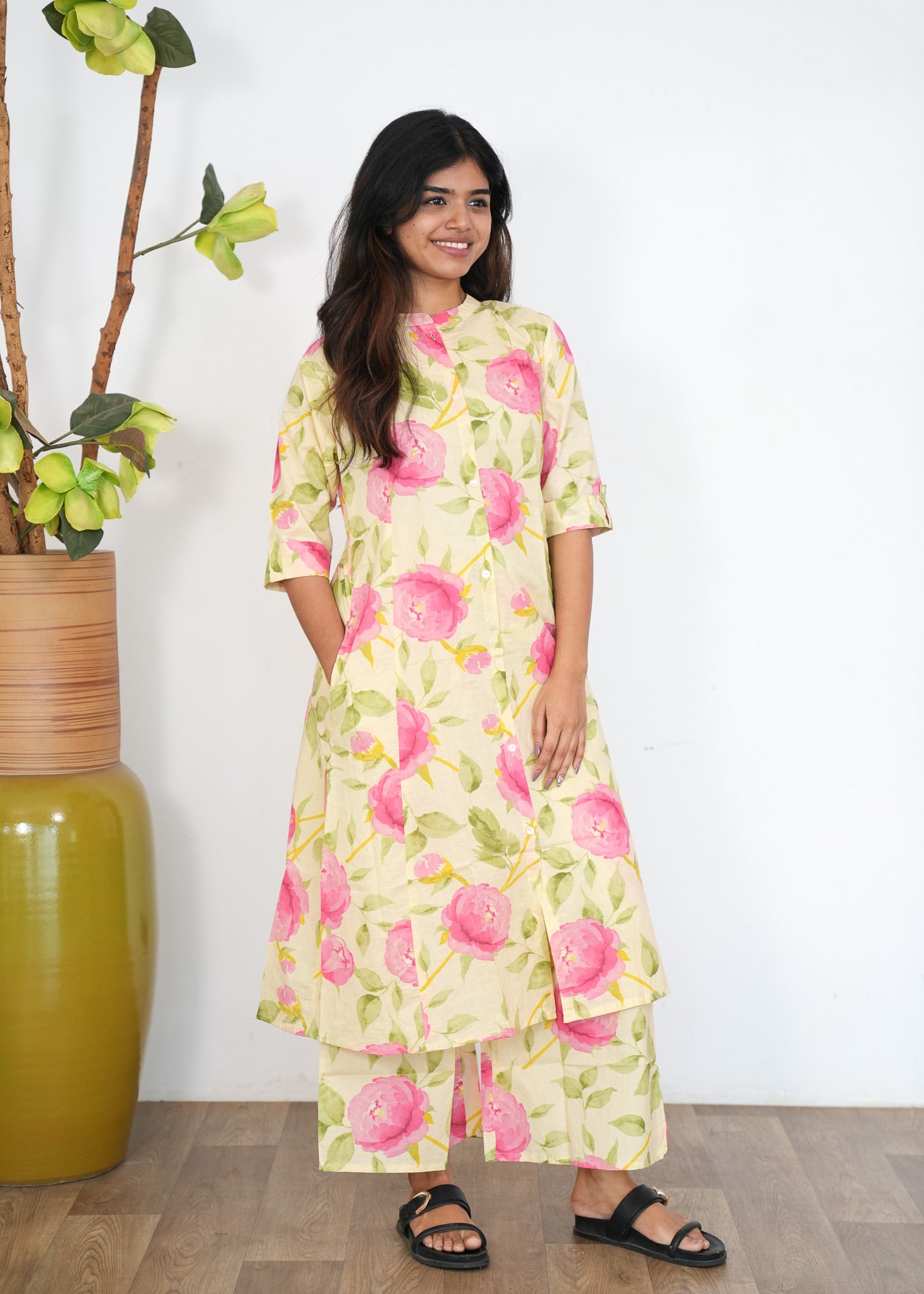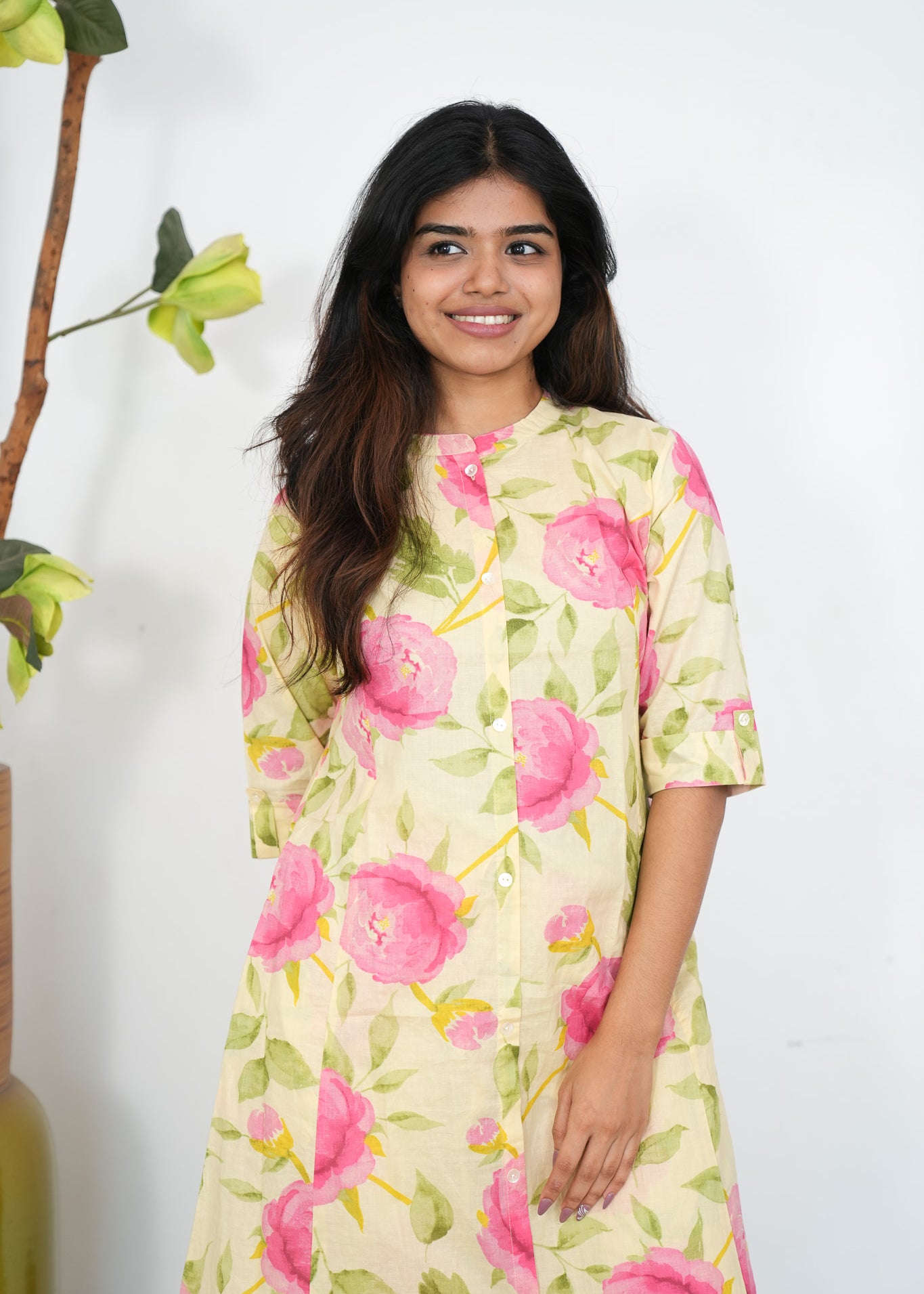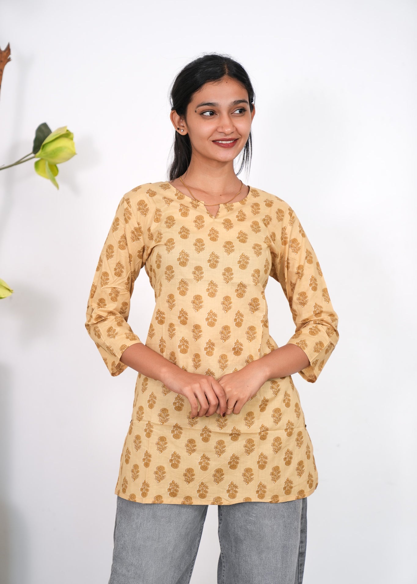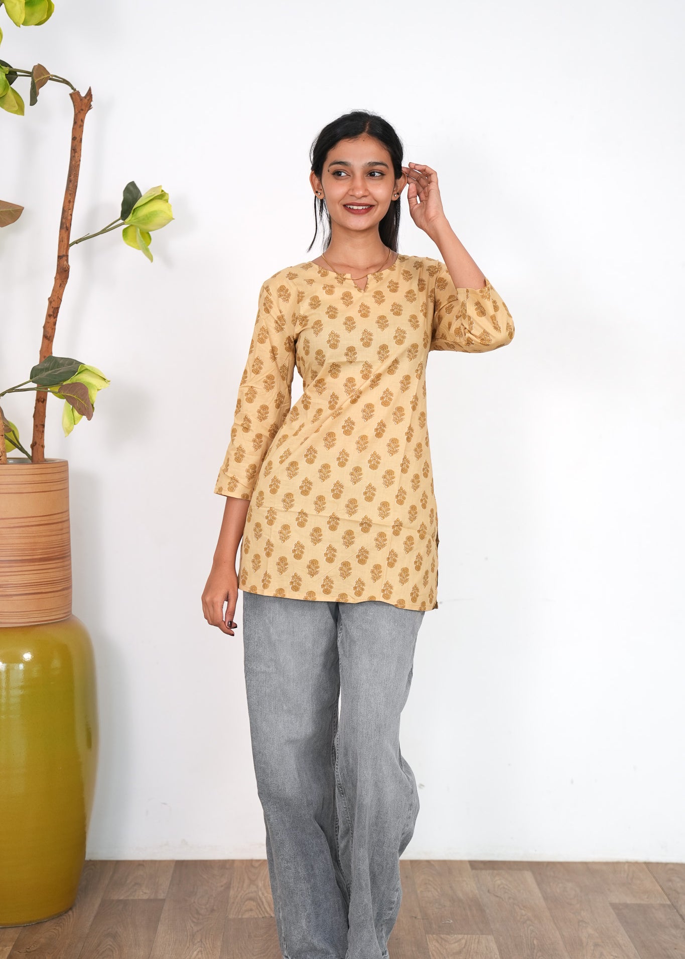Beige ajrakh cotton shirt dress(attached sleeves)