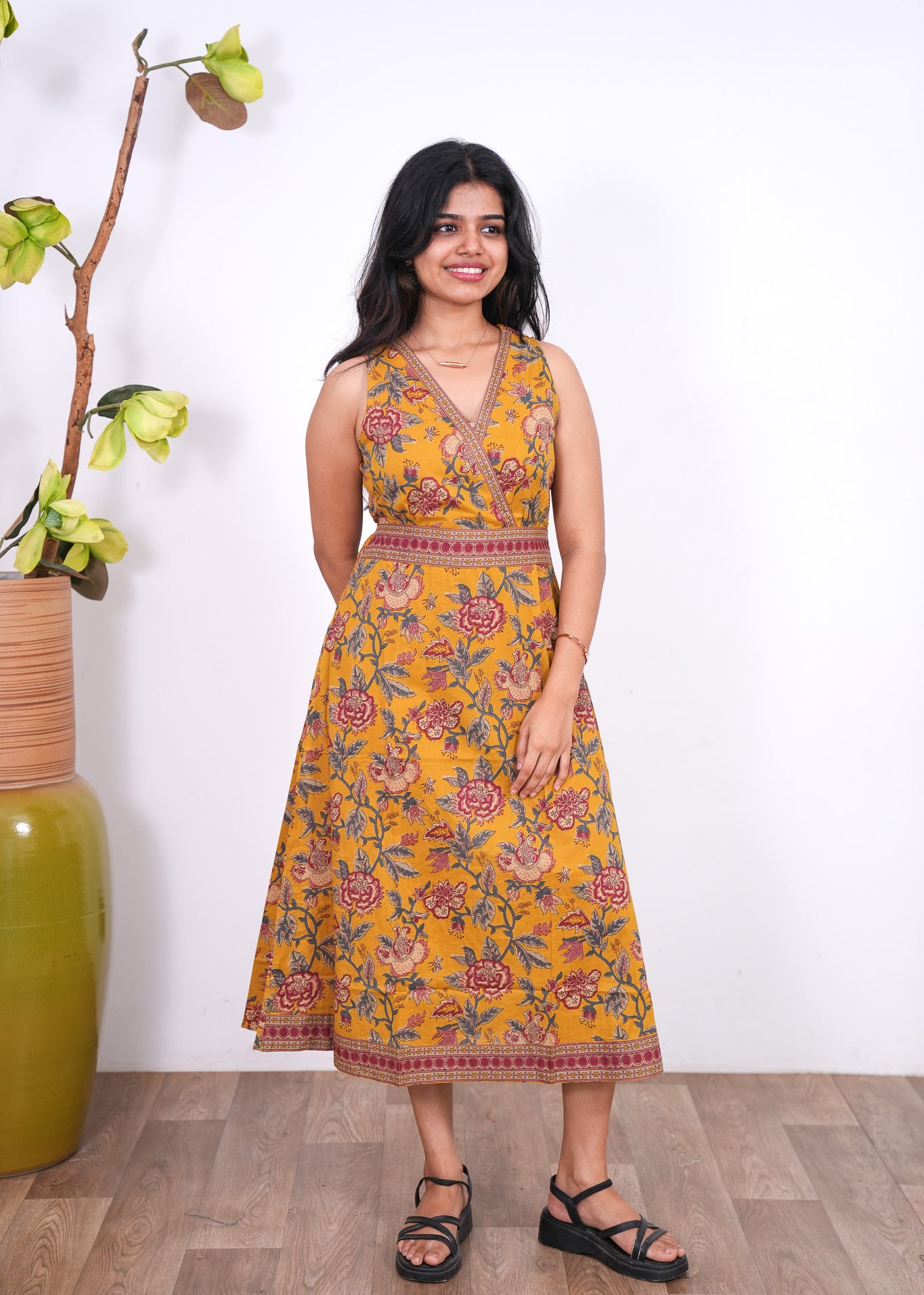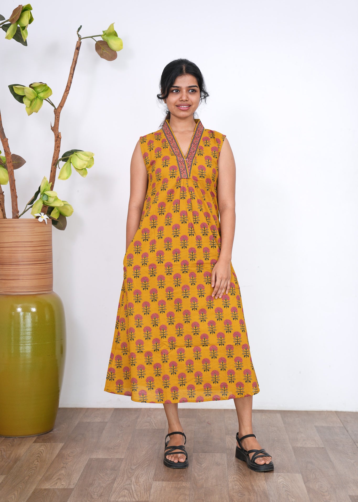 Ira cotton v neck gathered dress -Mustard(attached sleeves)