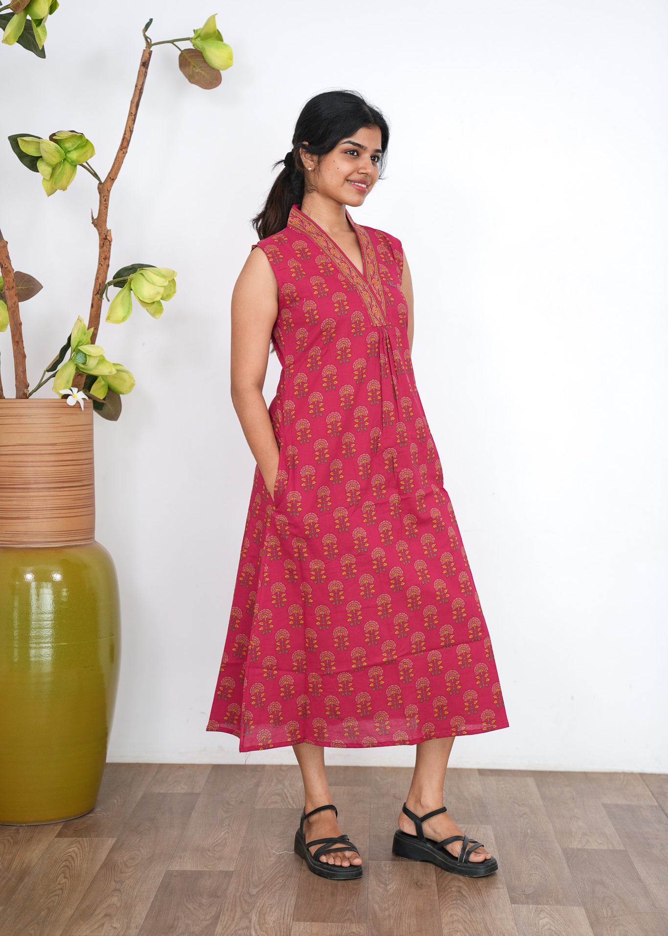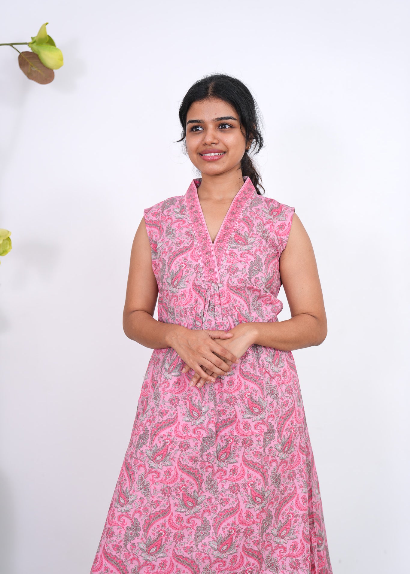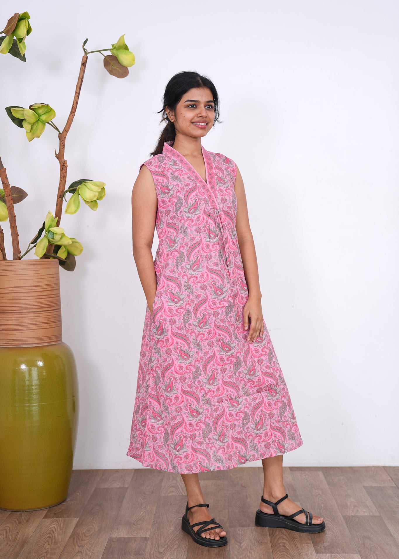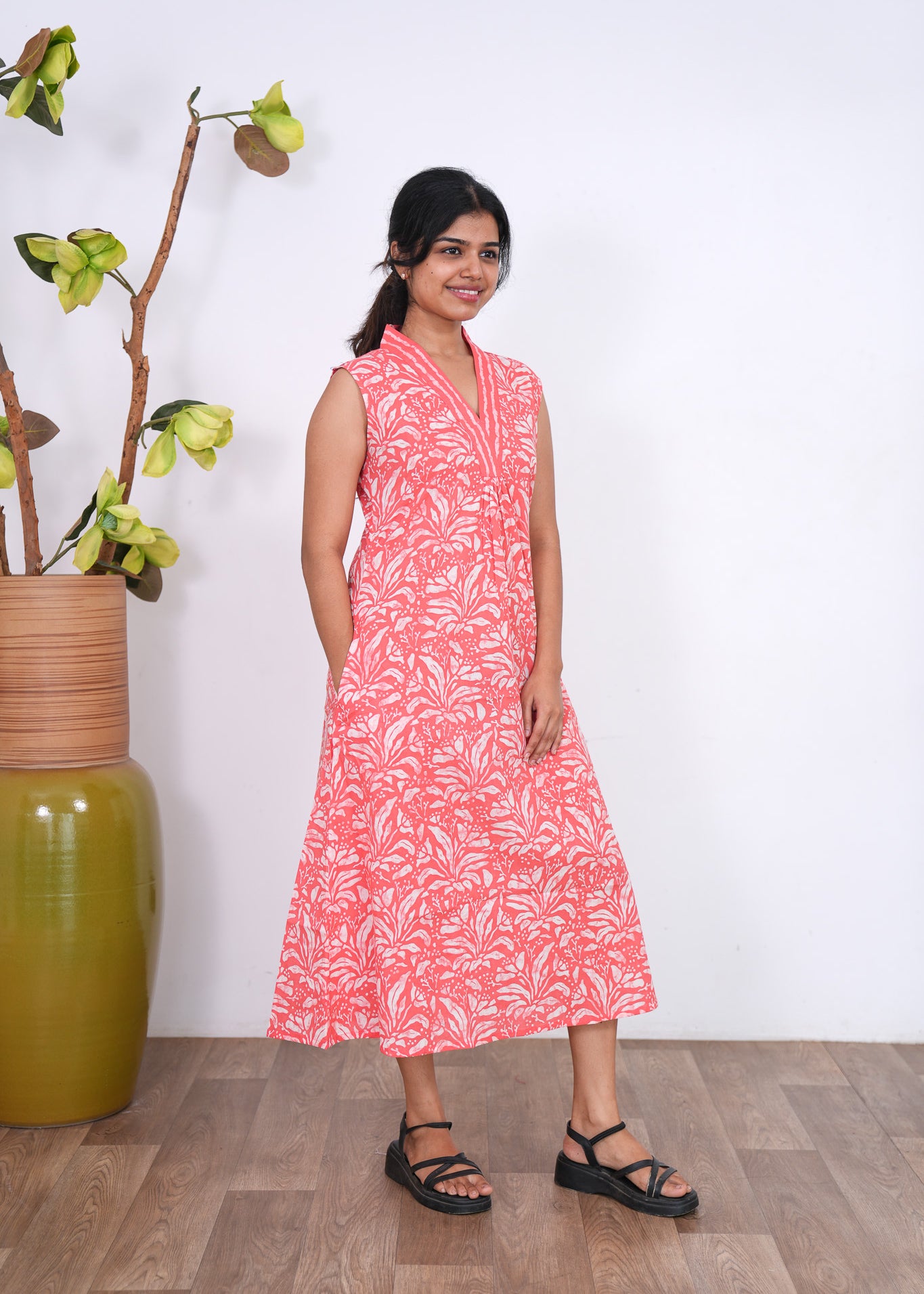 Ira cotton v neck gathered dress -Flamingo pink(attached sleeves)