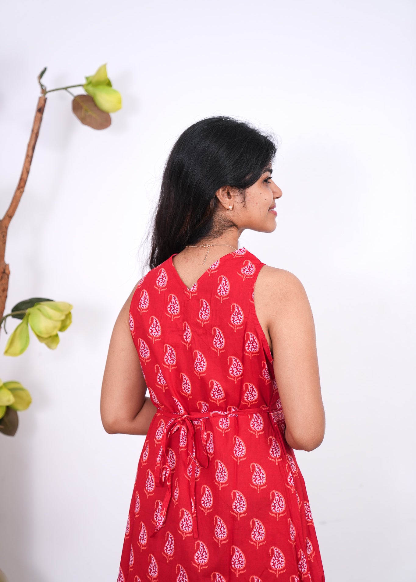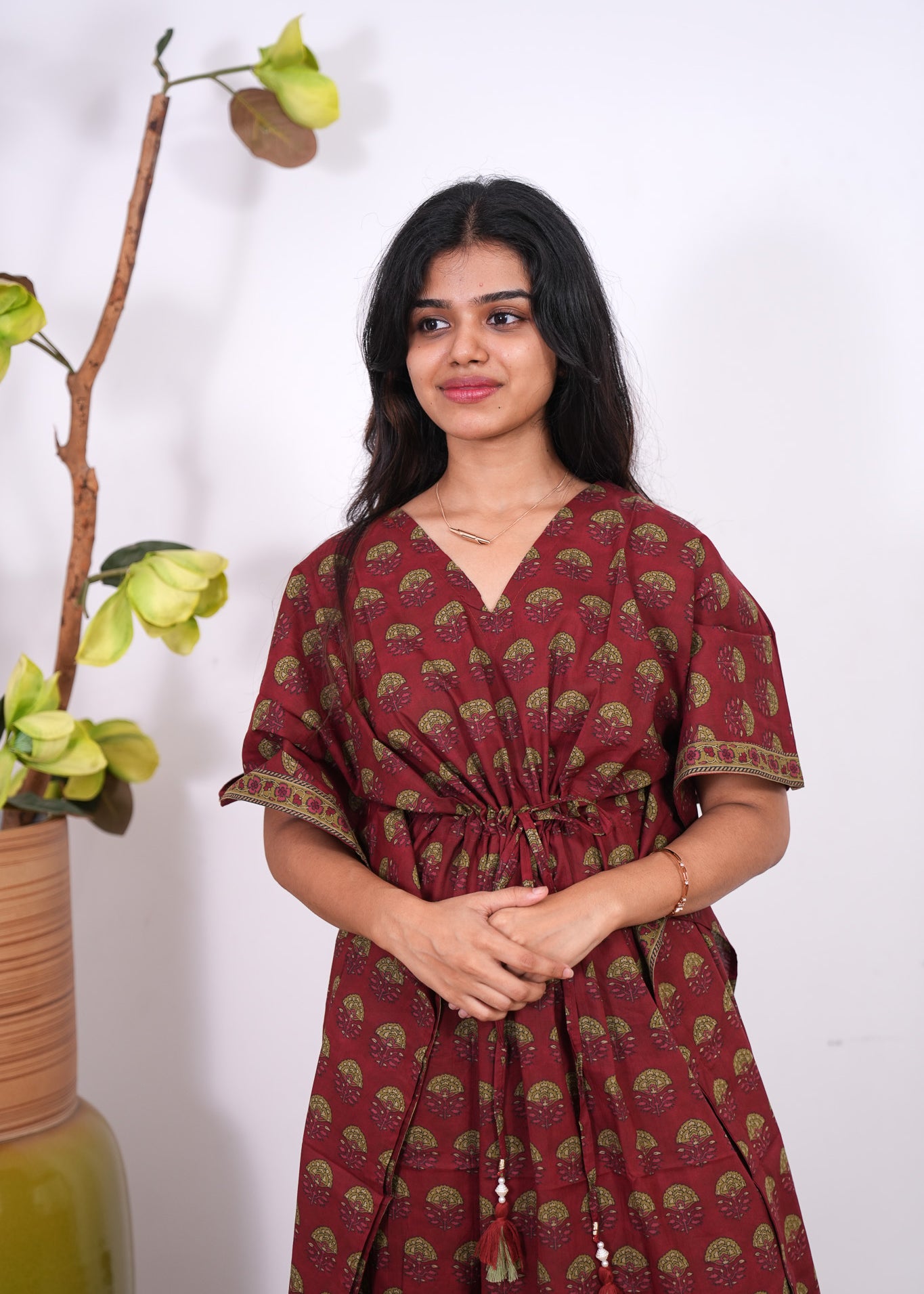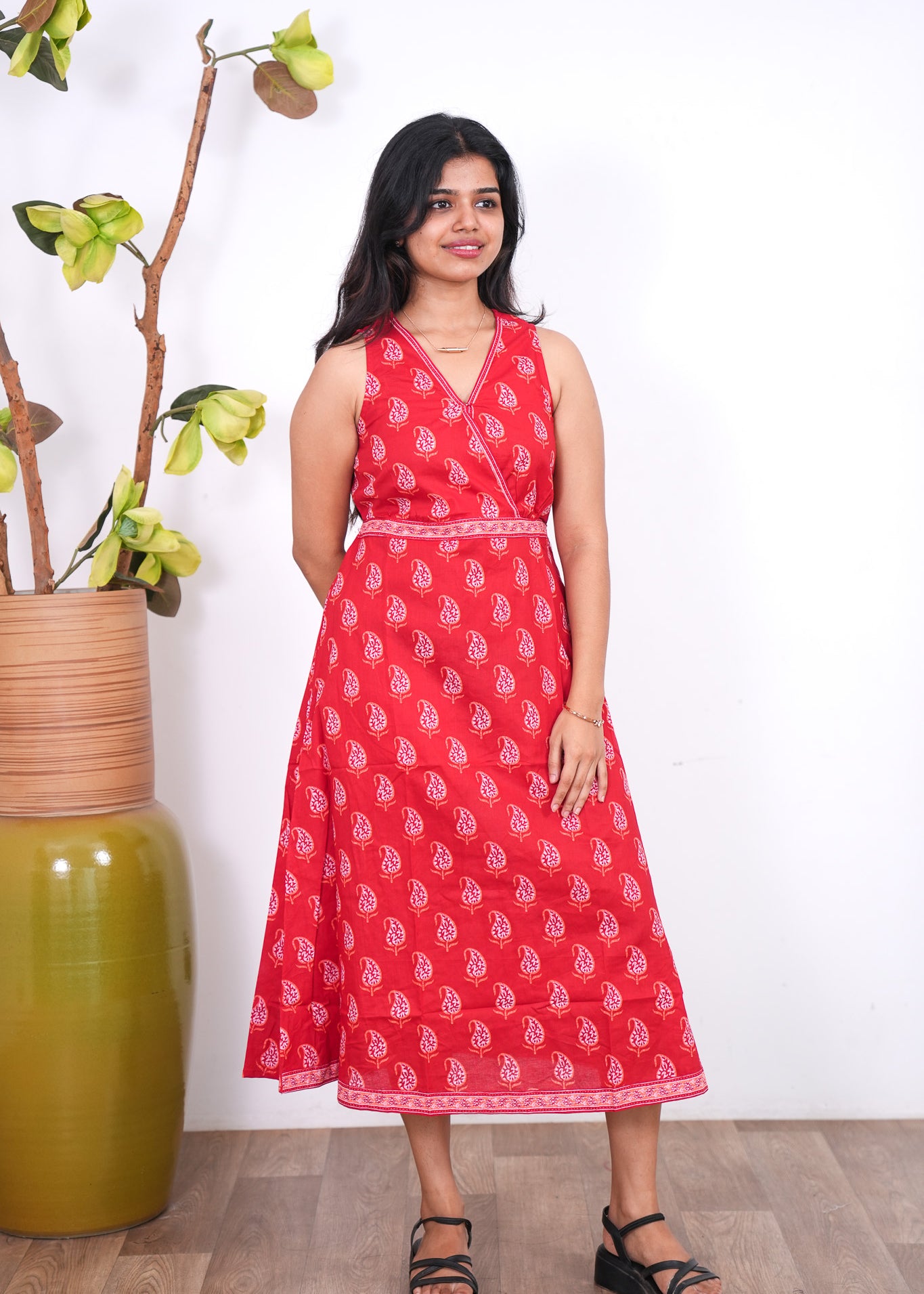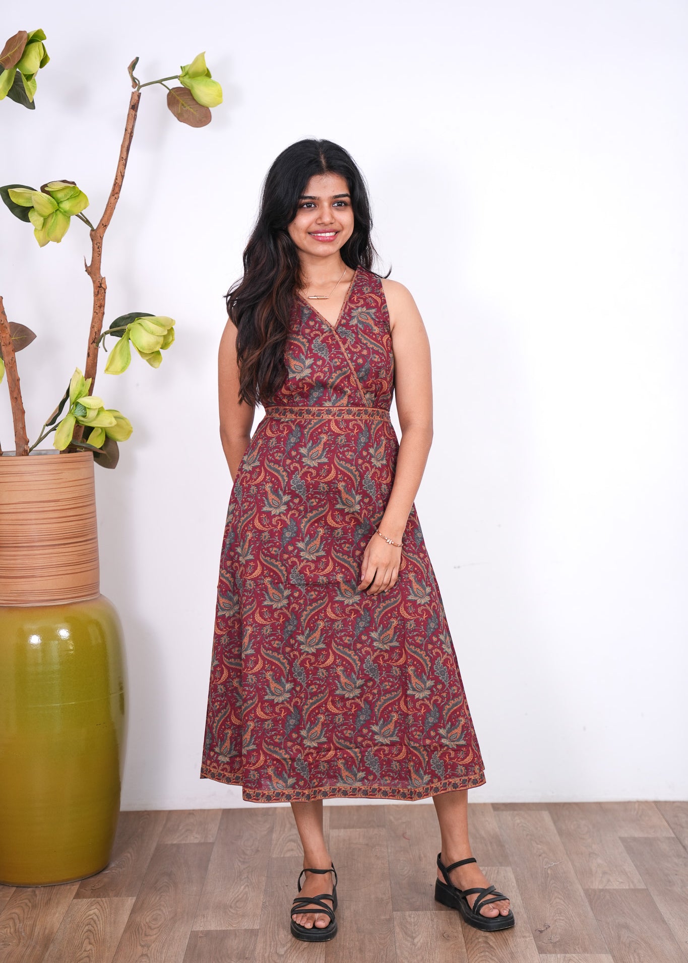 Ira cotton v neck gathered dress -Deep red(attached sleeves)