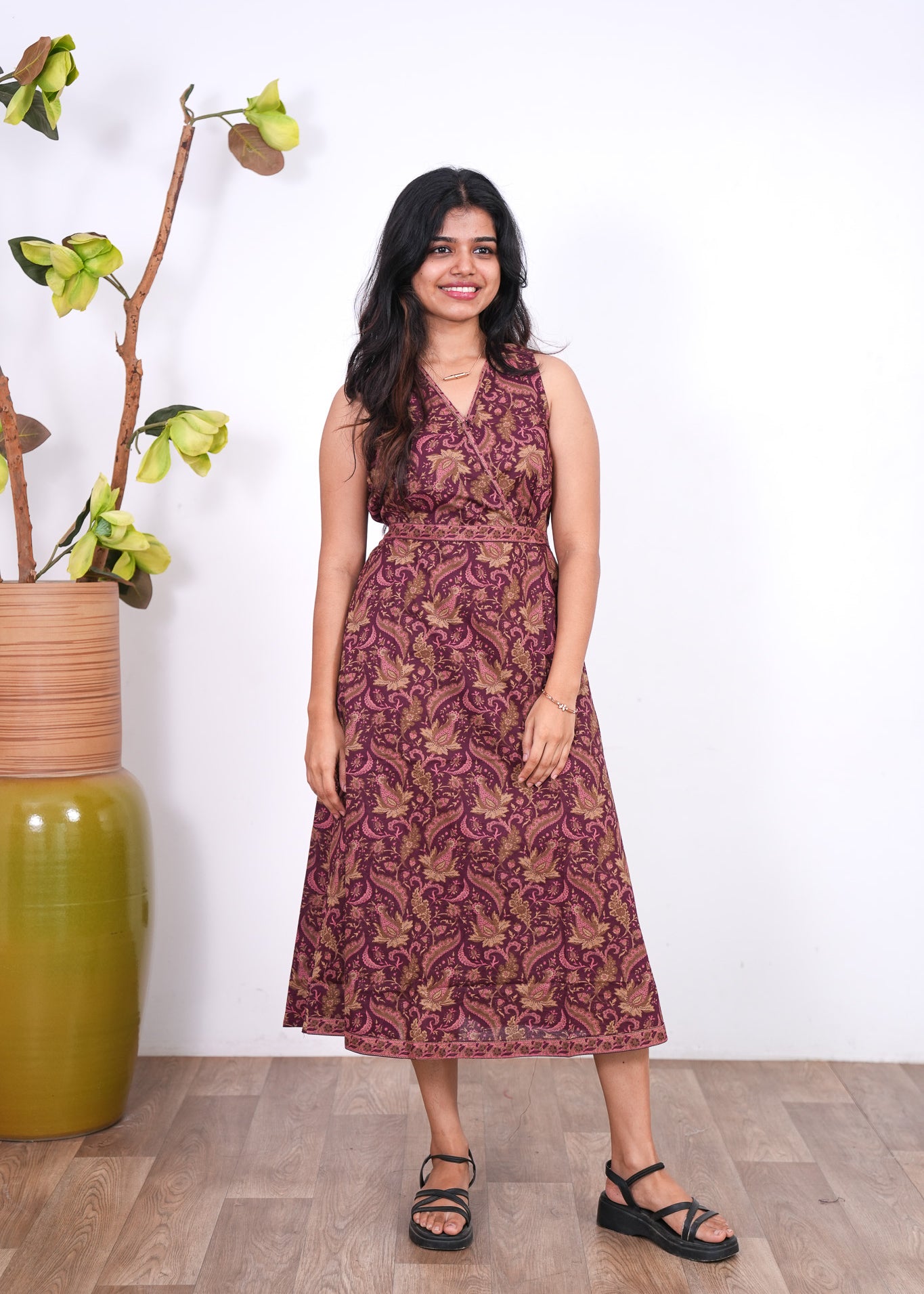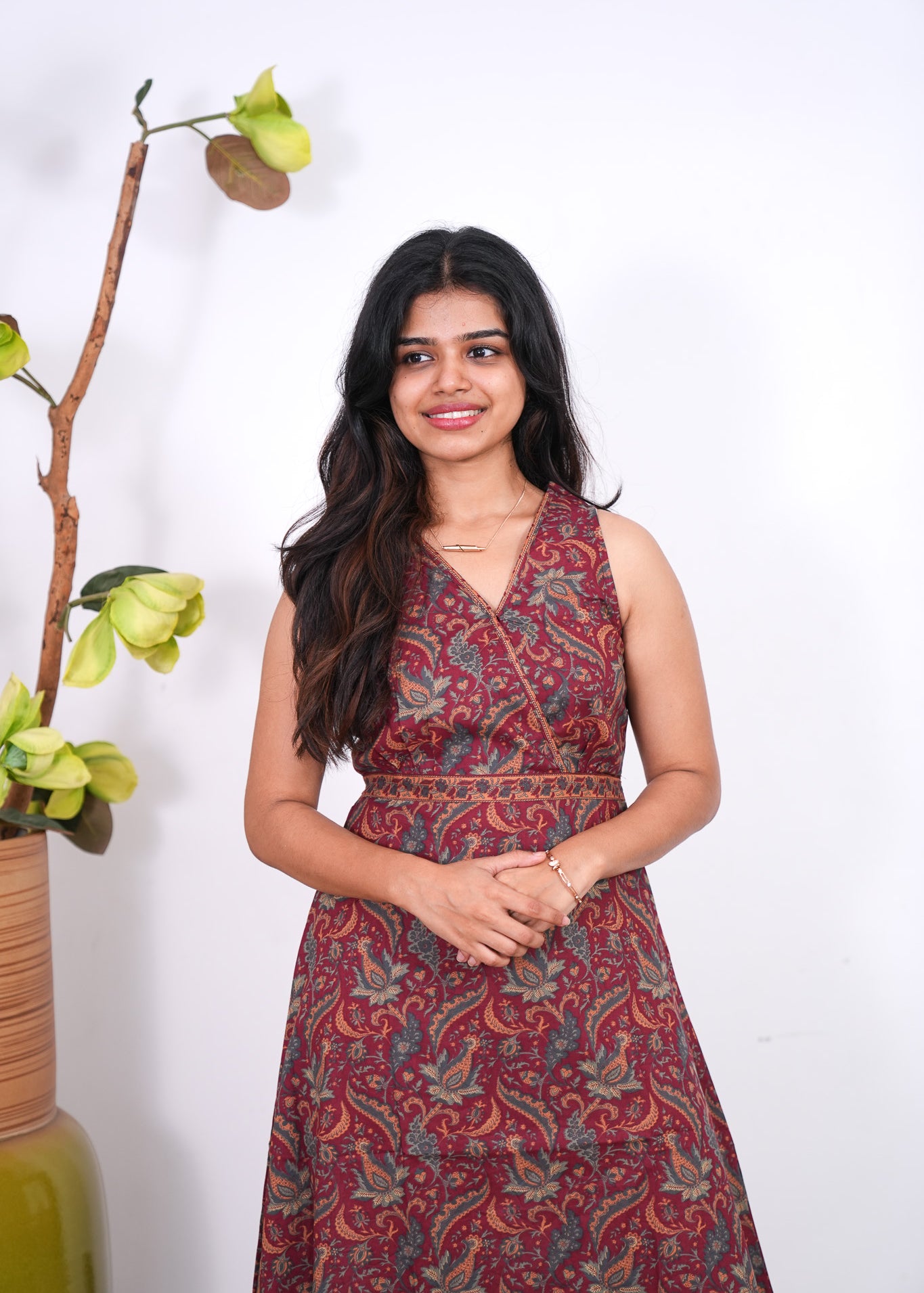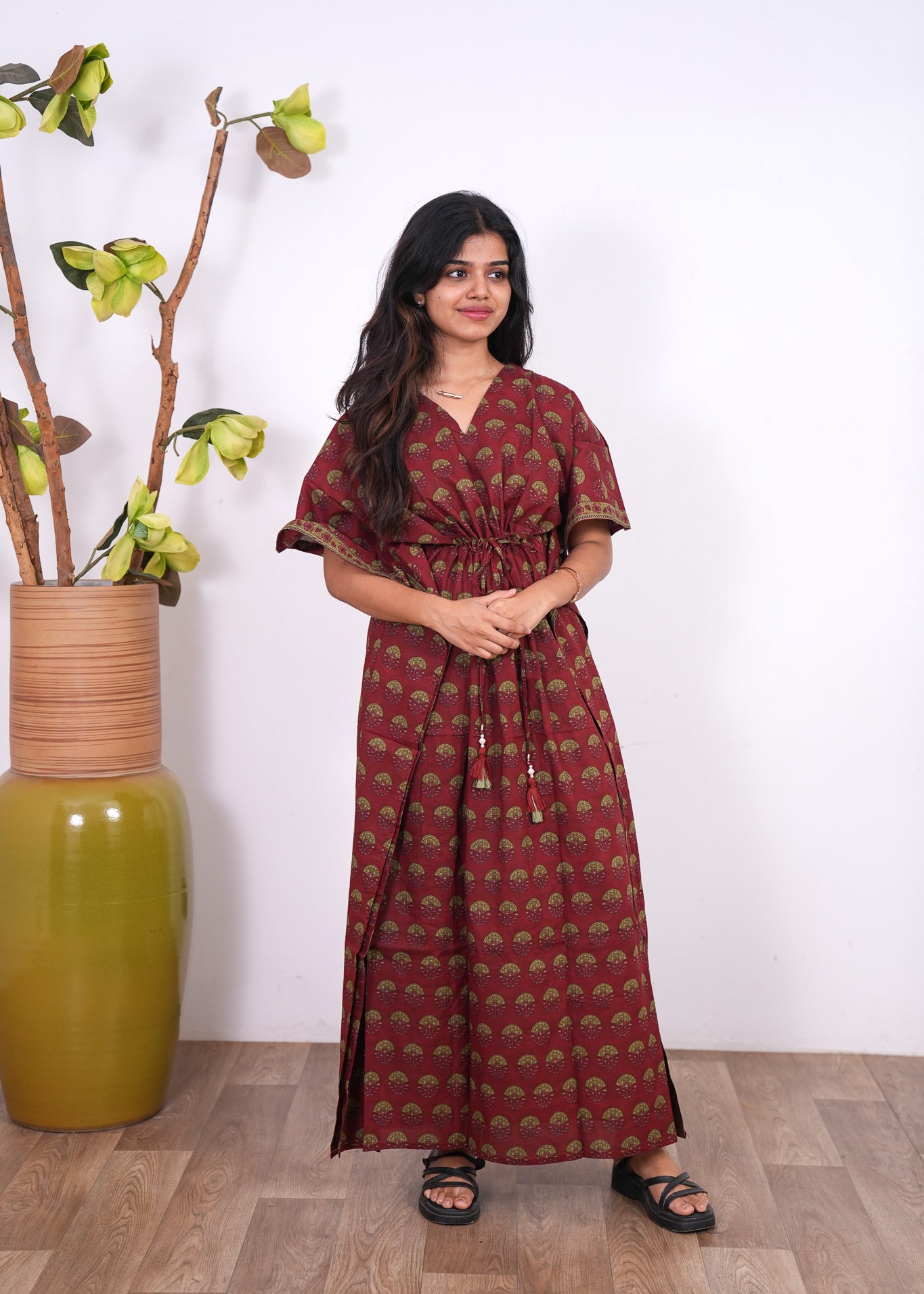 Ira cotton v neck gathered dress -Deep red(attached sleeves)