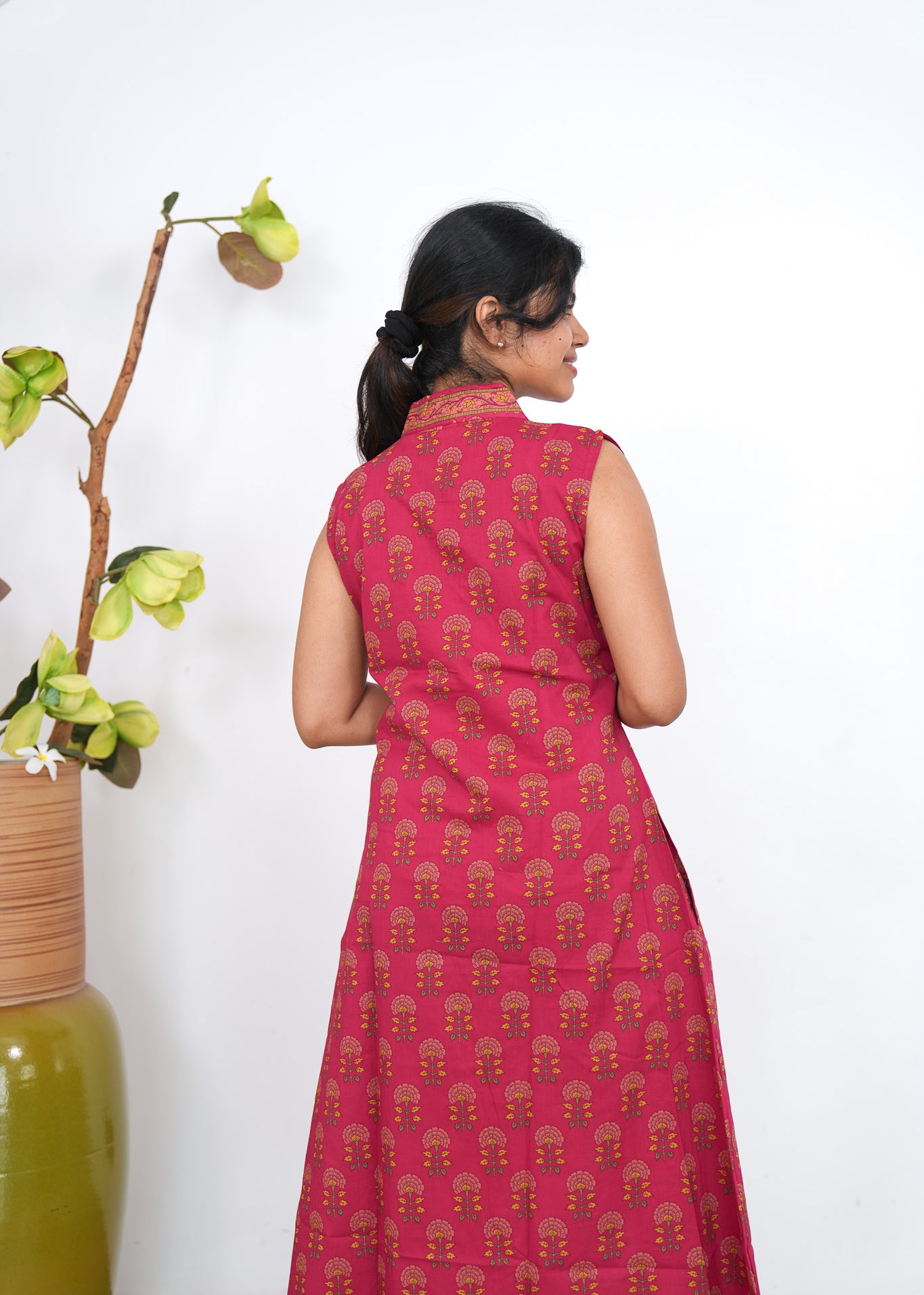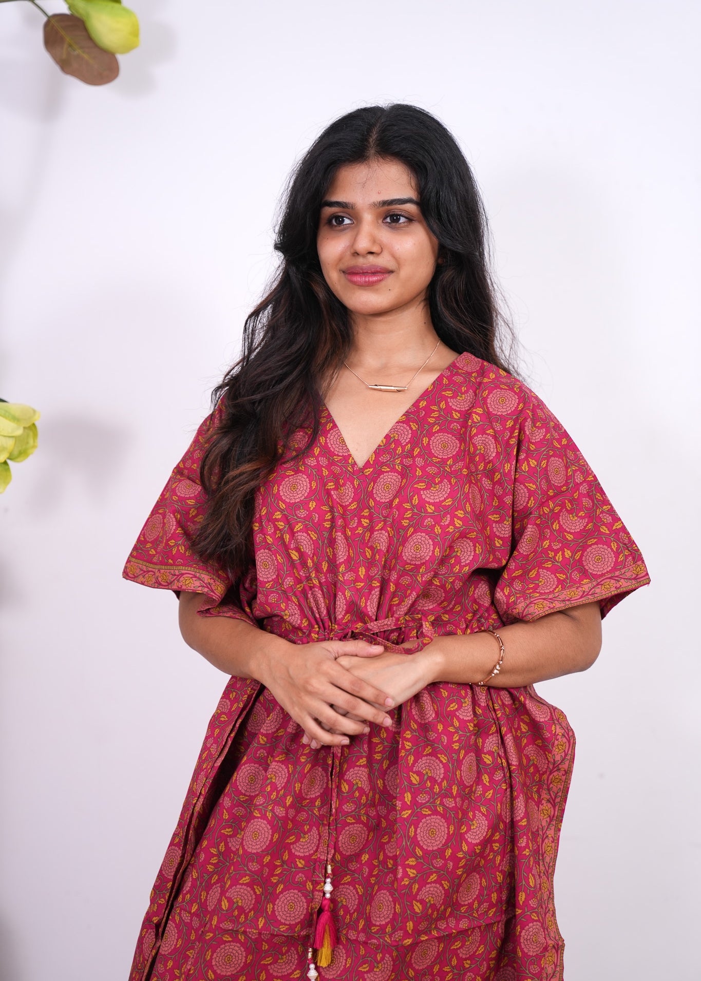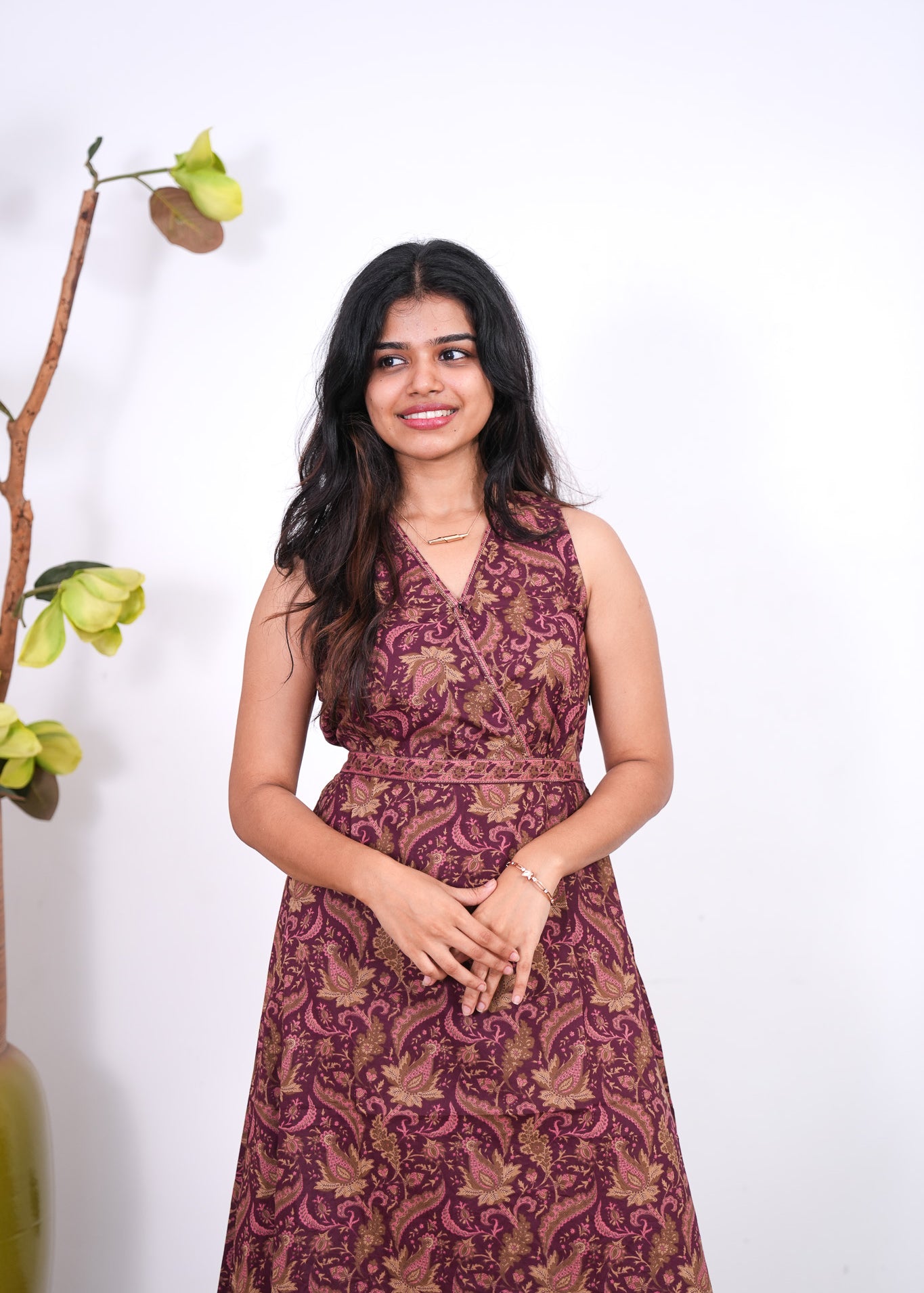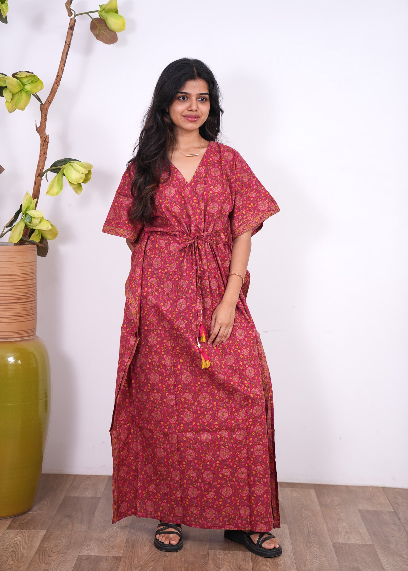Ira cotton v neck gathered dress -Deep red(attached sleeves)