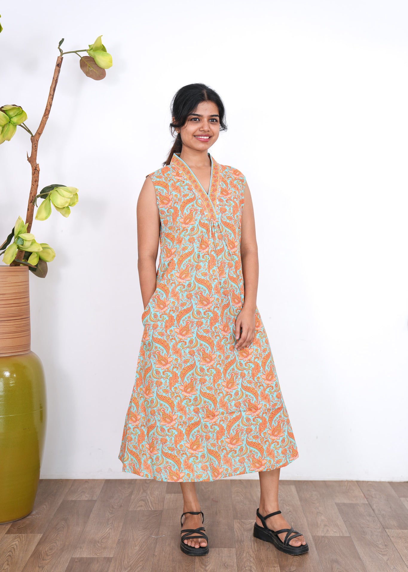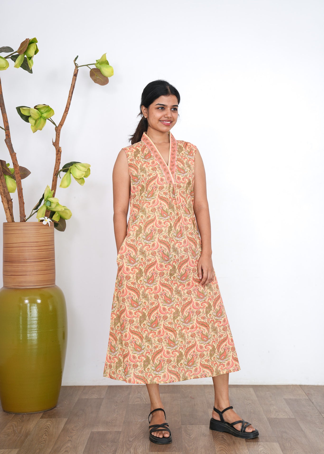 Ira cotton v neck gathered dress -Peach(attached sleeves)