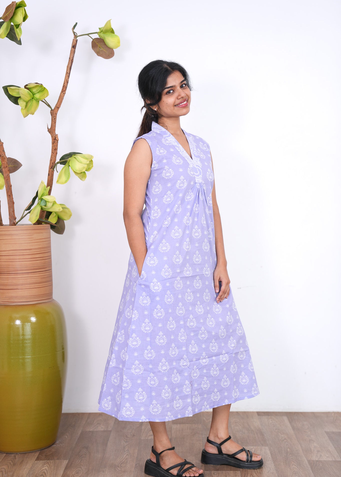 Ira cotton v neck gathered dress -Lavender(attached sleeves)