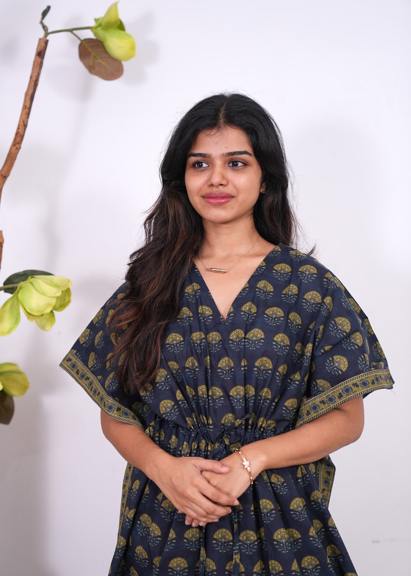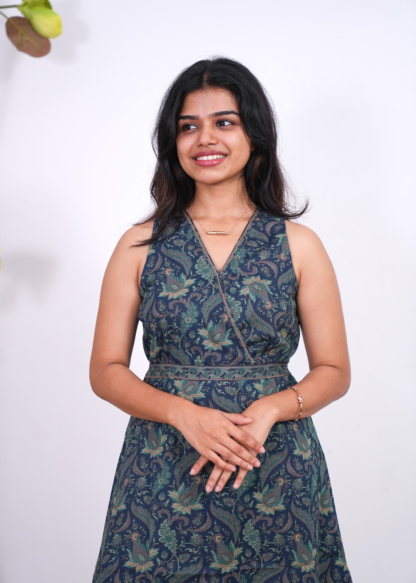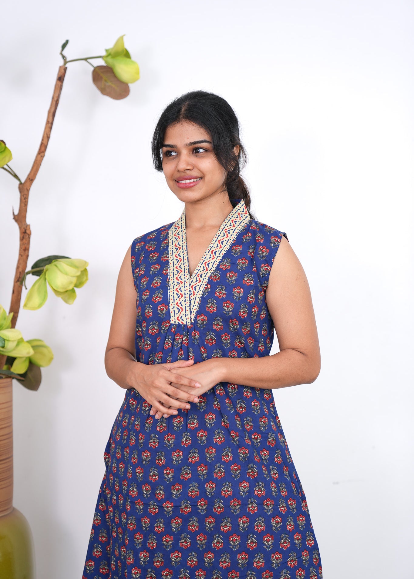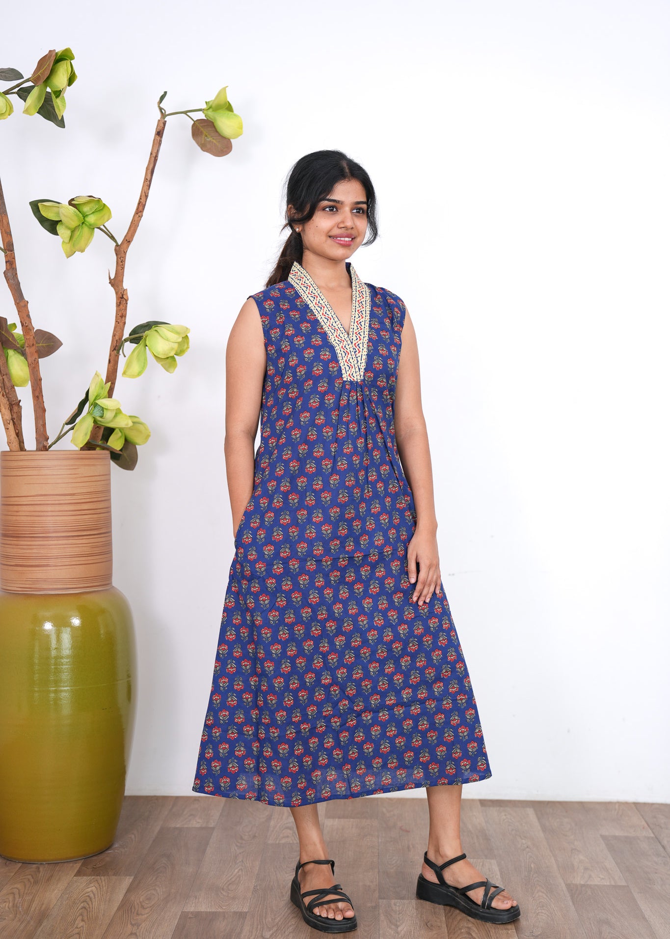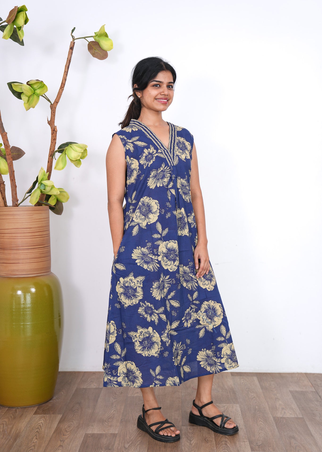 Ira cotton v neck gathered dress -Indigo(attached sleeves)