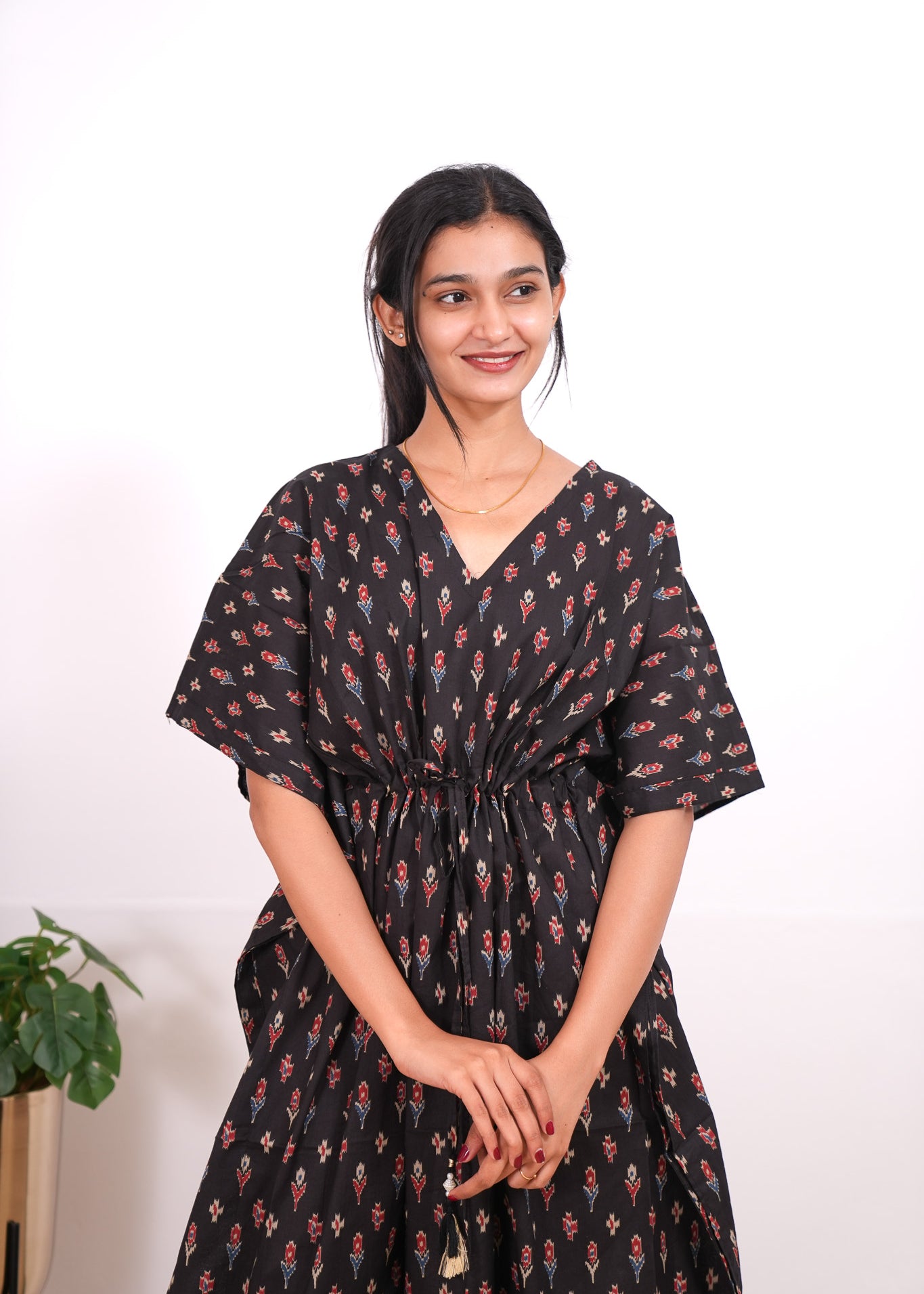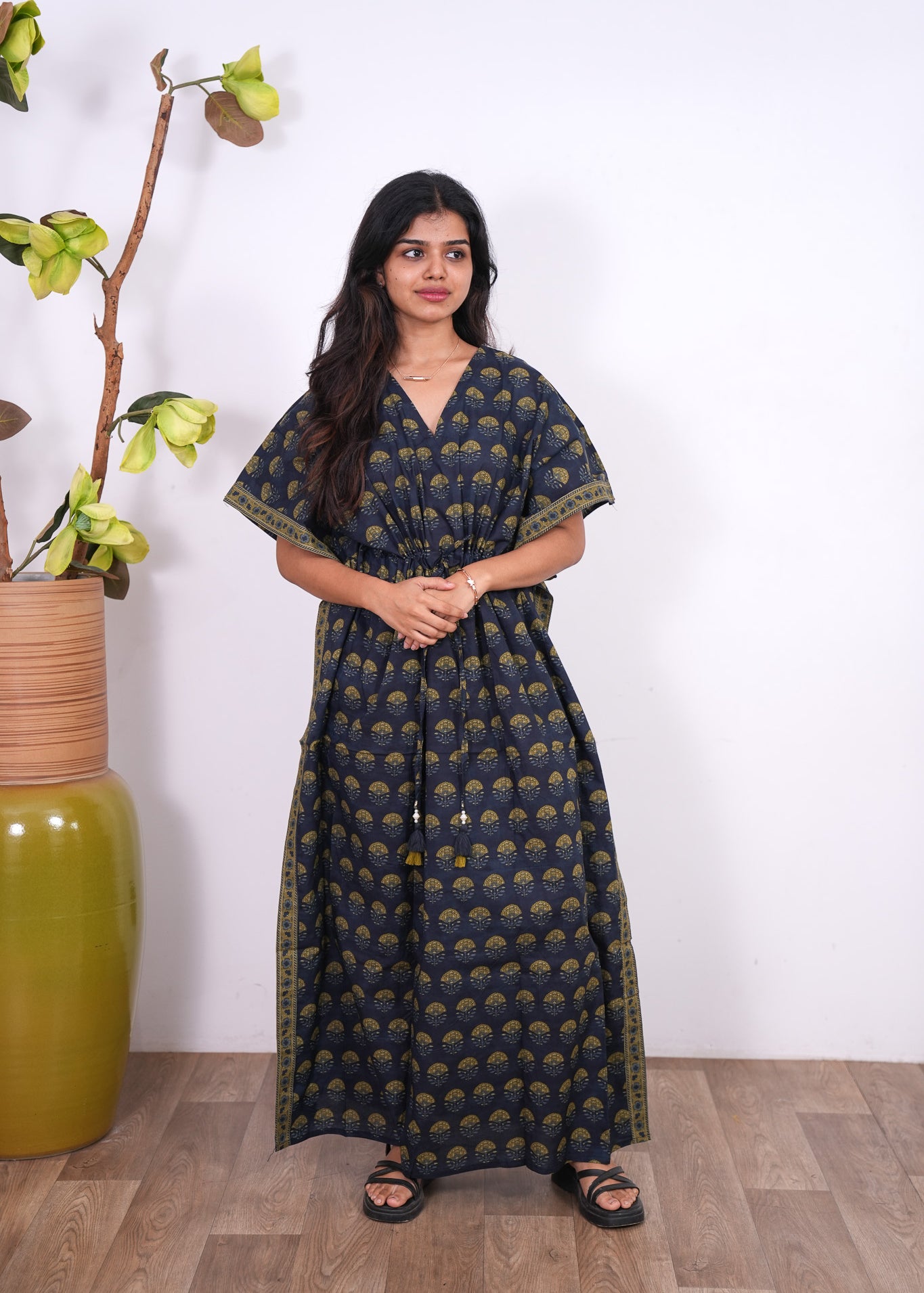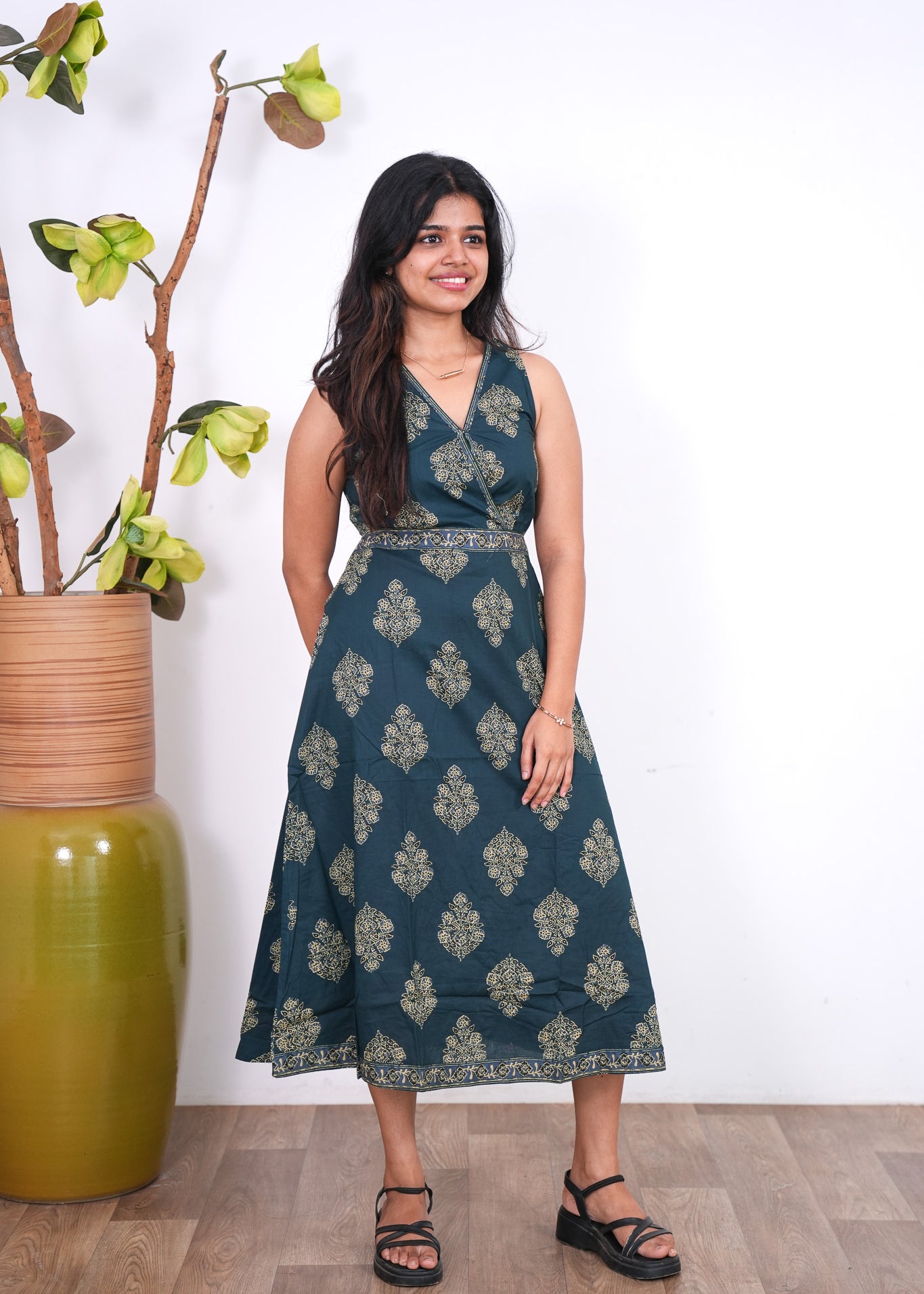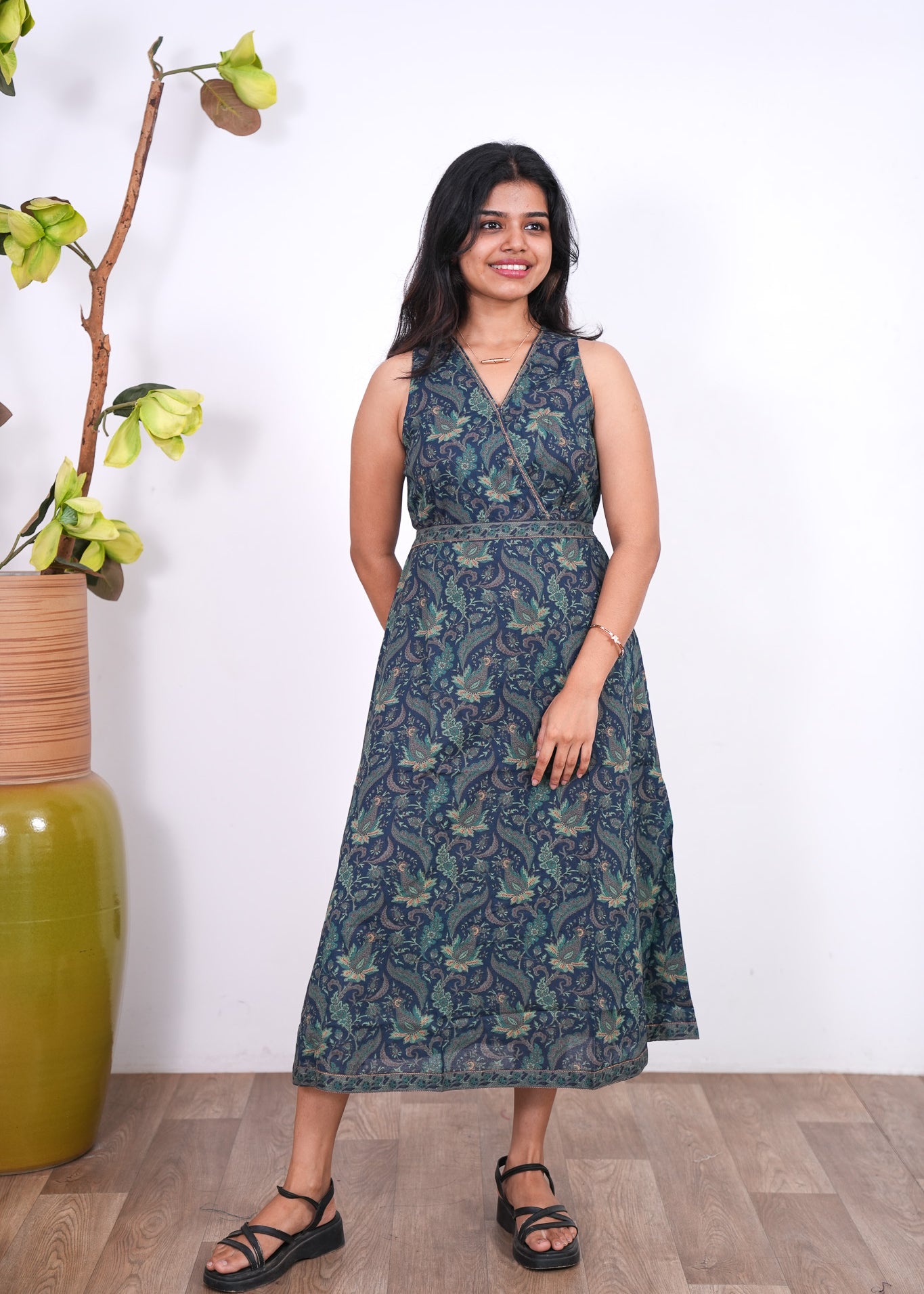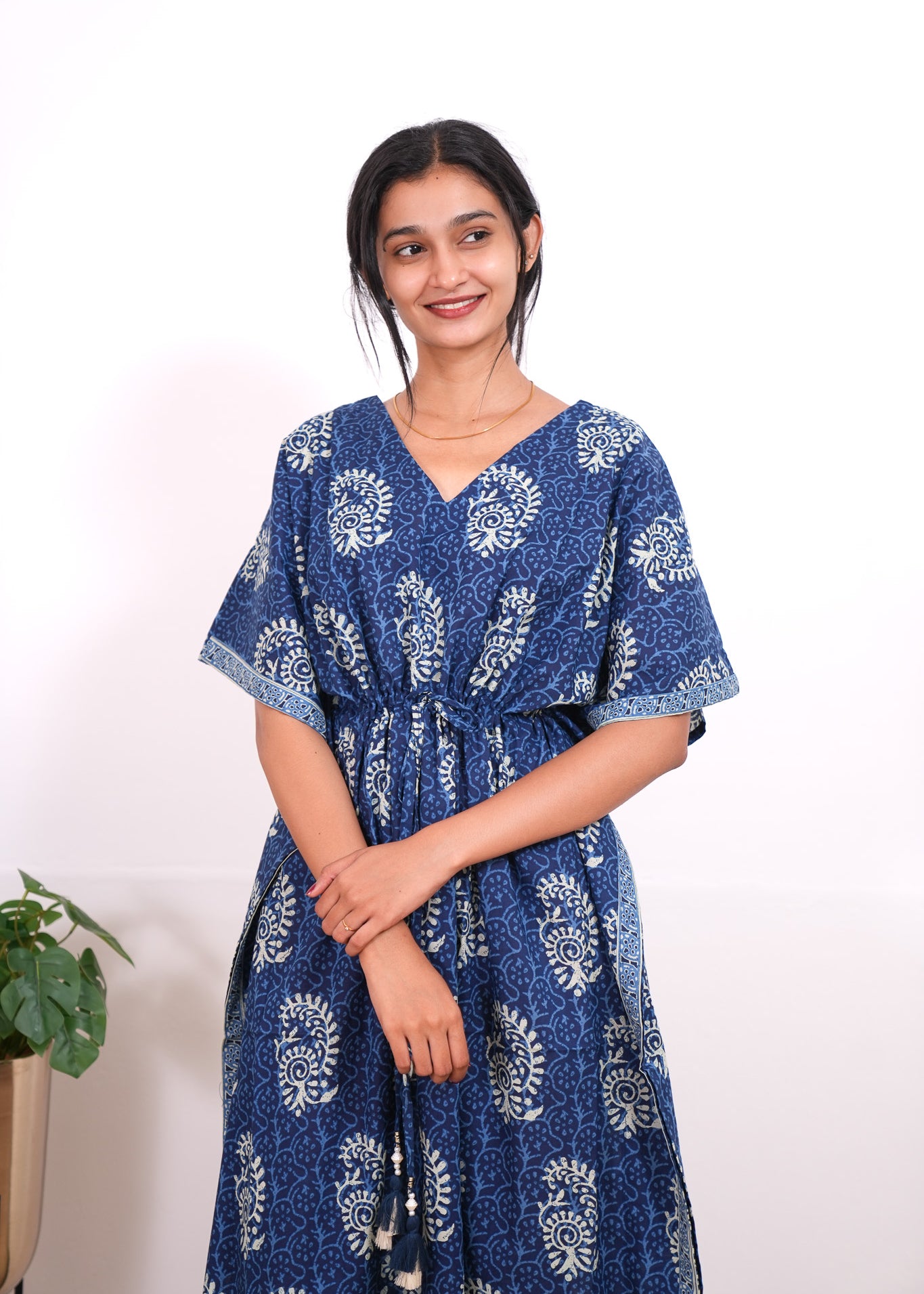 Ira cotton v neck gathered dress -Indigo(attached sleeves)