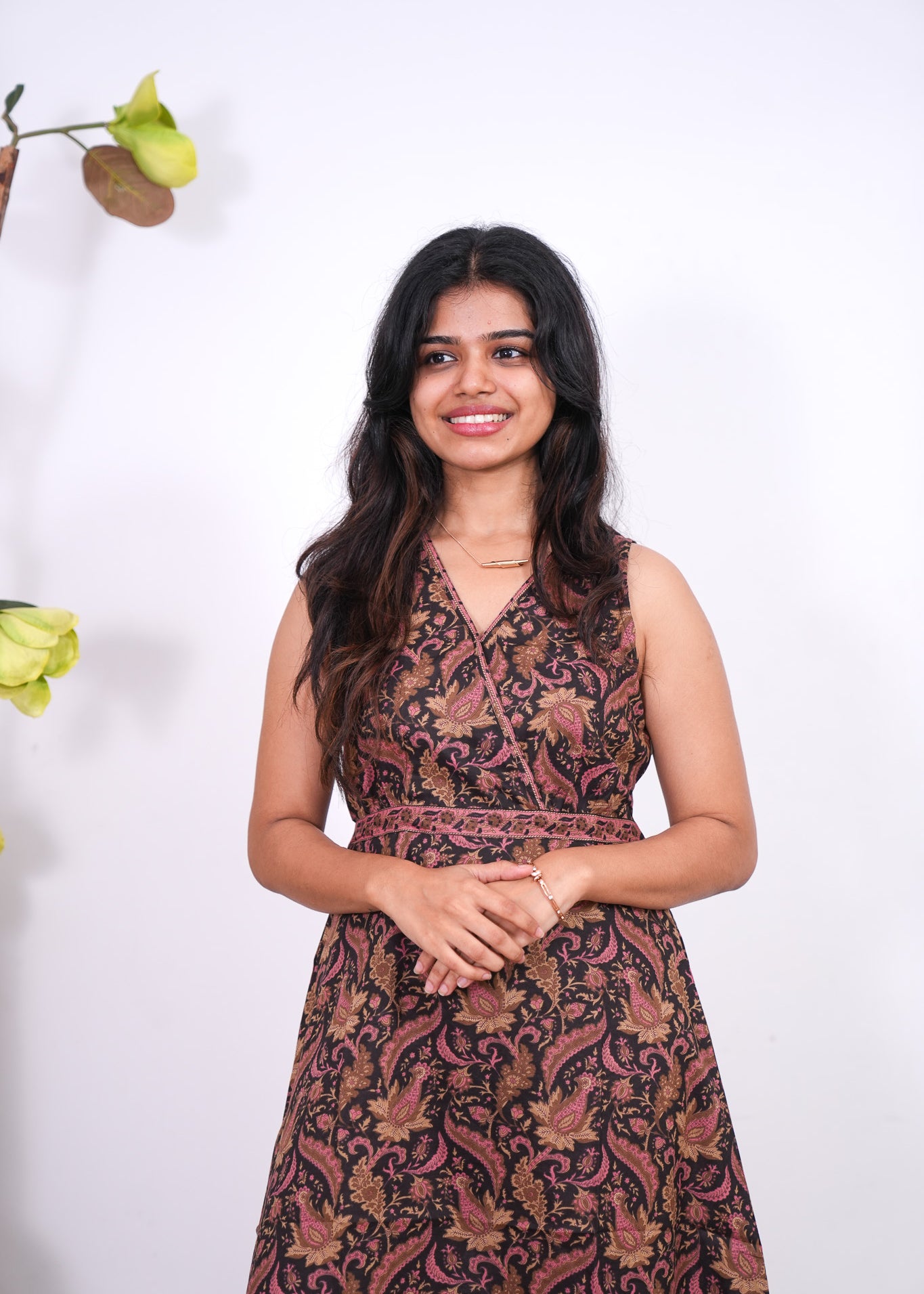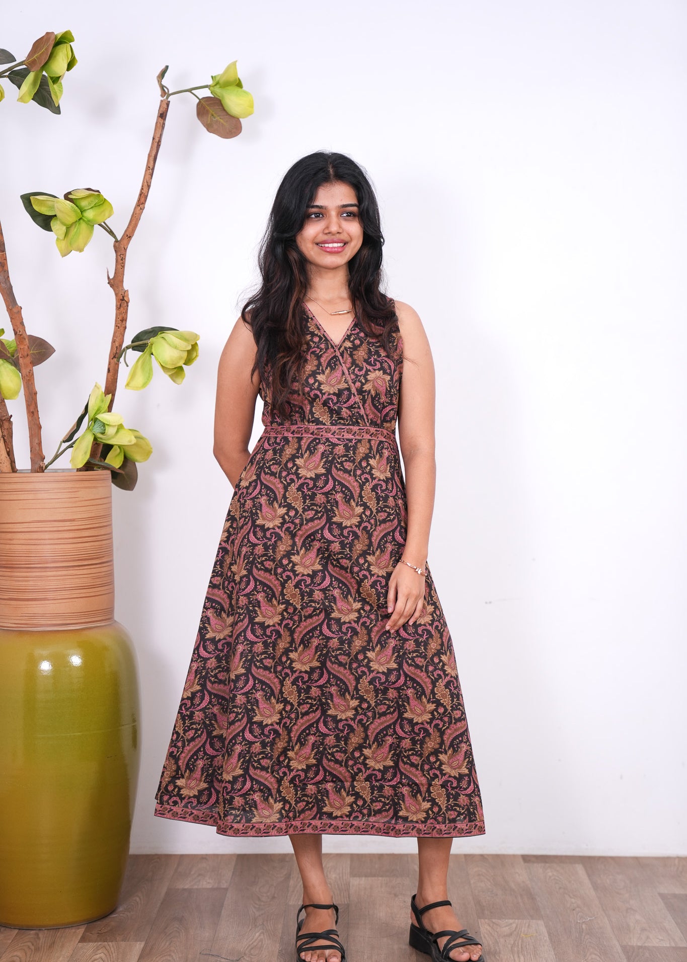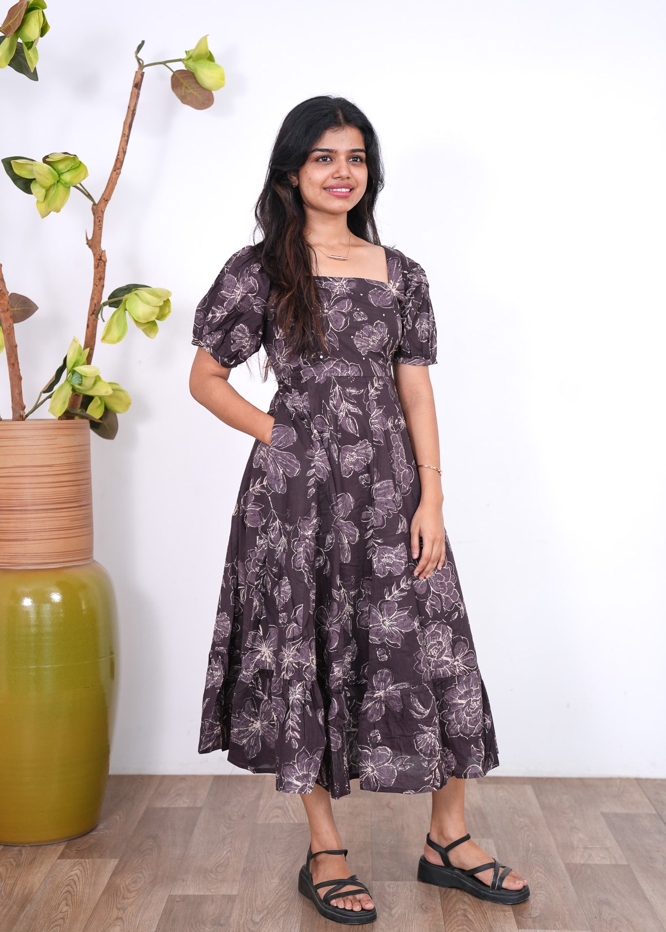Ira cotton v neck gathered dress -Caramel(attached sleeves)