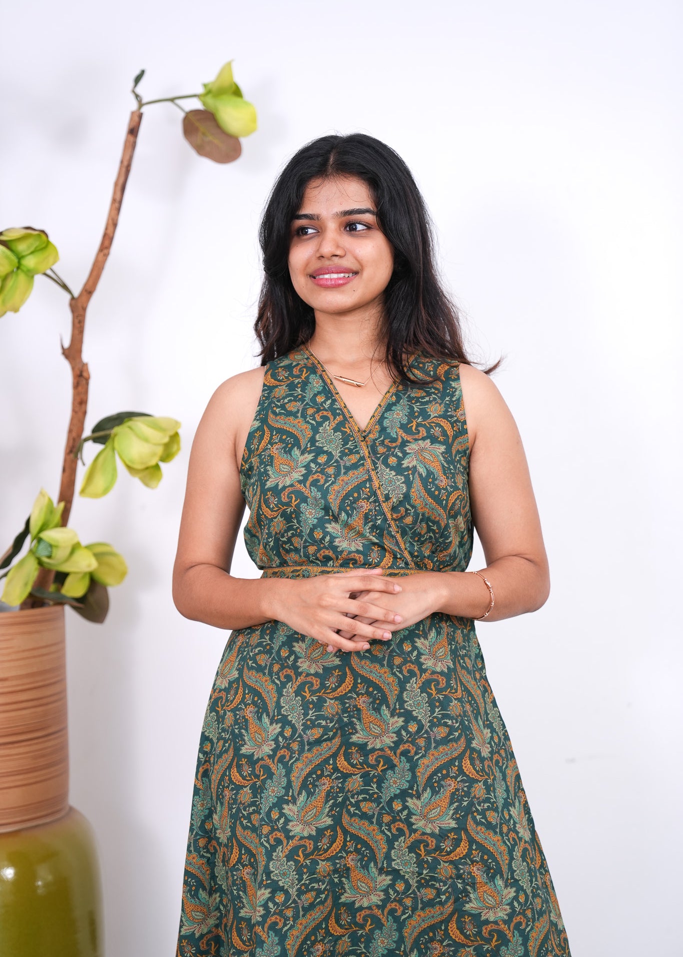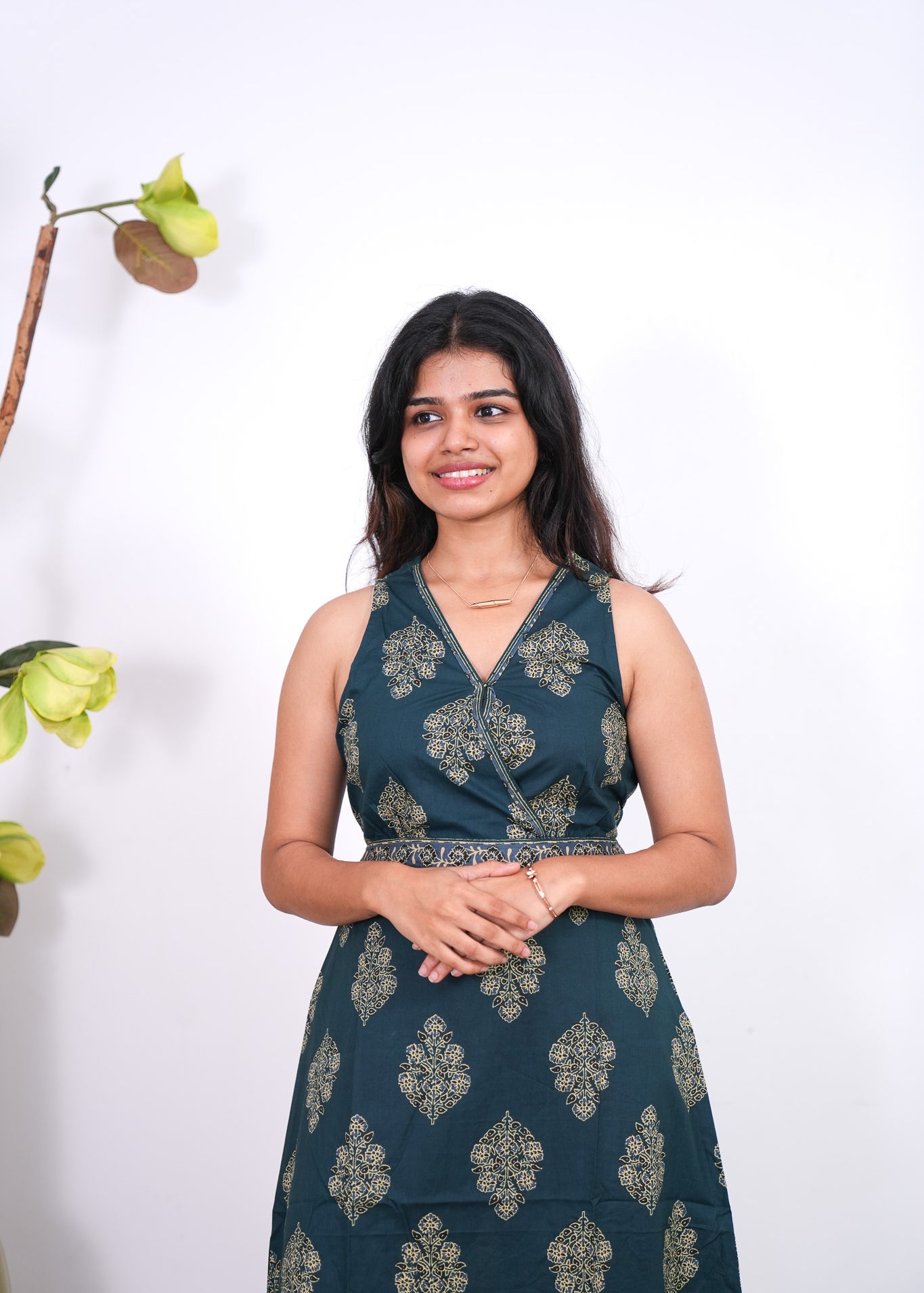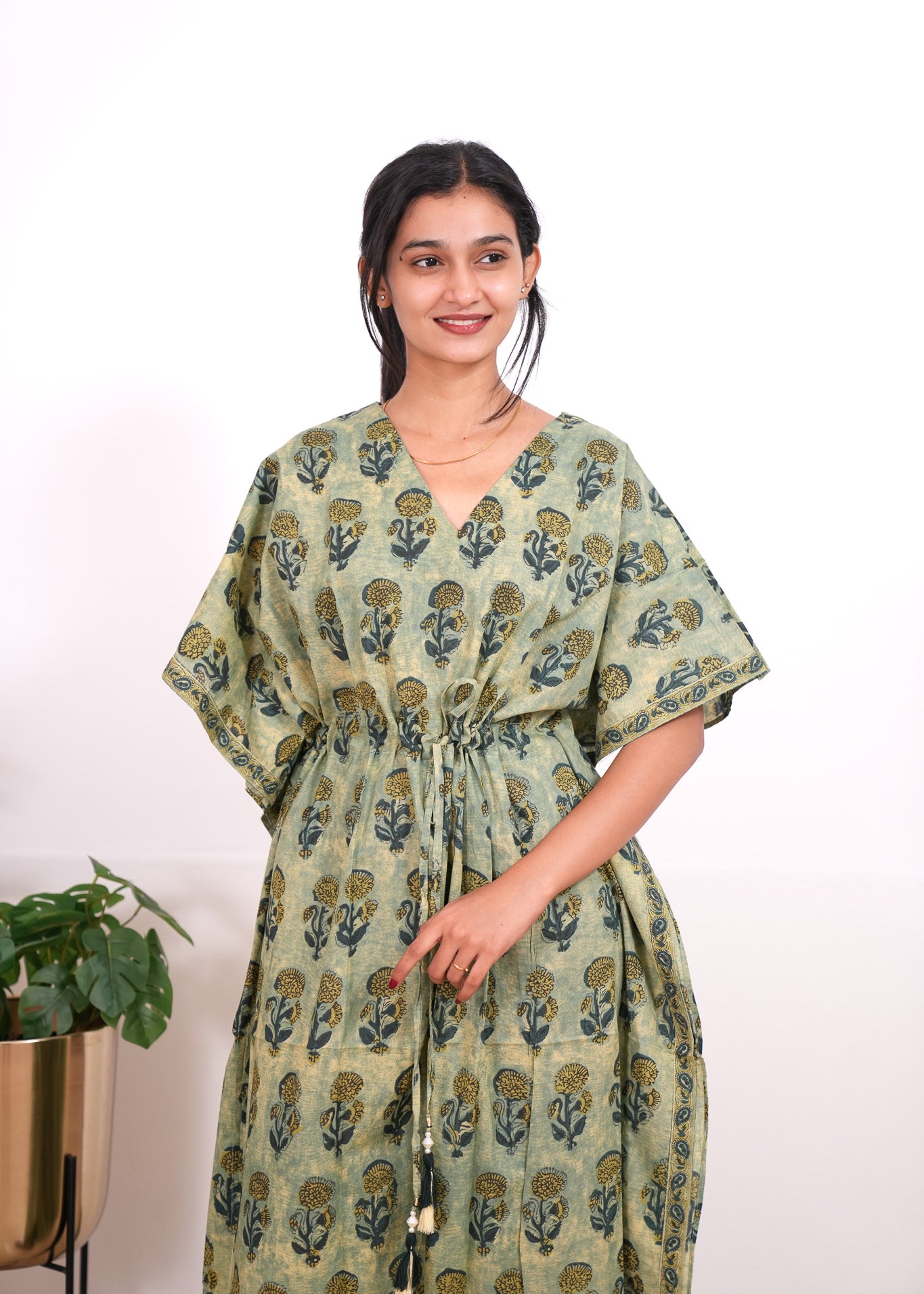 Ira cotton v neck gathered dress -Sea green(attached sleeves)