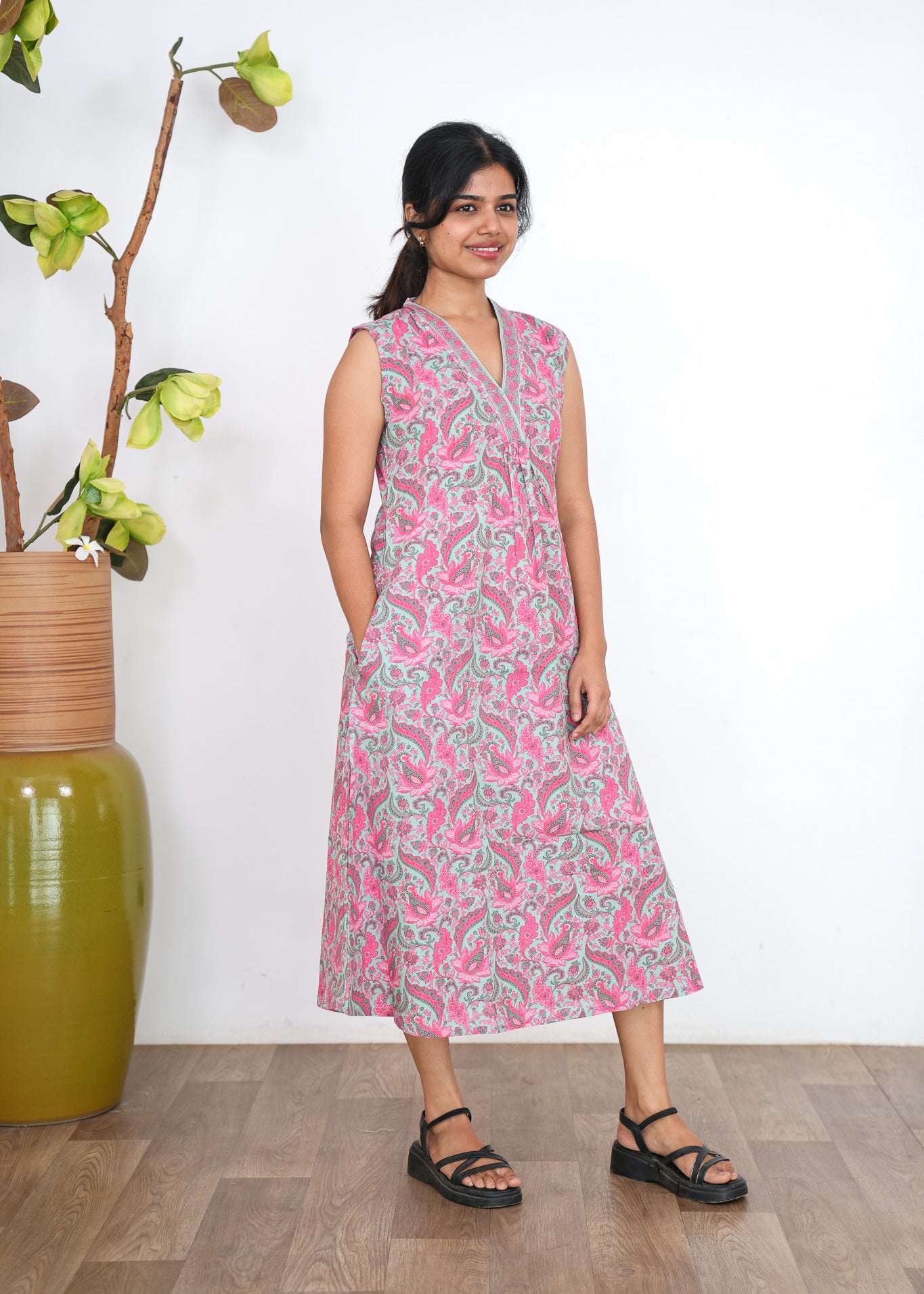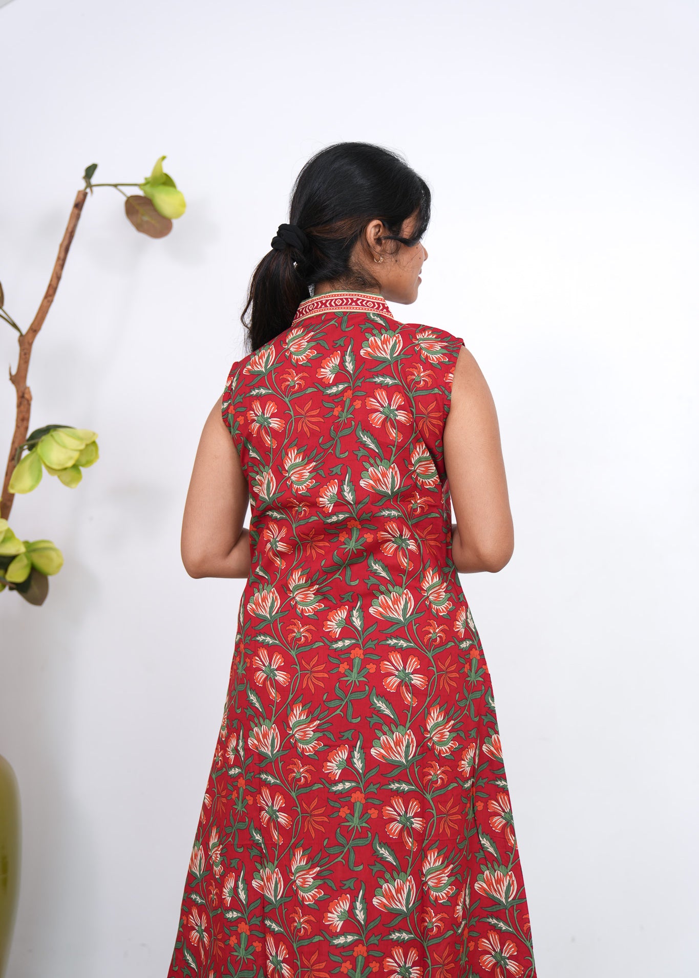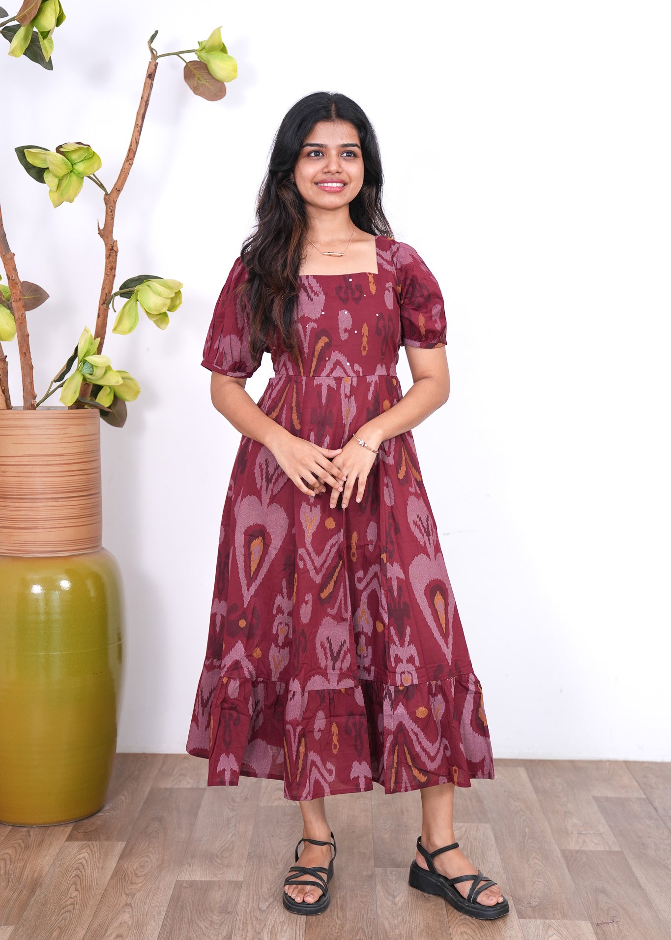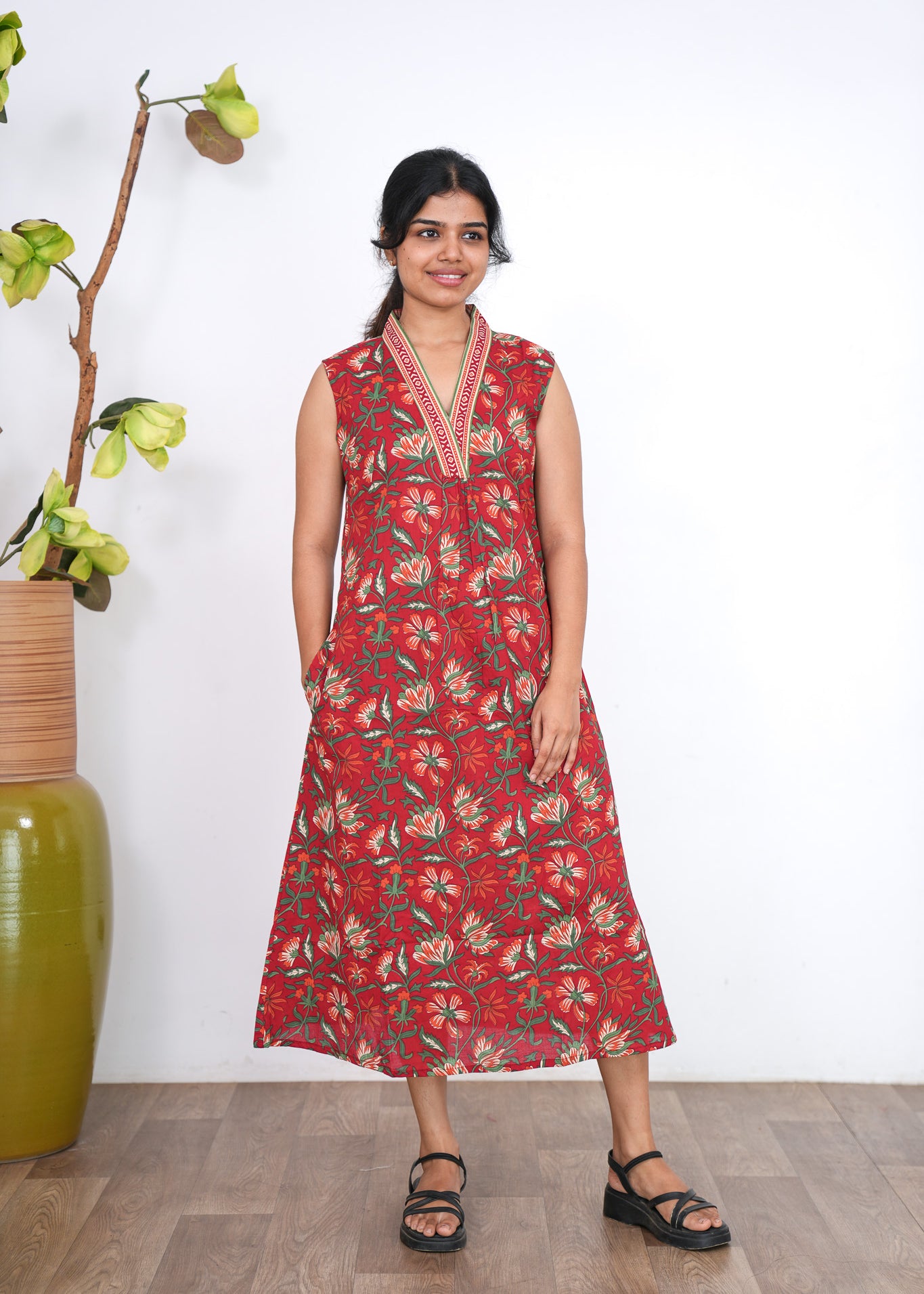Ira cotton v neck gathered dress-Crimson(attached sleeves)