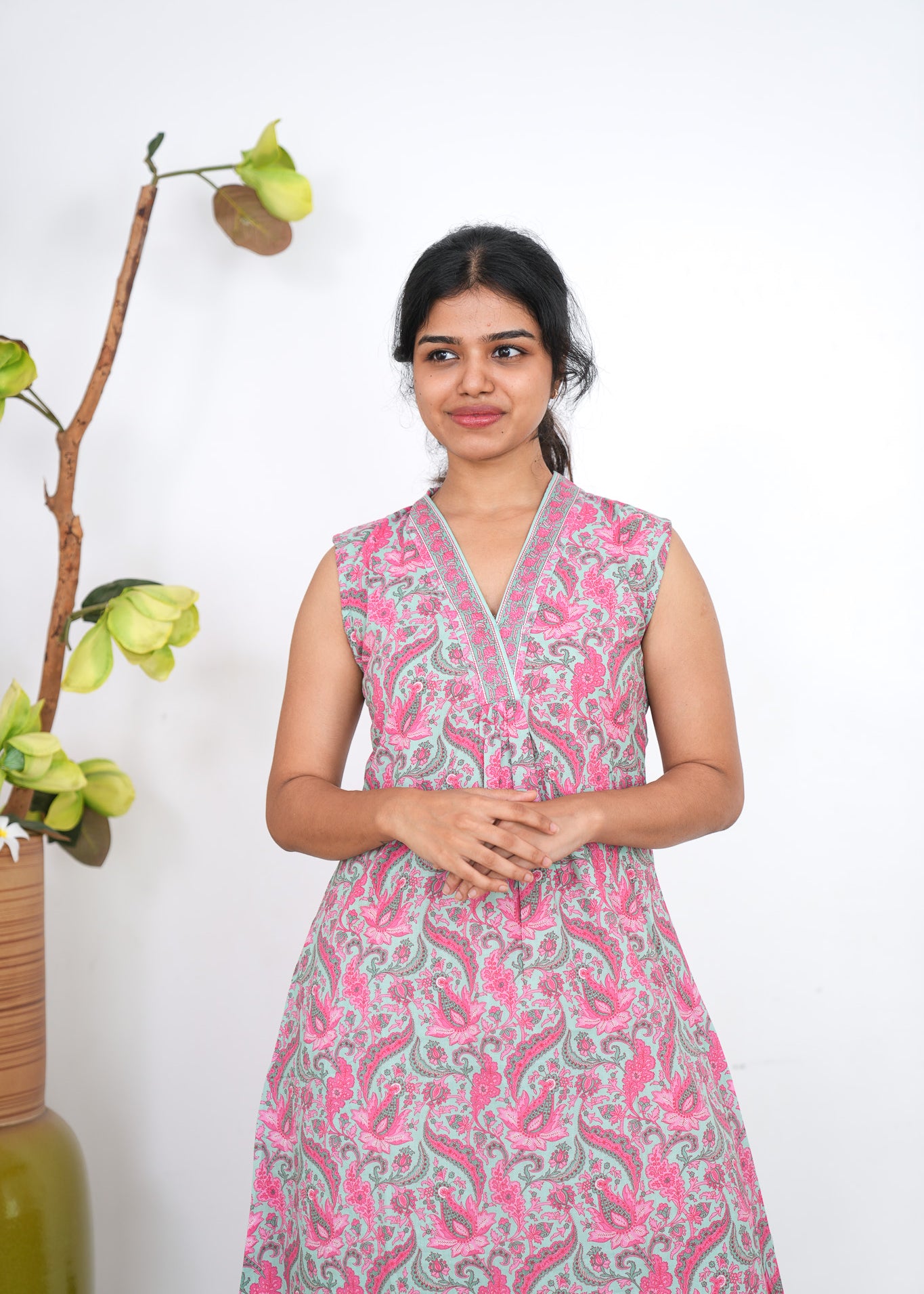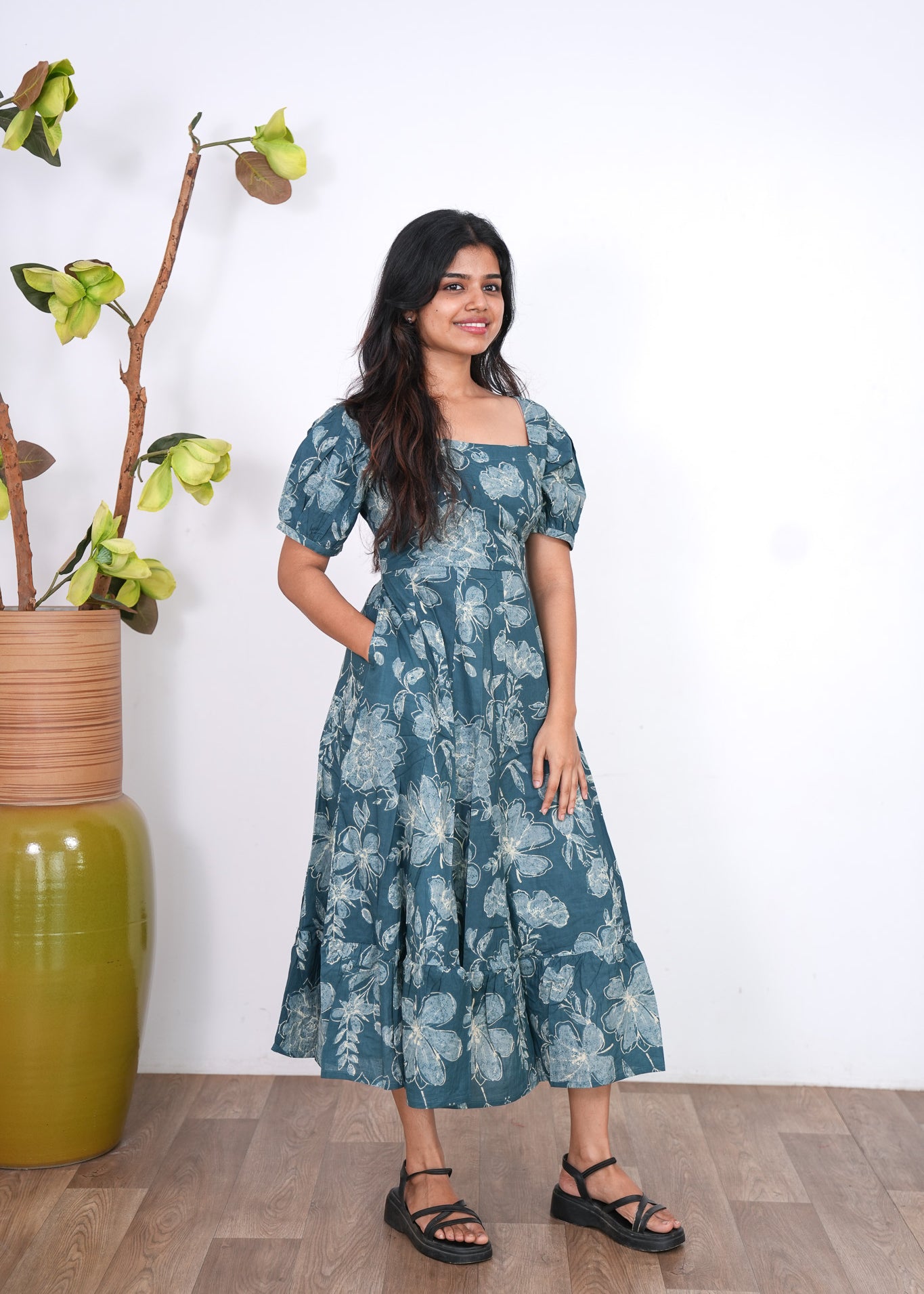 Ira cotton v neck gathered dress-Sea blue(attached sleeves)