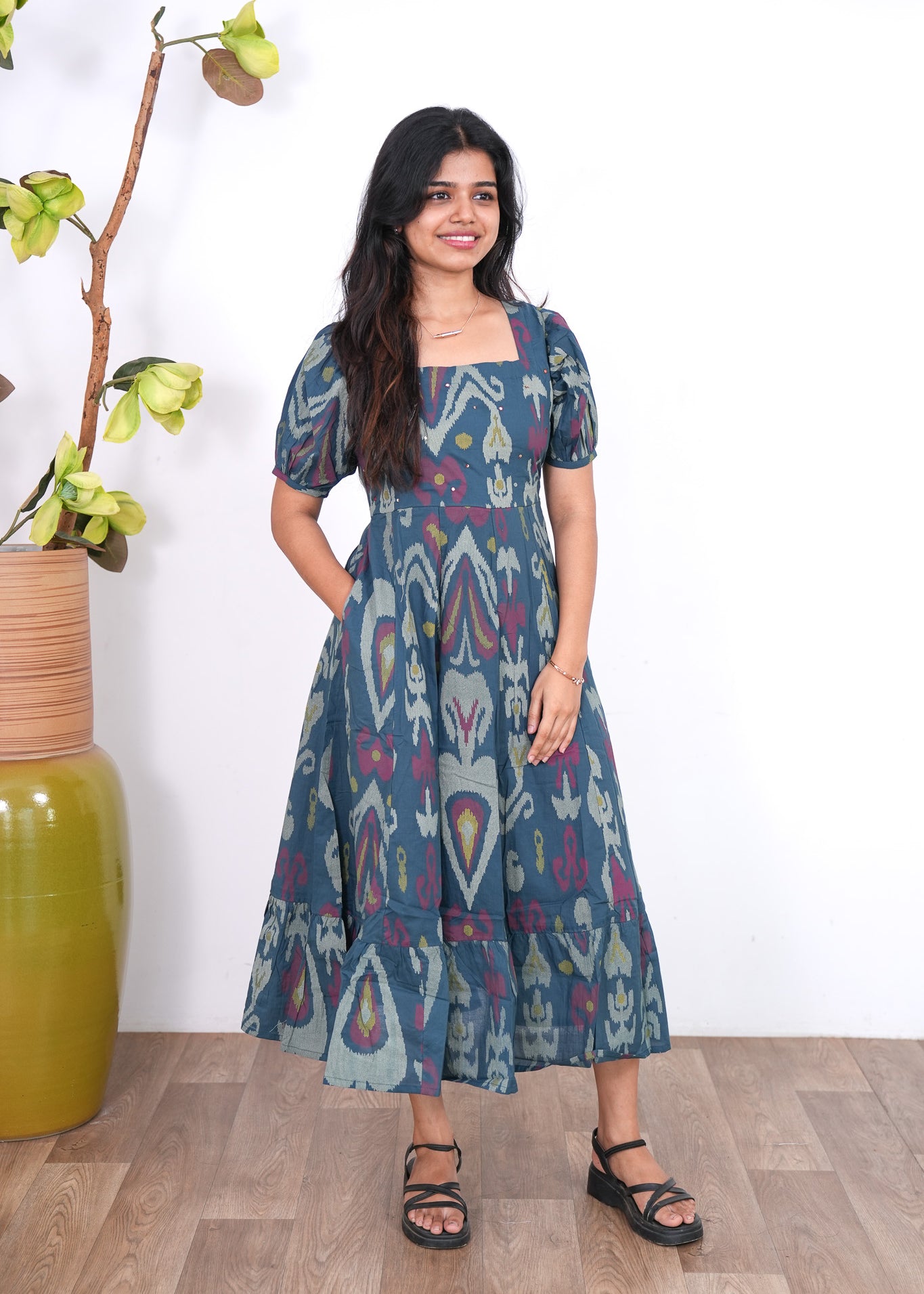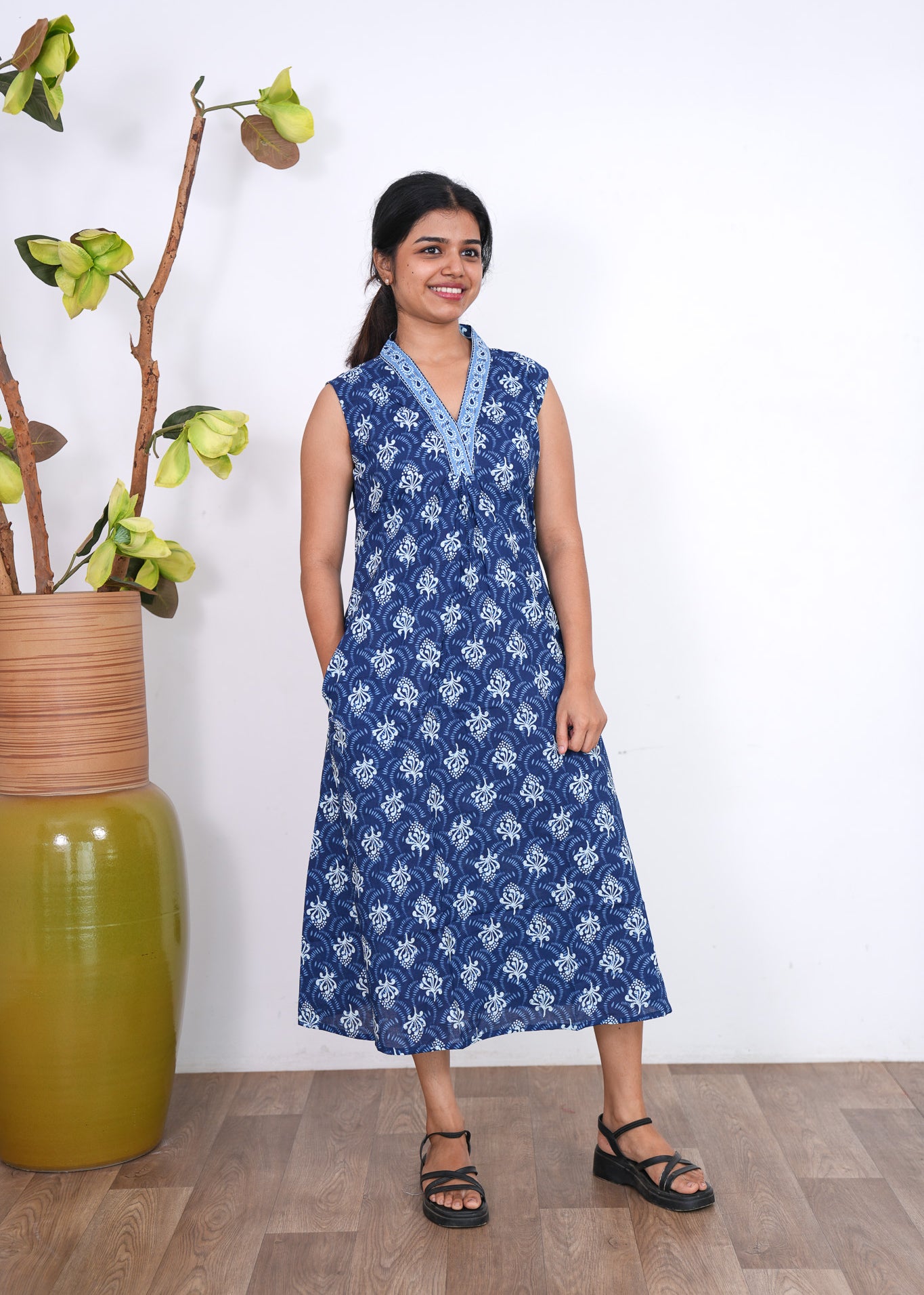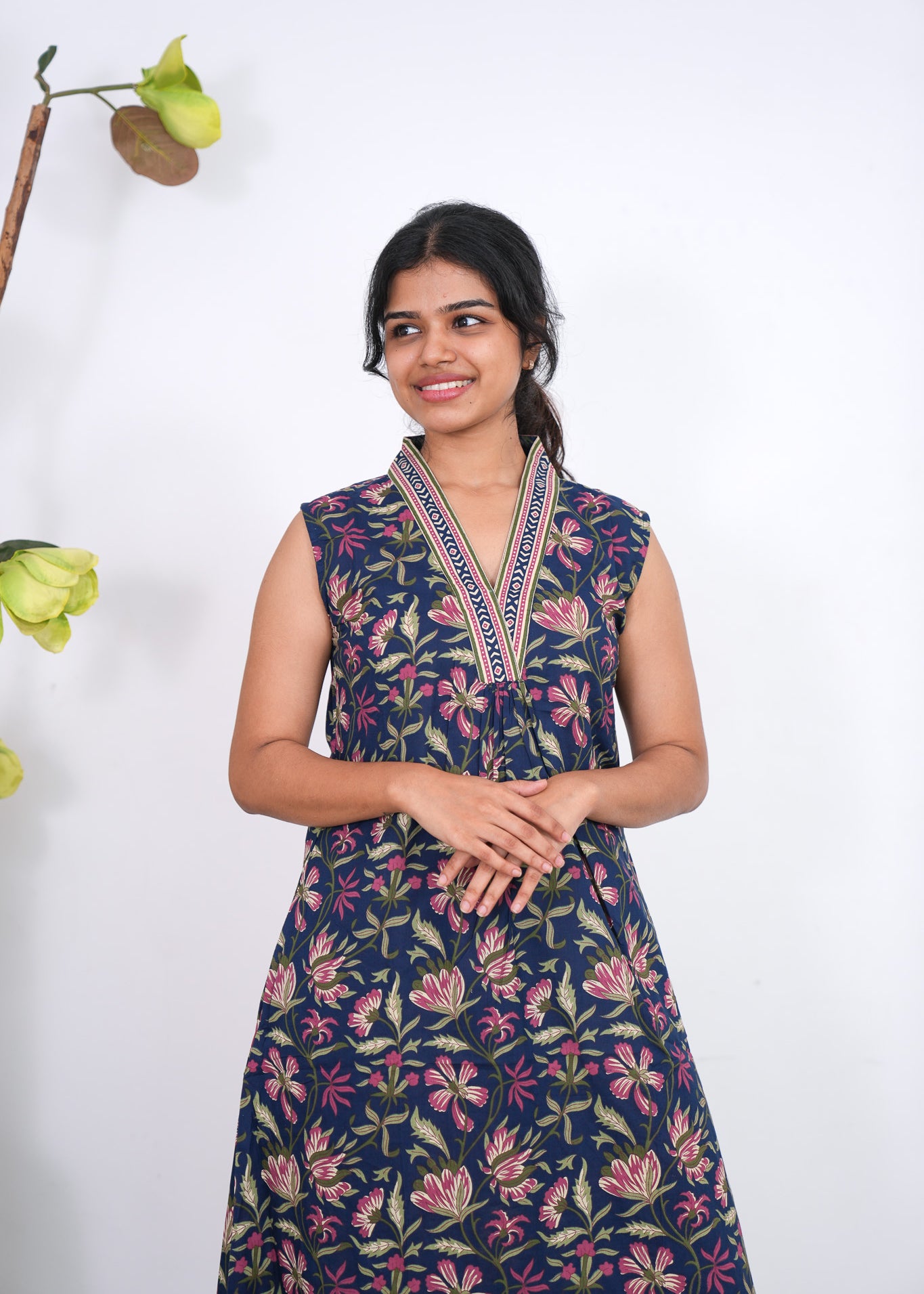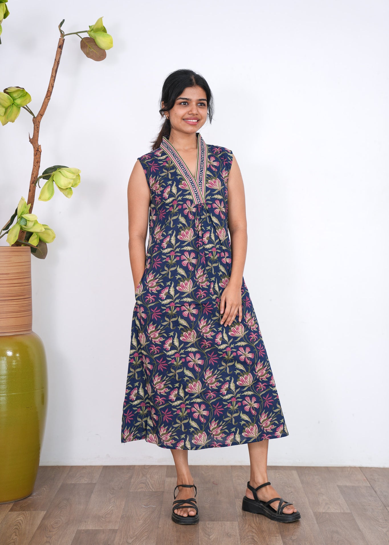 Ira cotton v neck gathered dress- Midnight blue(attached sleeves)