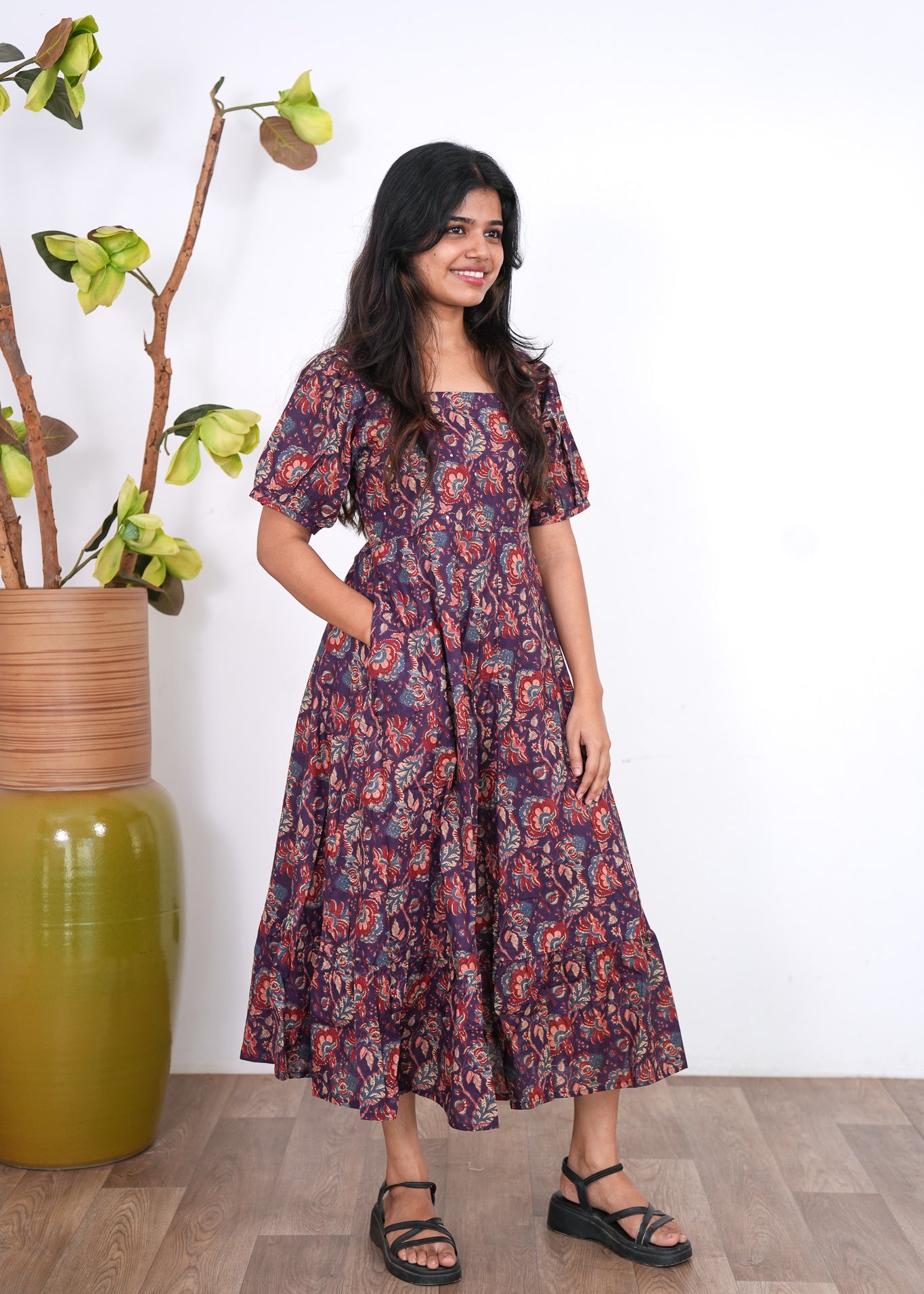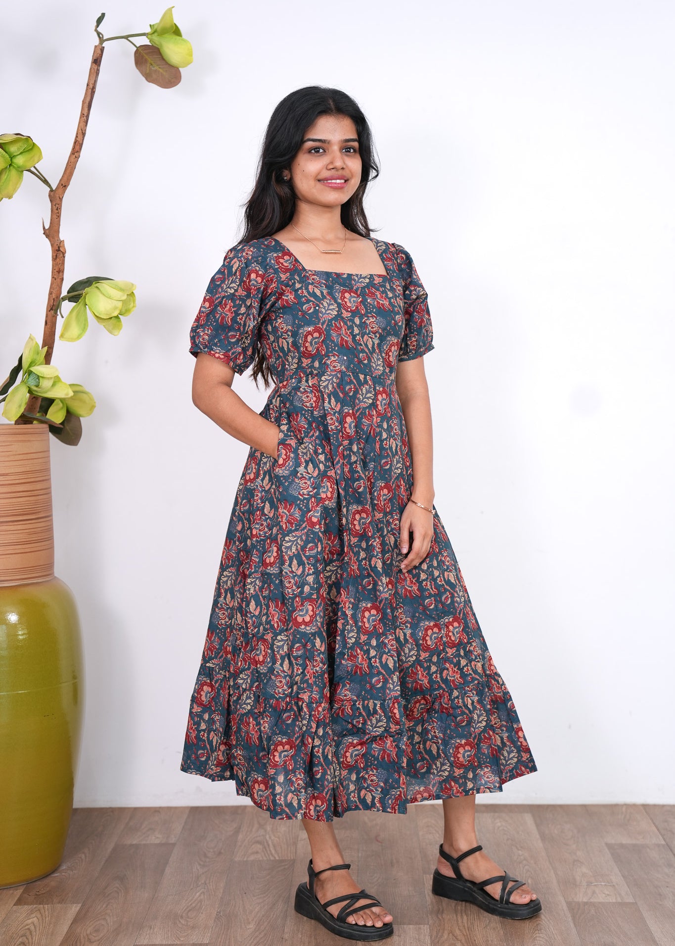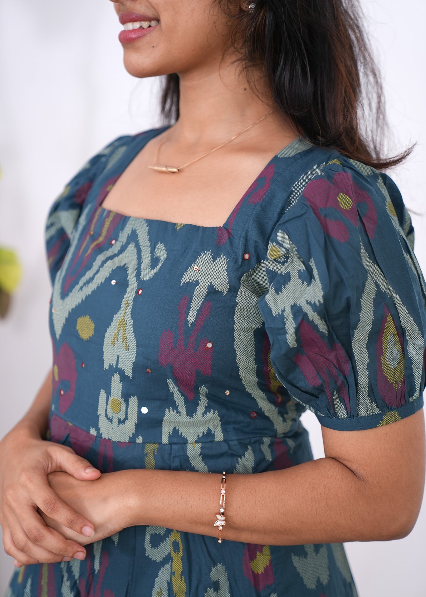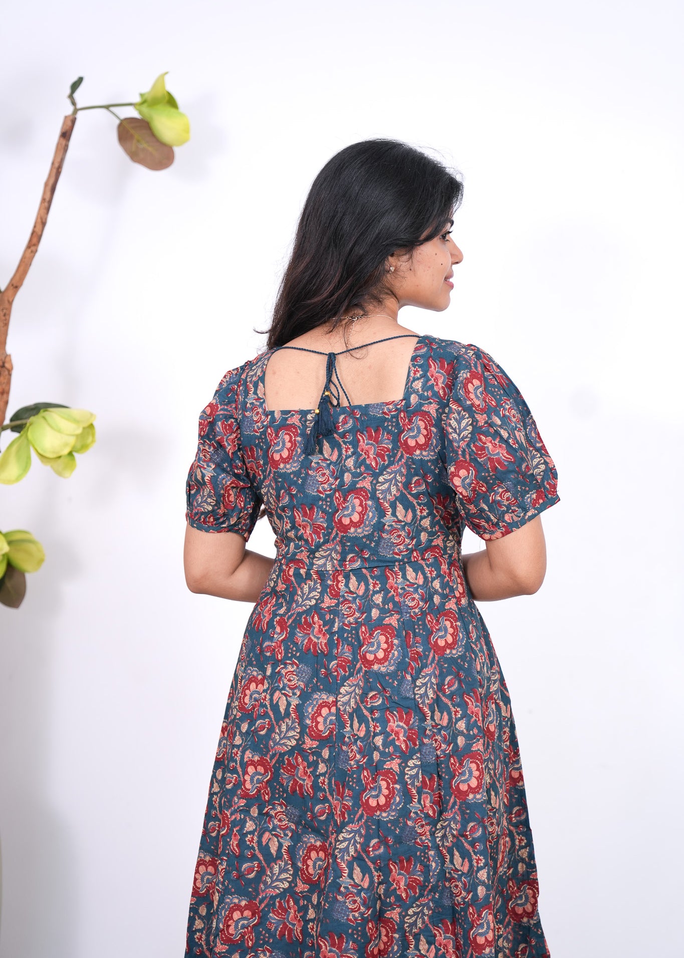 Ira cotton v neck gathered dress- Midnight blue(attached sleeves)