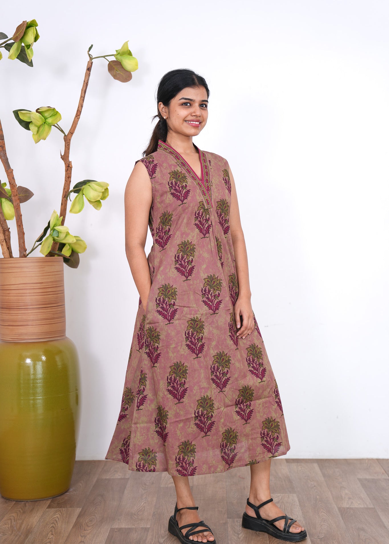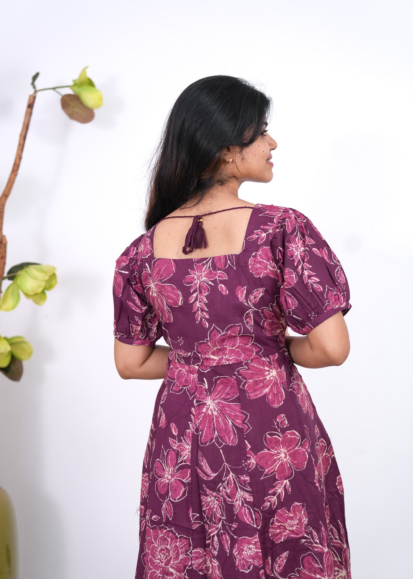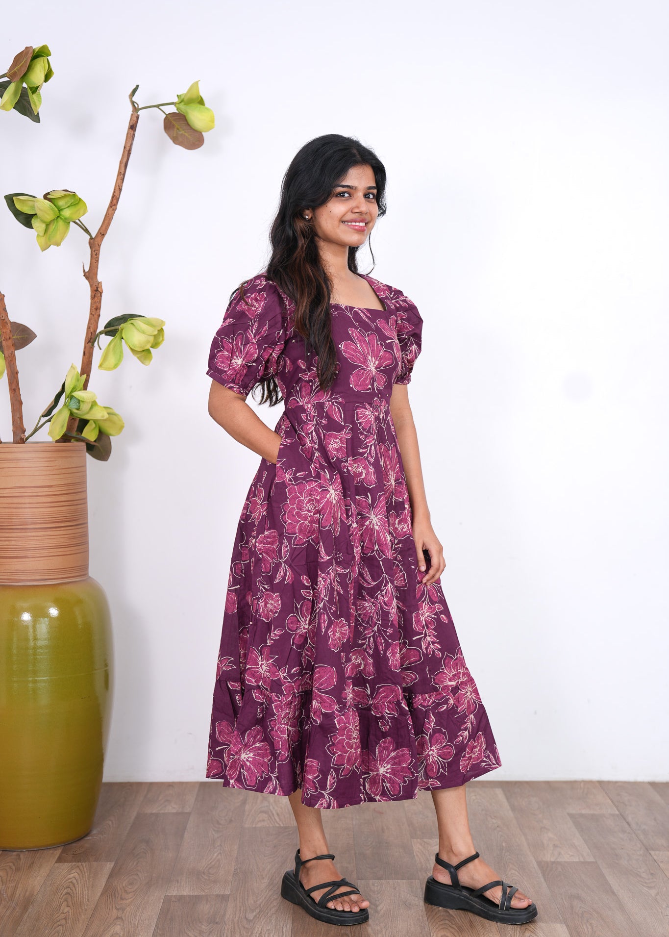 Ira cotton v neck gathered dress-Plum(attached sleeves)