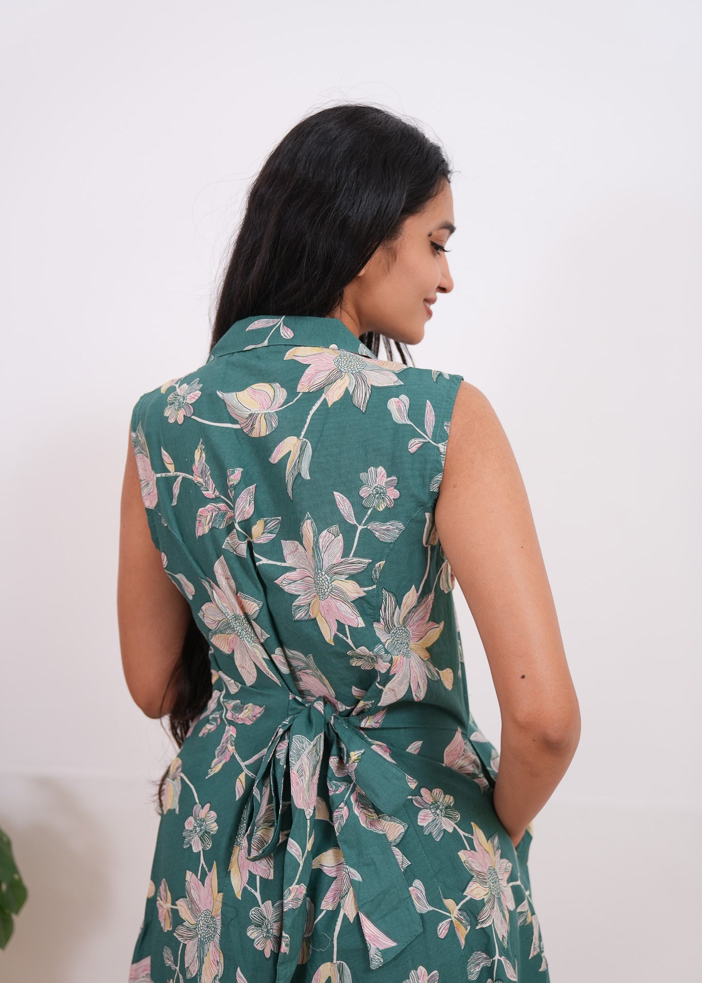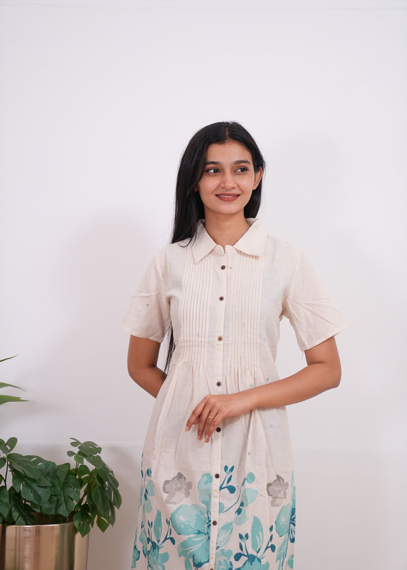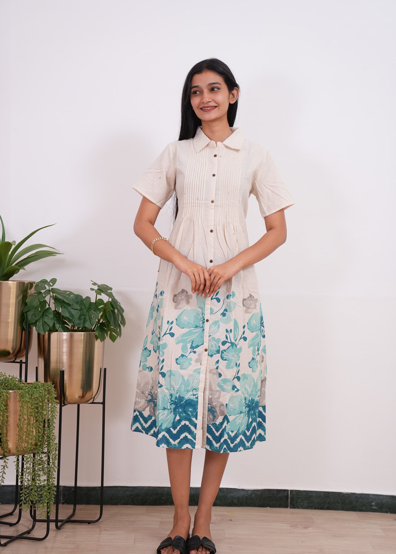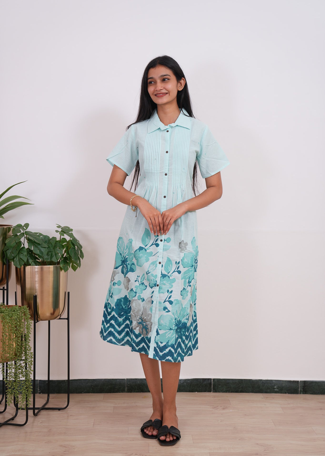 Turquoise lillies cotton shirt dress(attached sleeves)