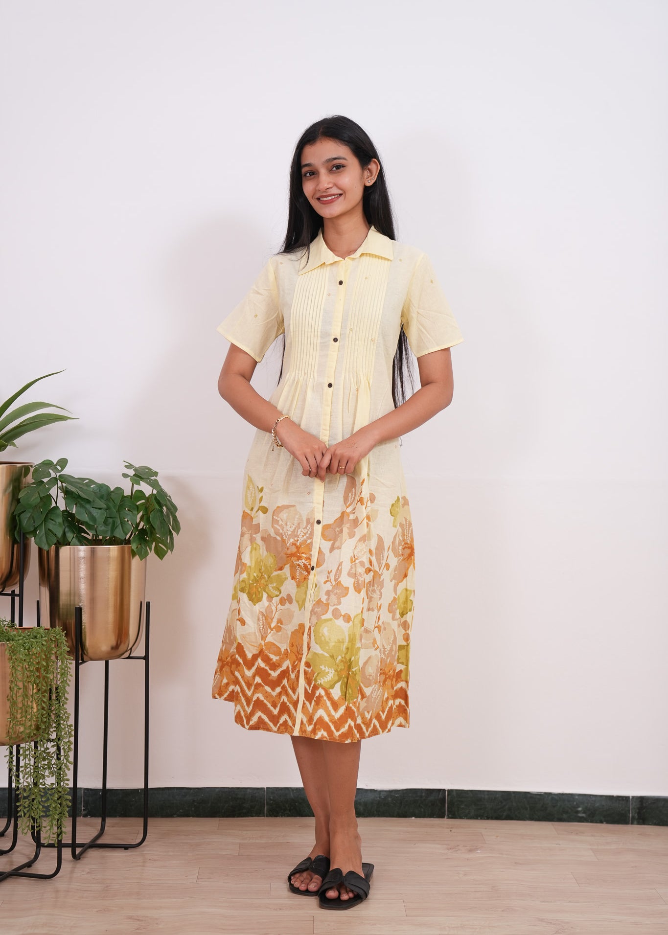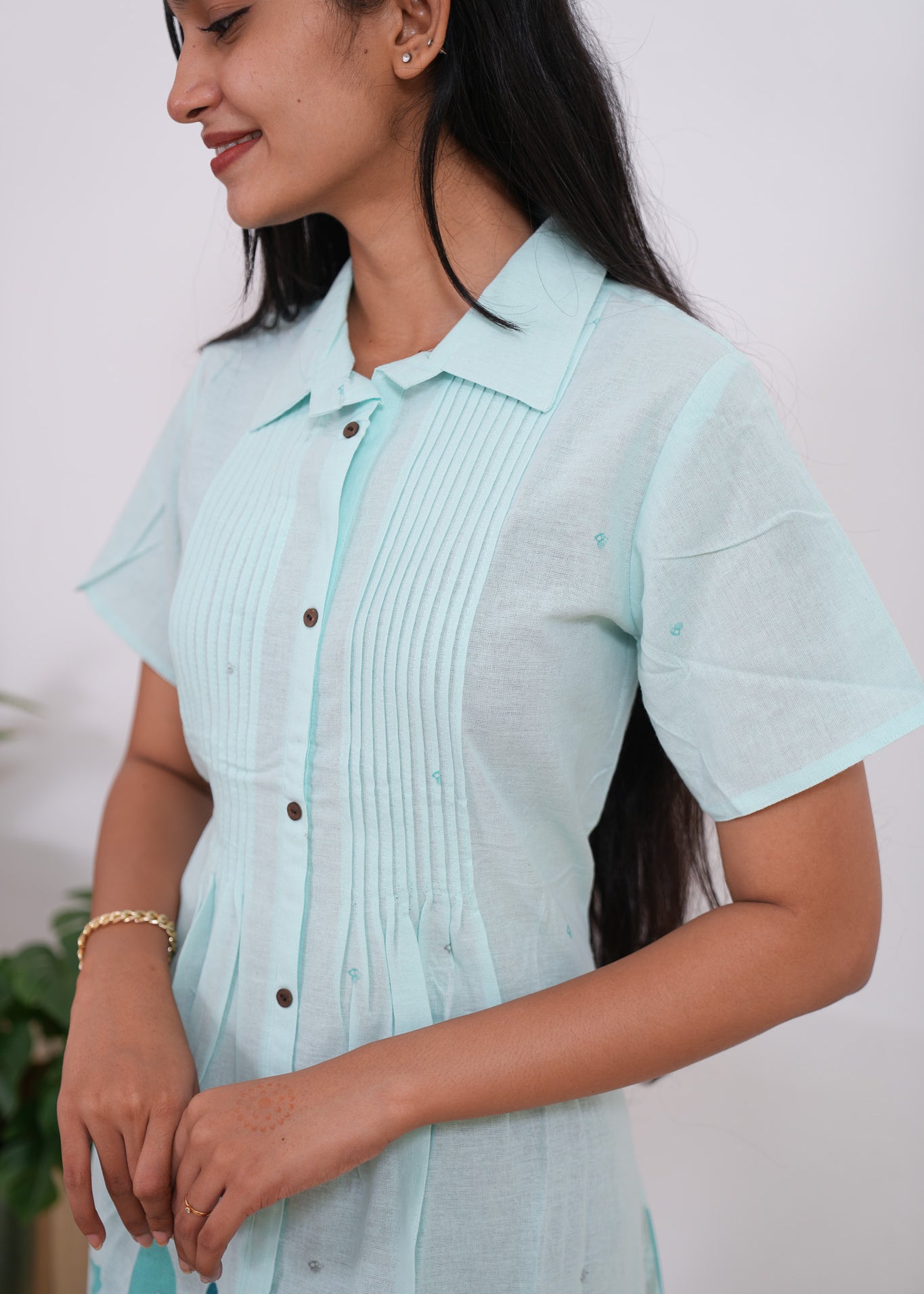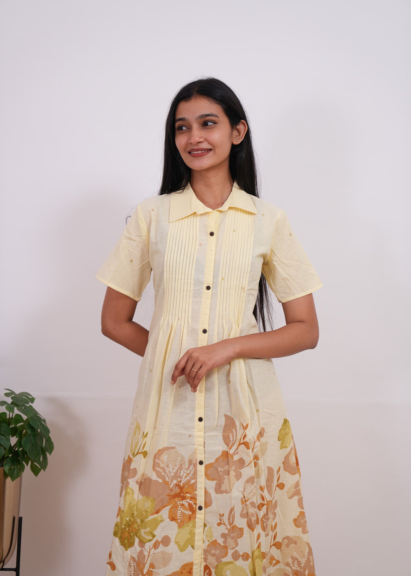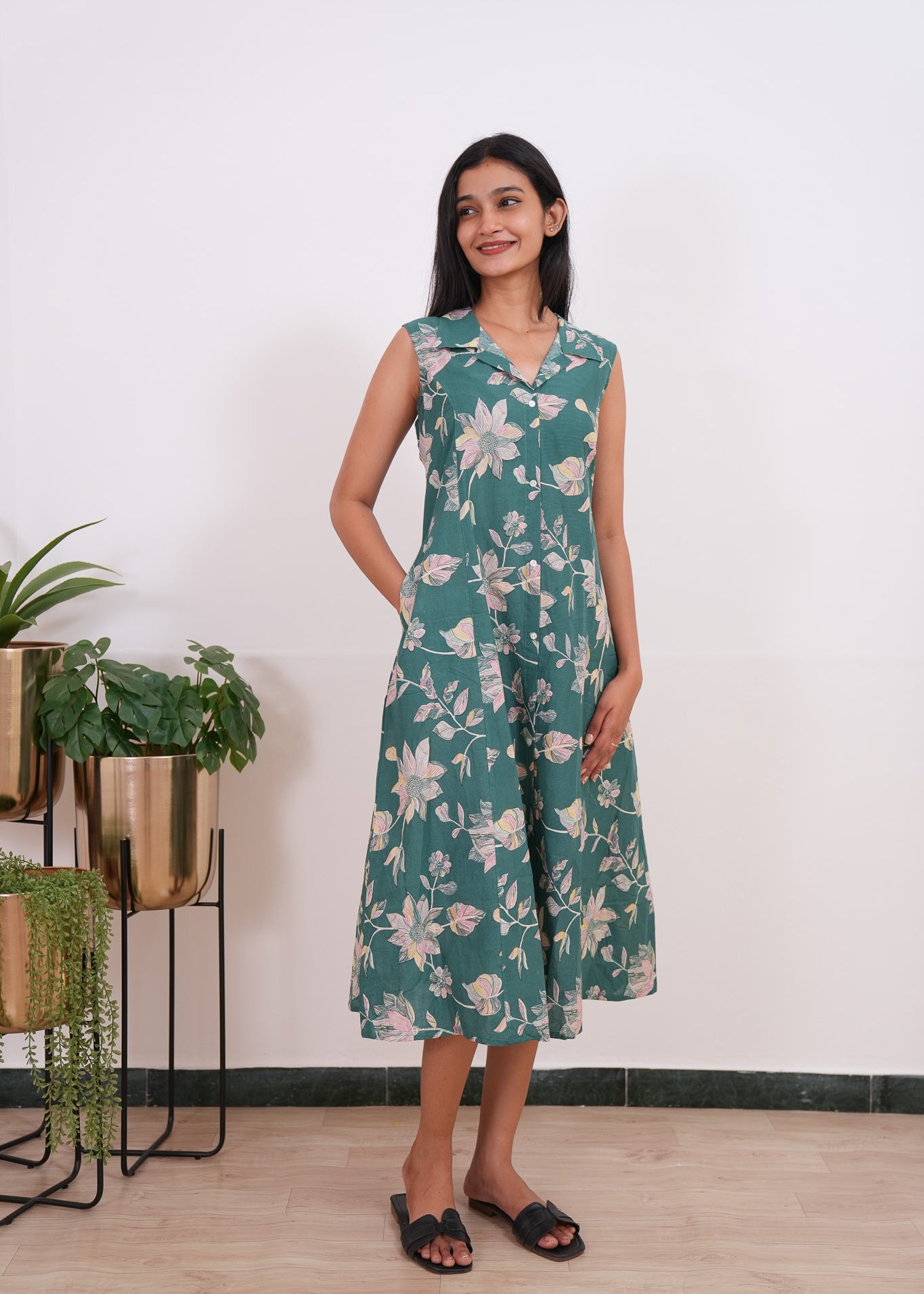 Turquoise lillies cotton shirt dress(attached sleeves)