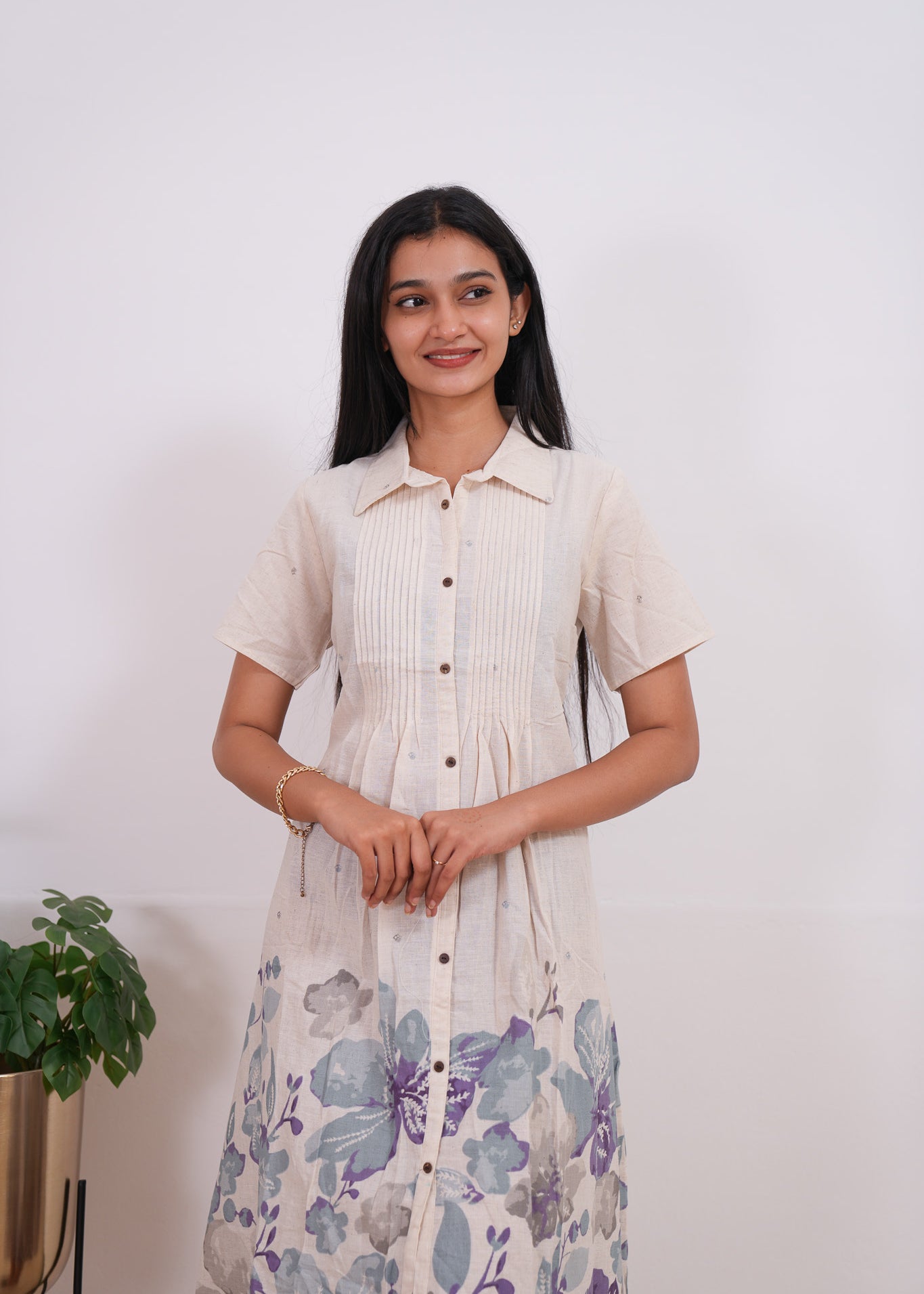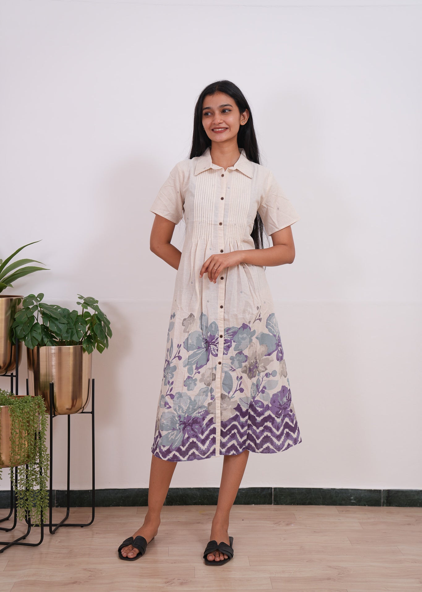 Royal blue lillies cotton shirt dress(attached sleeves)