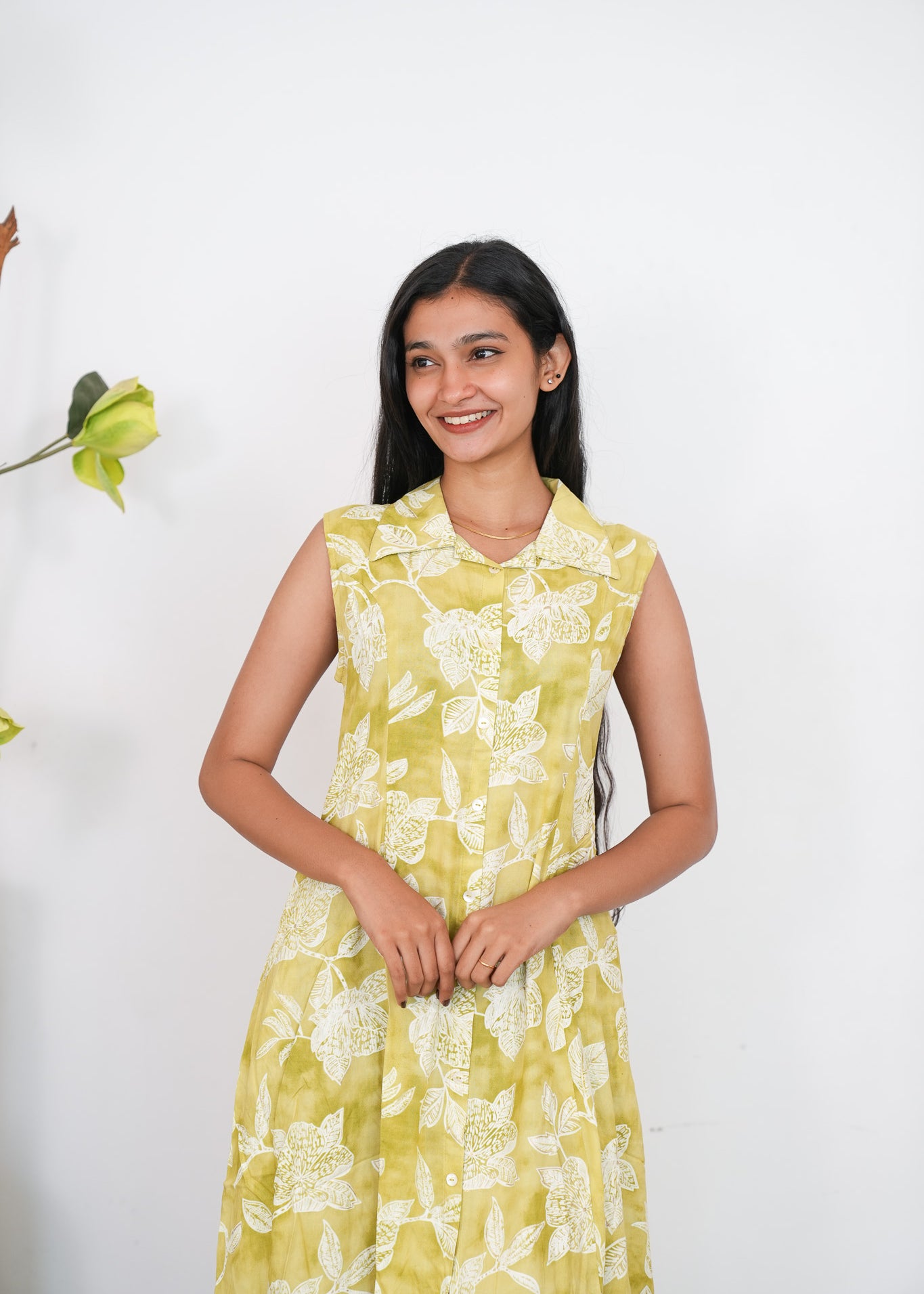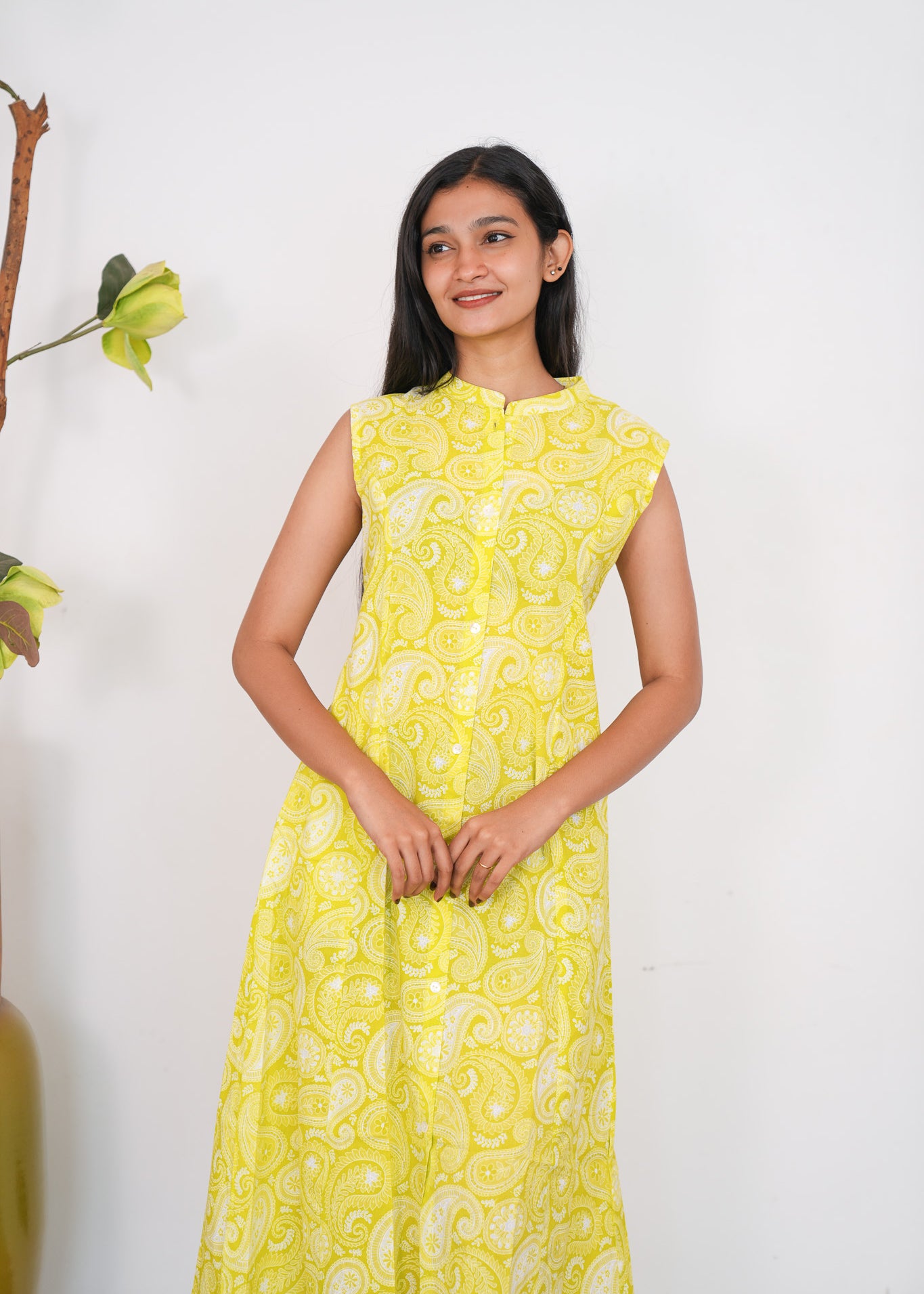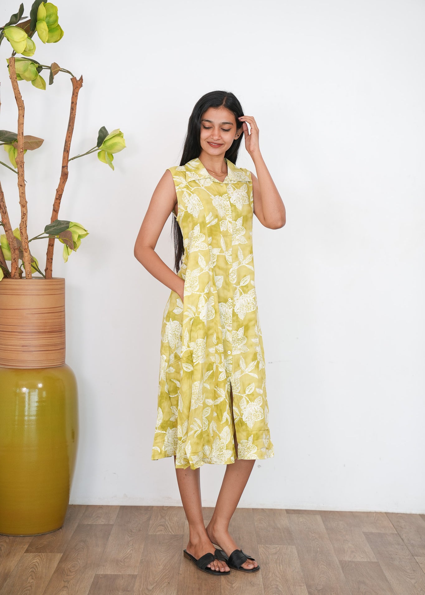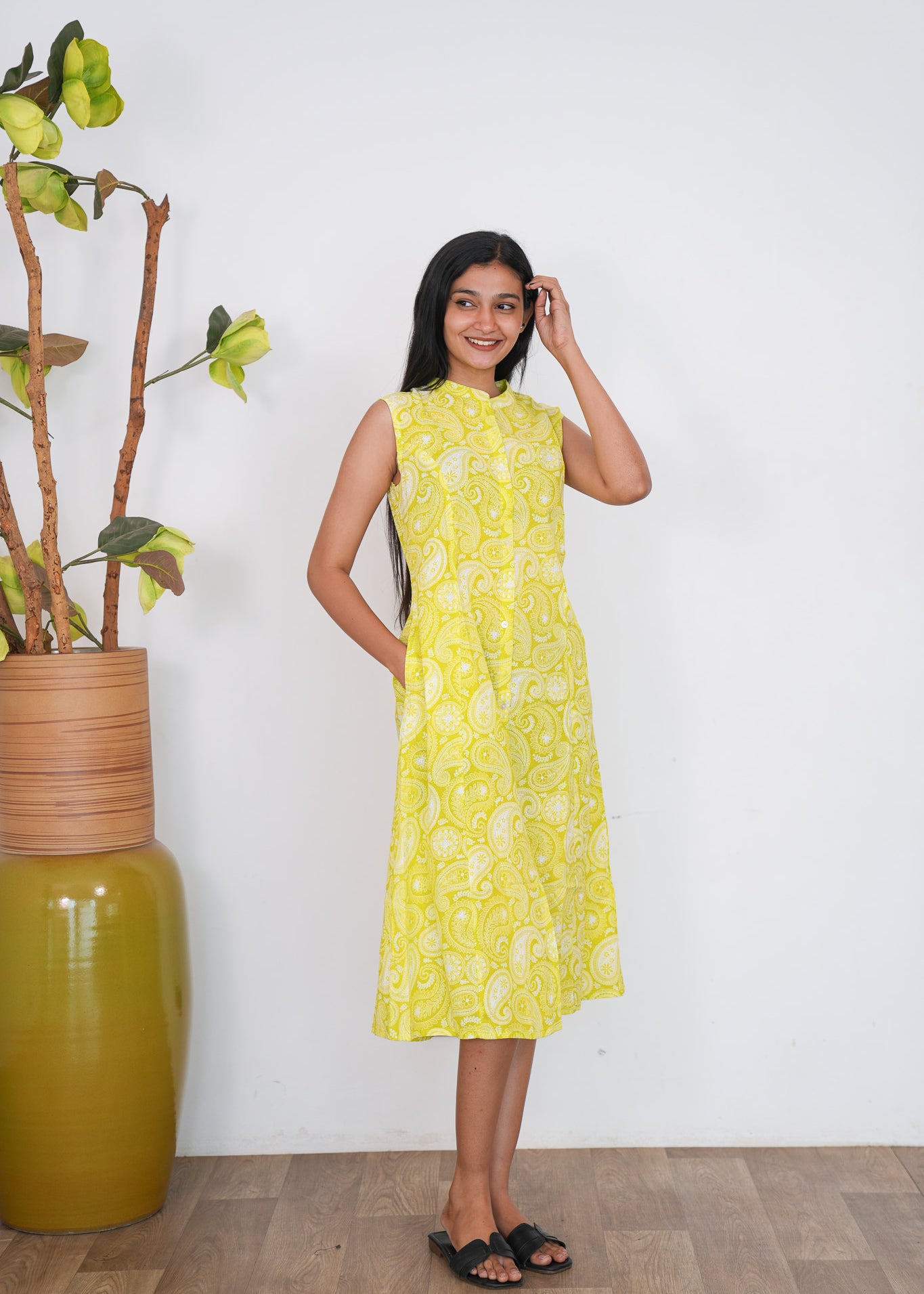 Lemon yellow mandarin cotton shirt dress(attached sleeves)