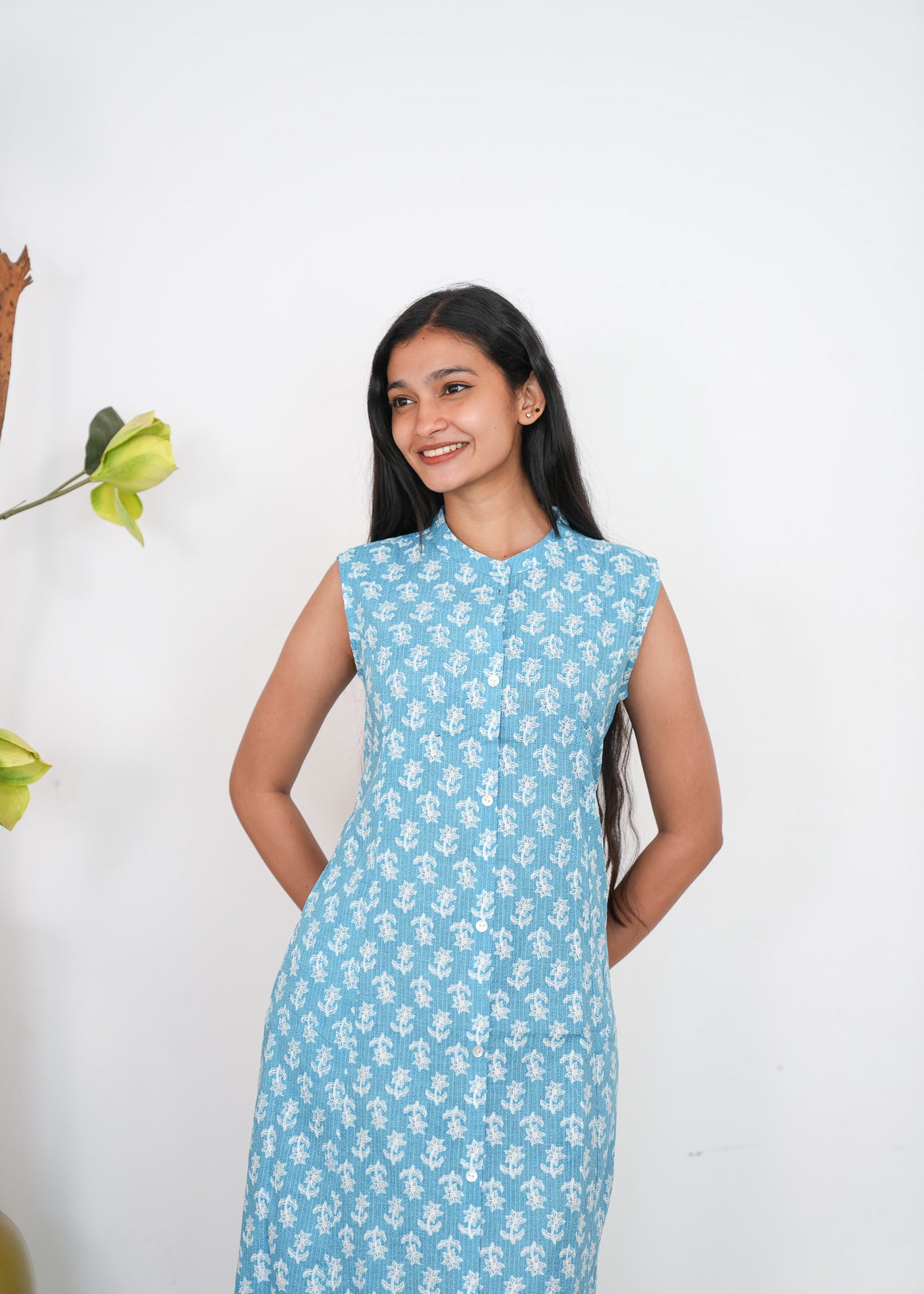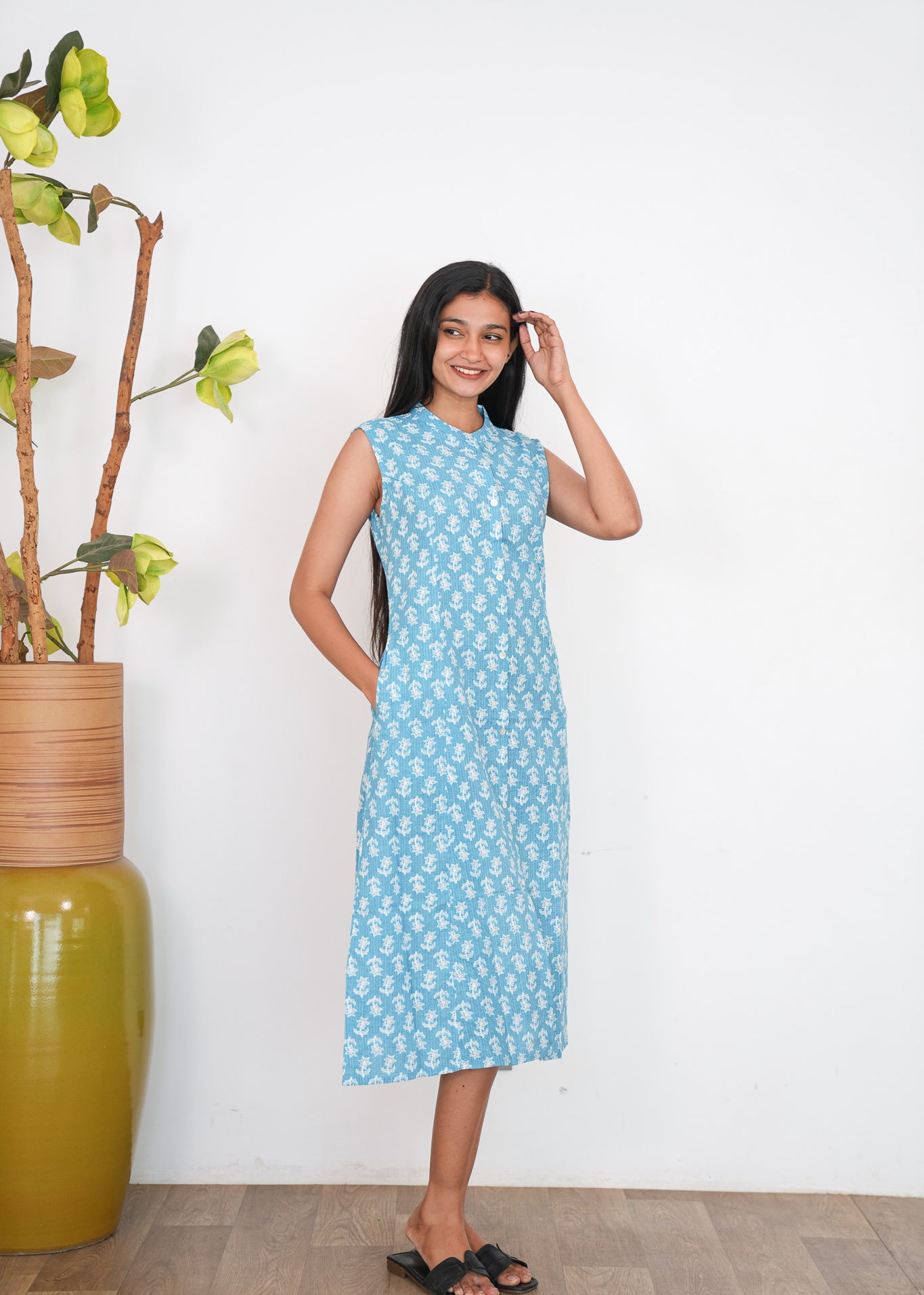 Sky blue mandarin cotton shirt dress(attached sleeves)