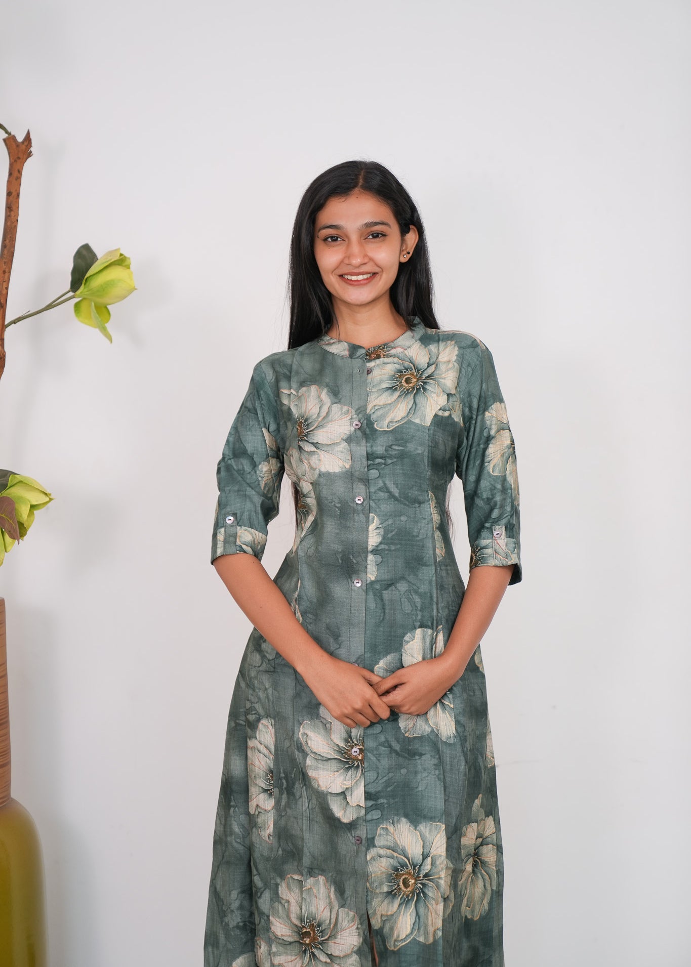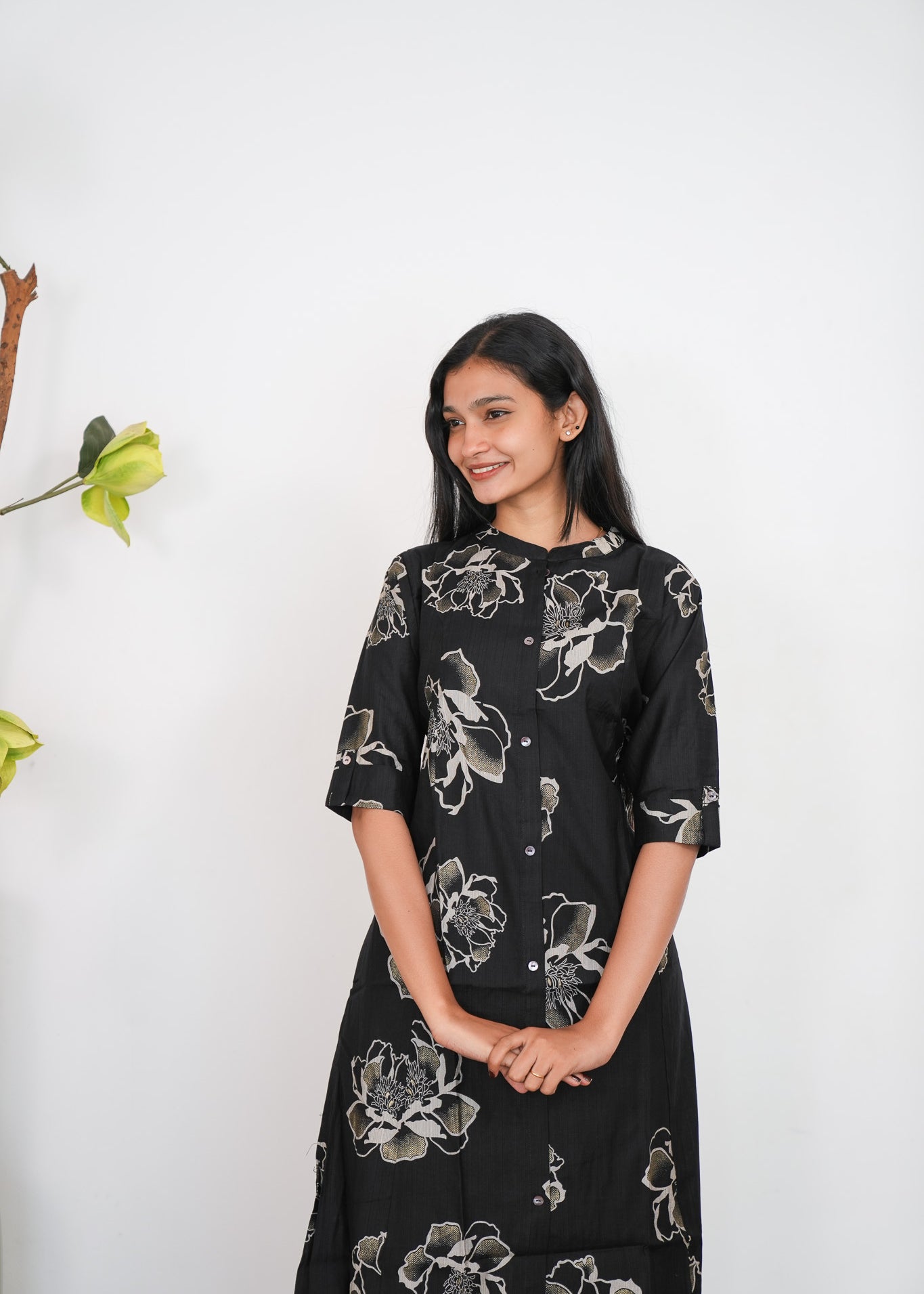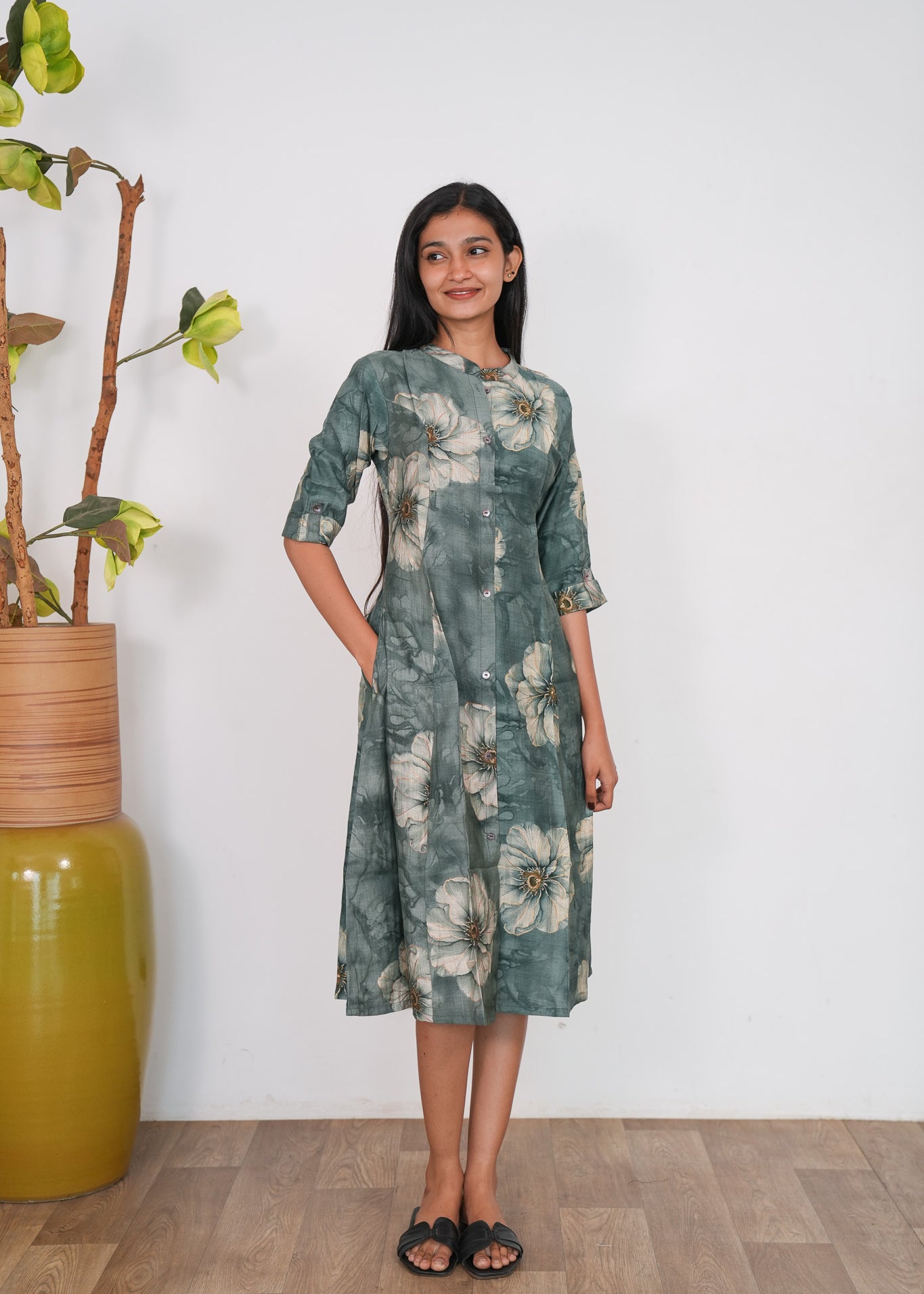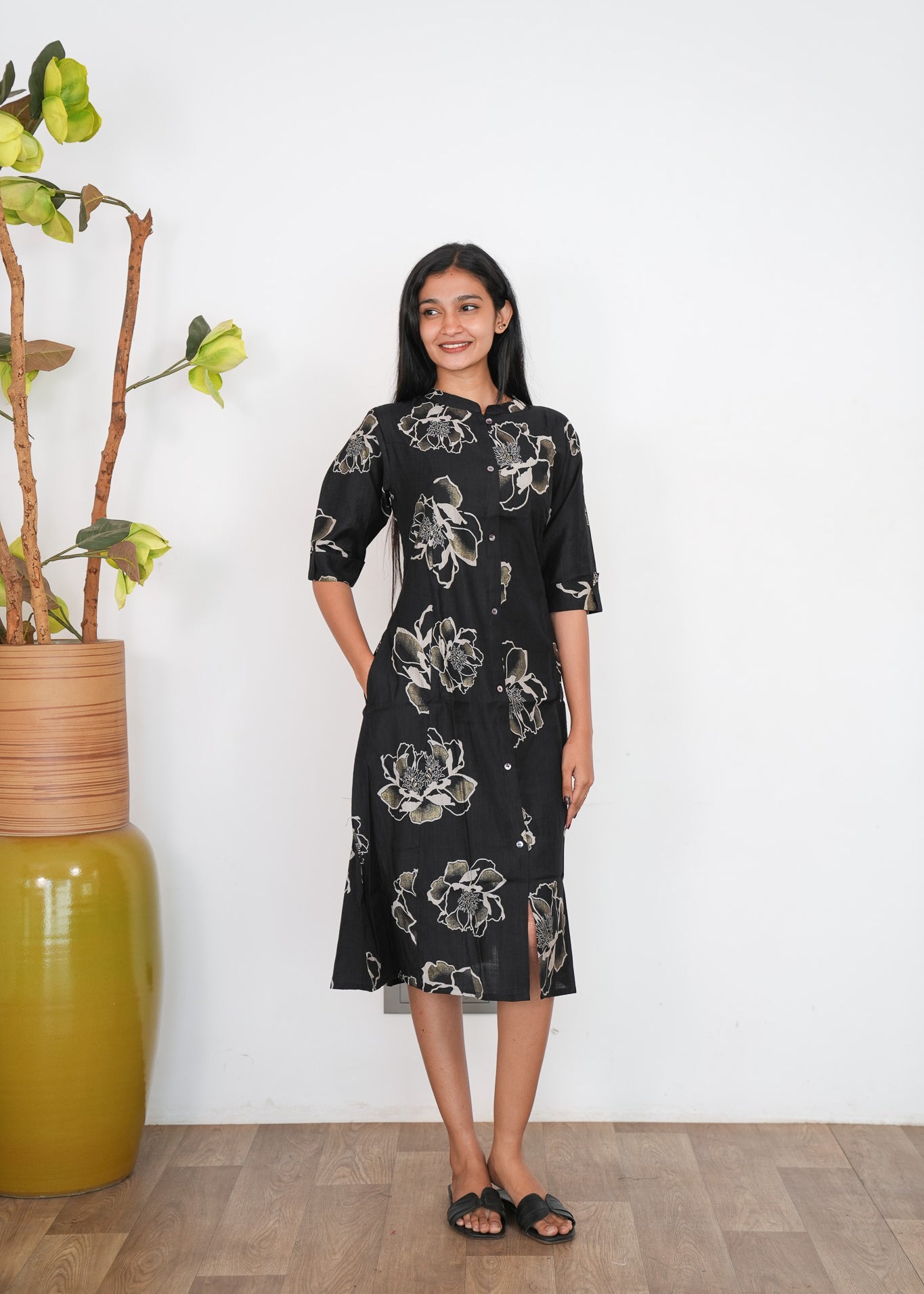 Dark blue mandarin cotton shirt dress(attached sleeves)