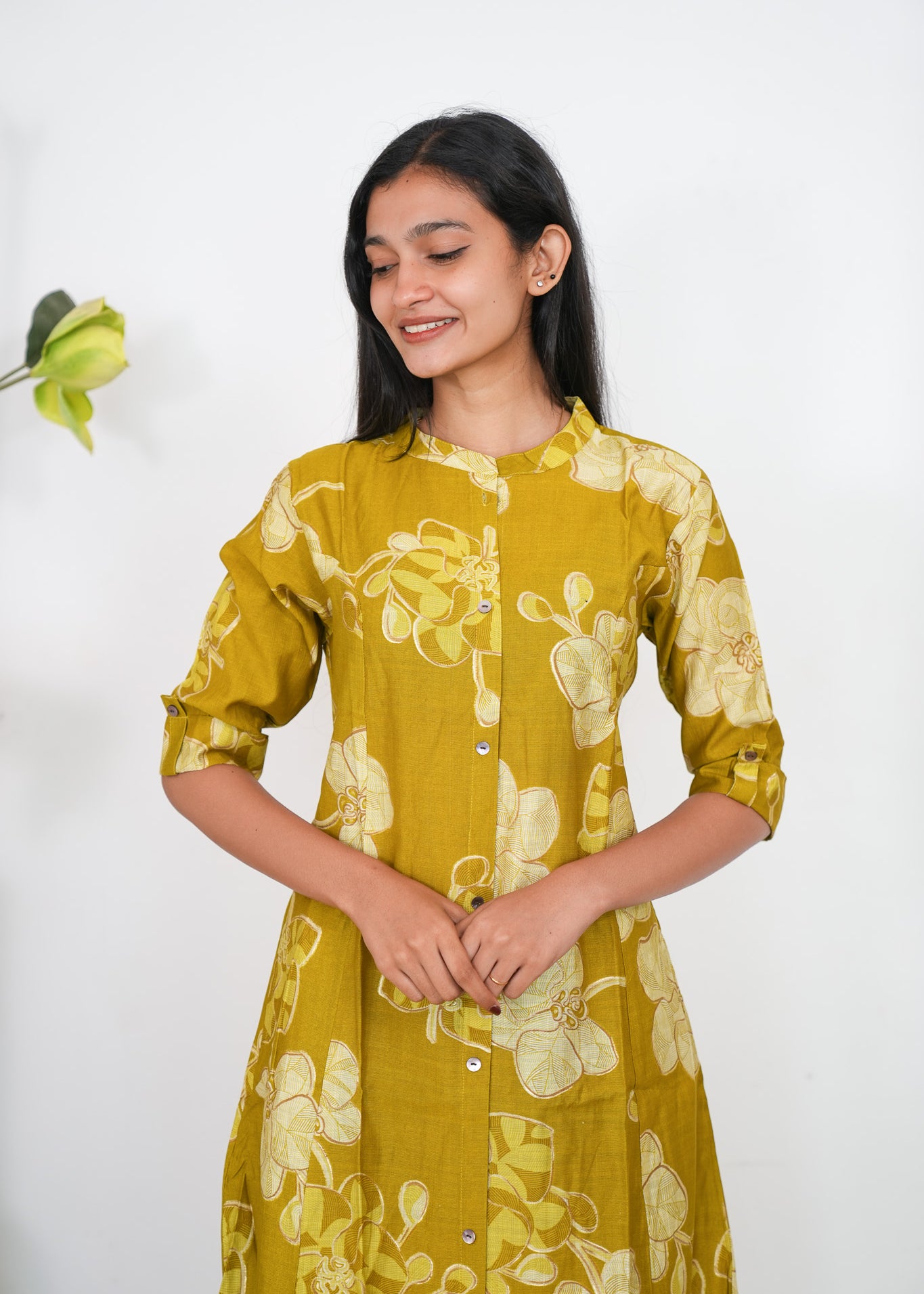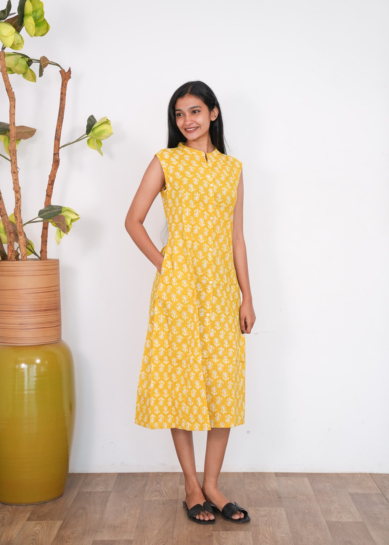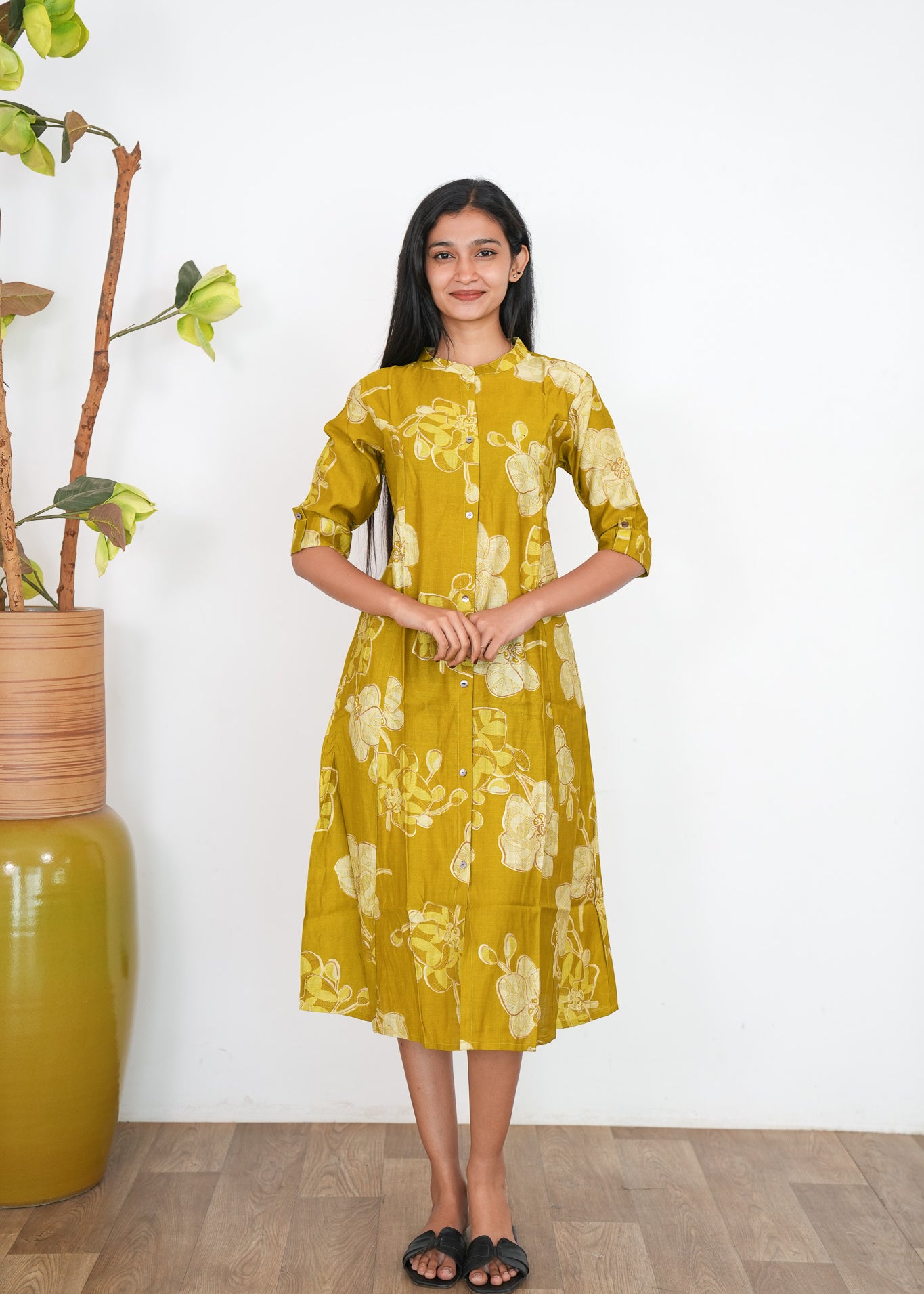 Mustard mandarin cotton shirt dress(attached sleeves)