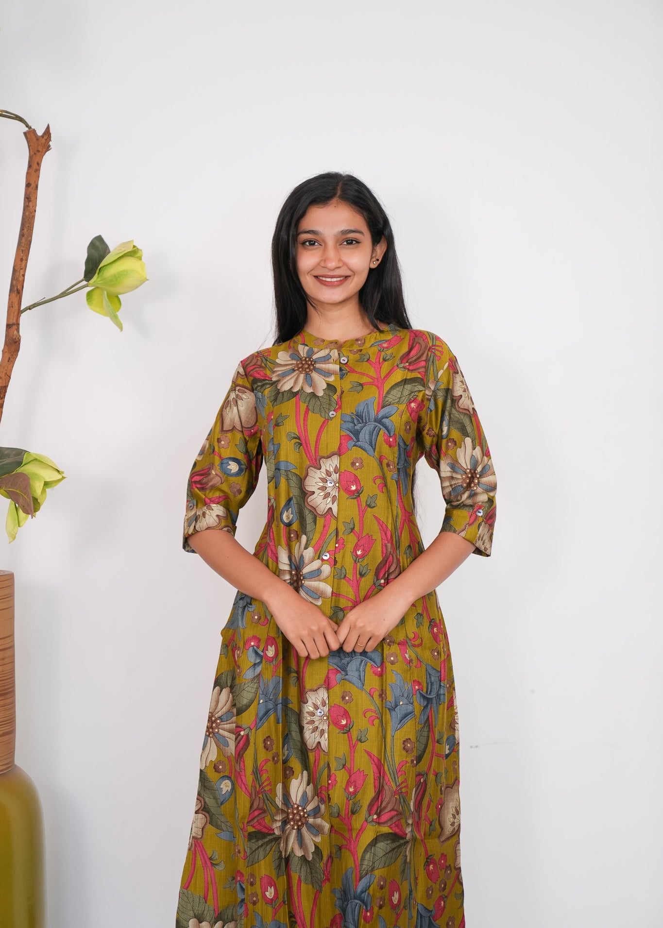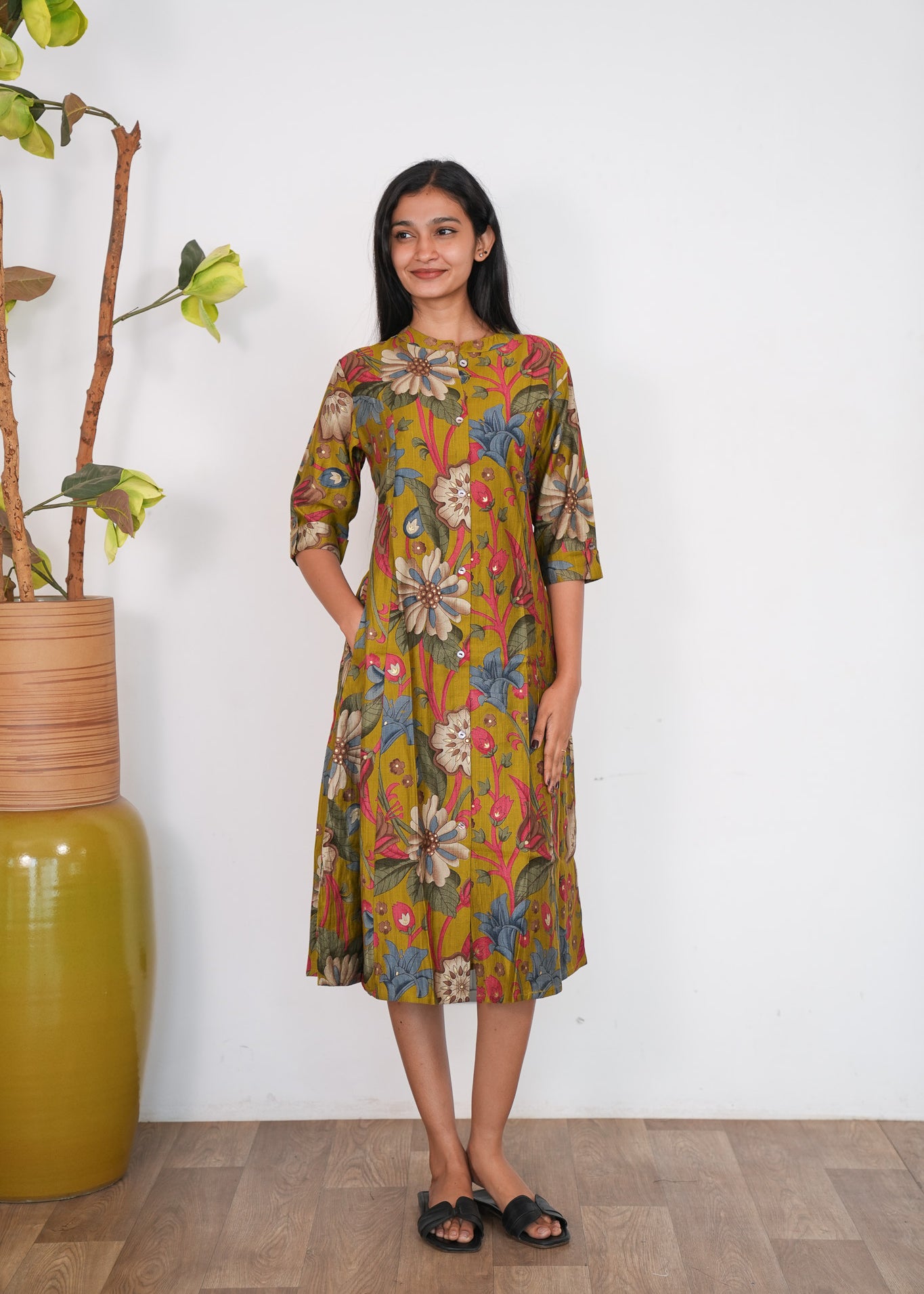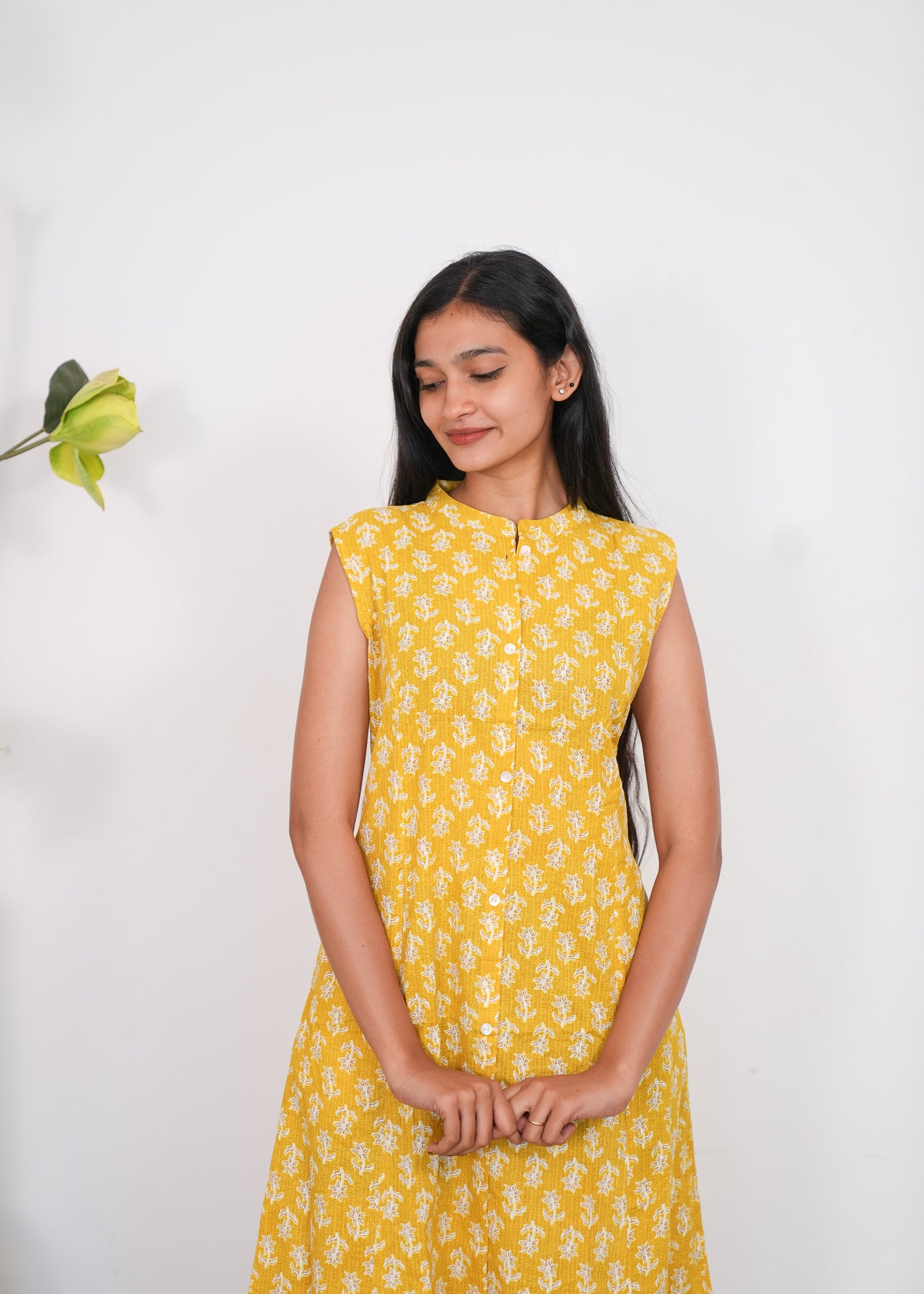 Mustard mandarin cotton shirt dress(attached sleeves)