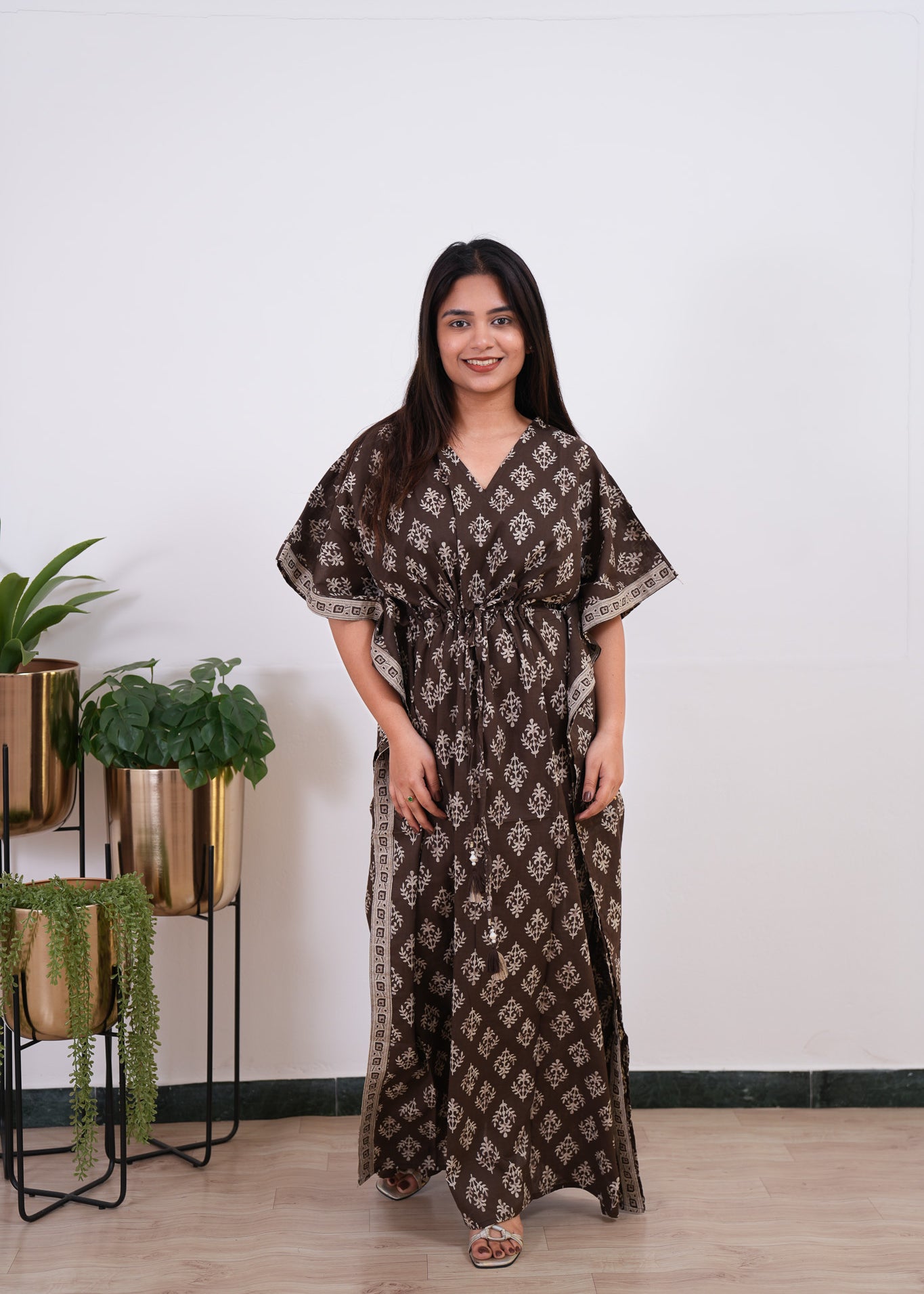 Coffee floral hand block pure cotton kaftan