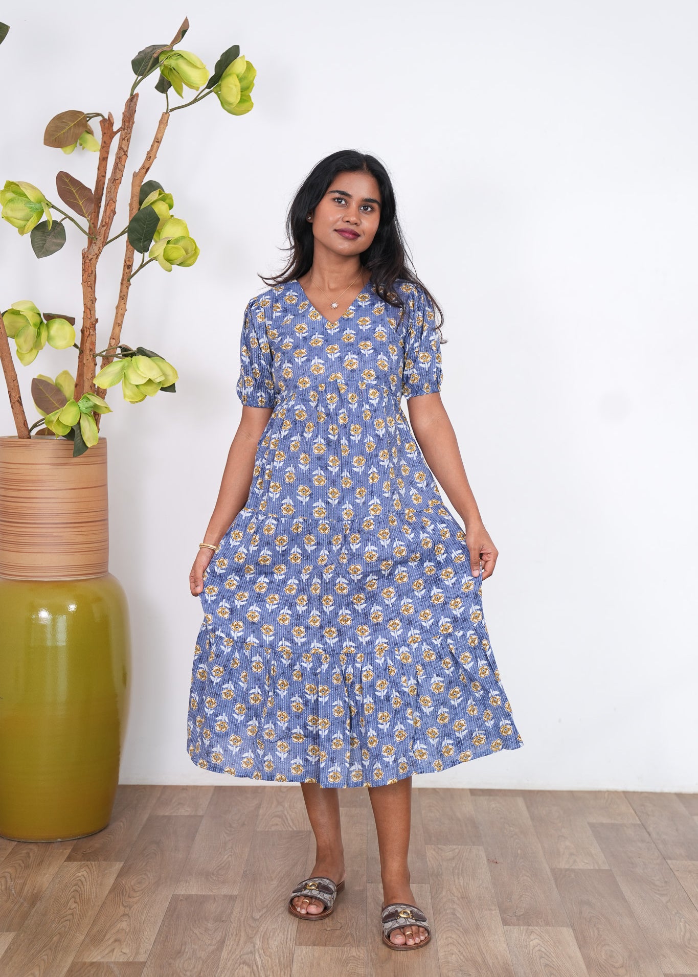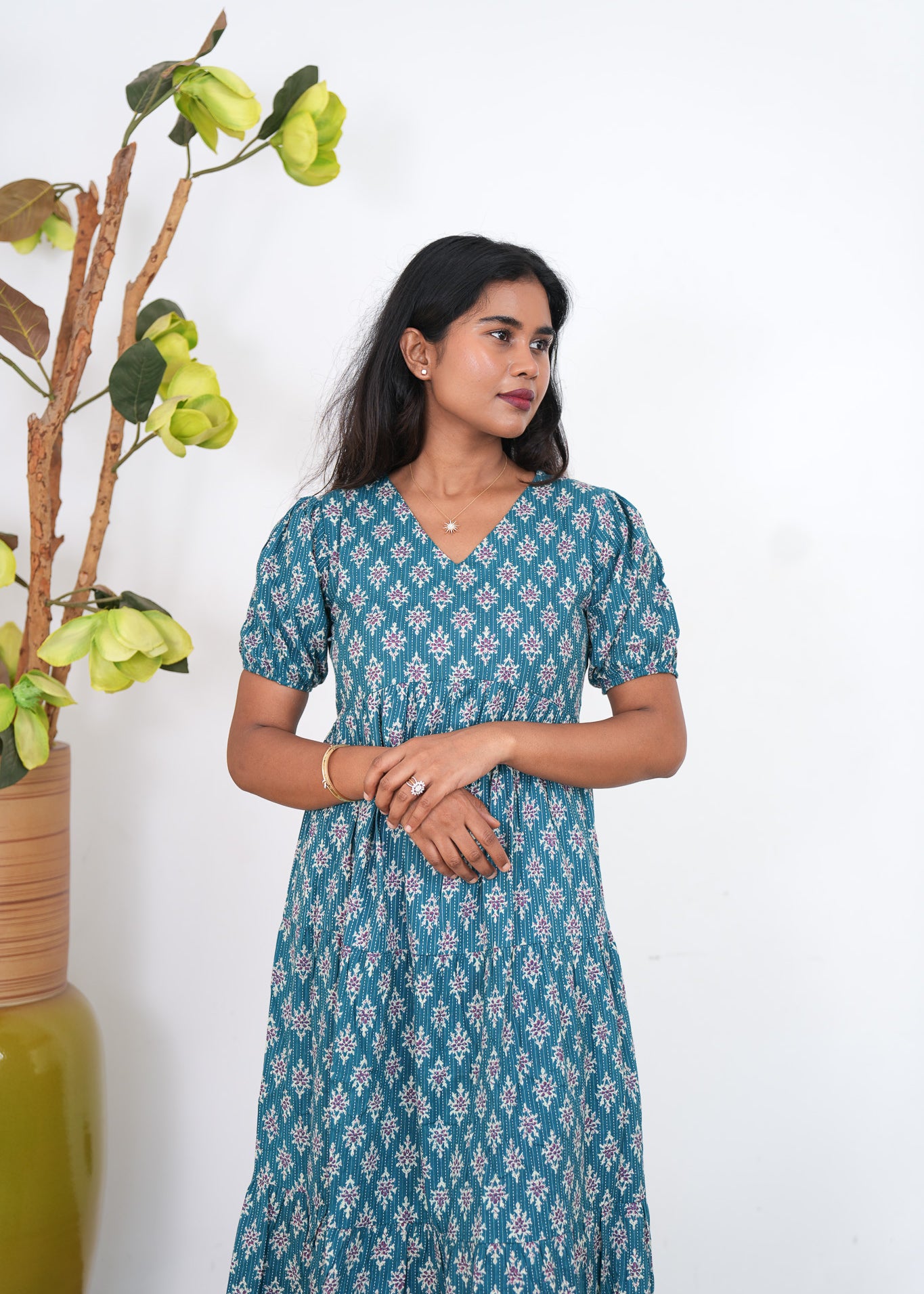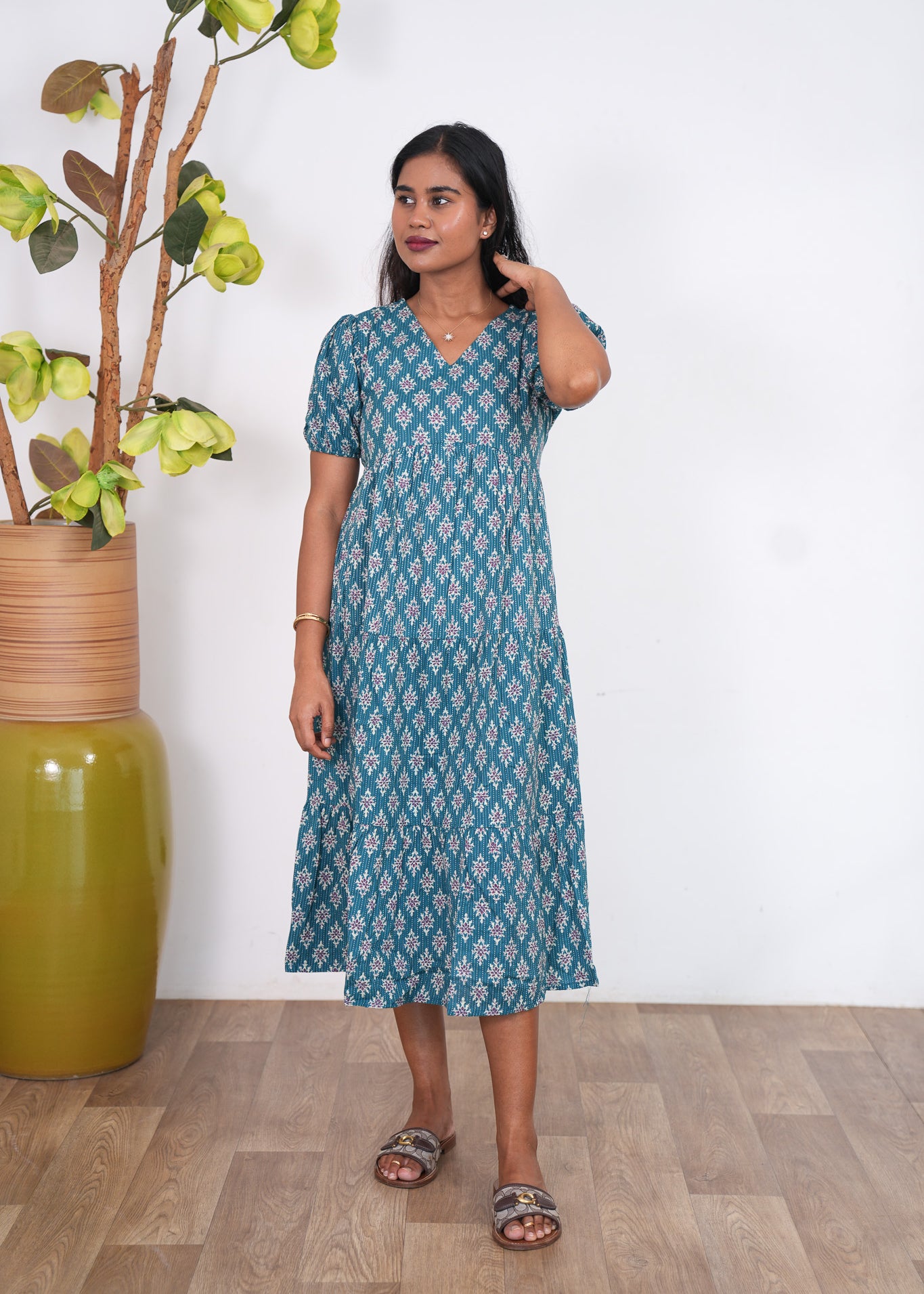 Sea blue katha cotton midi dress