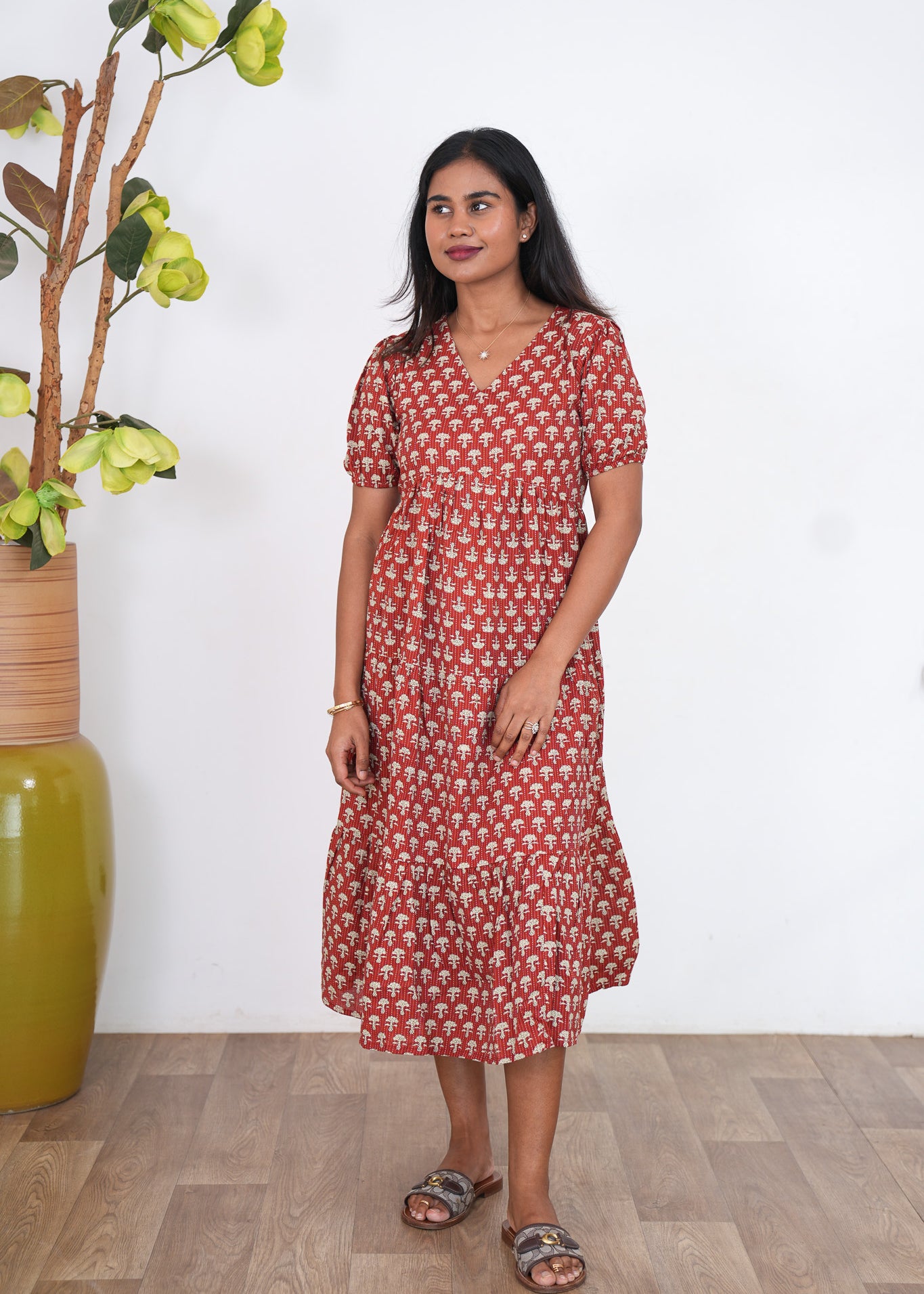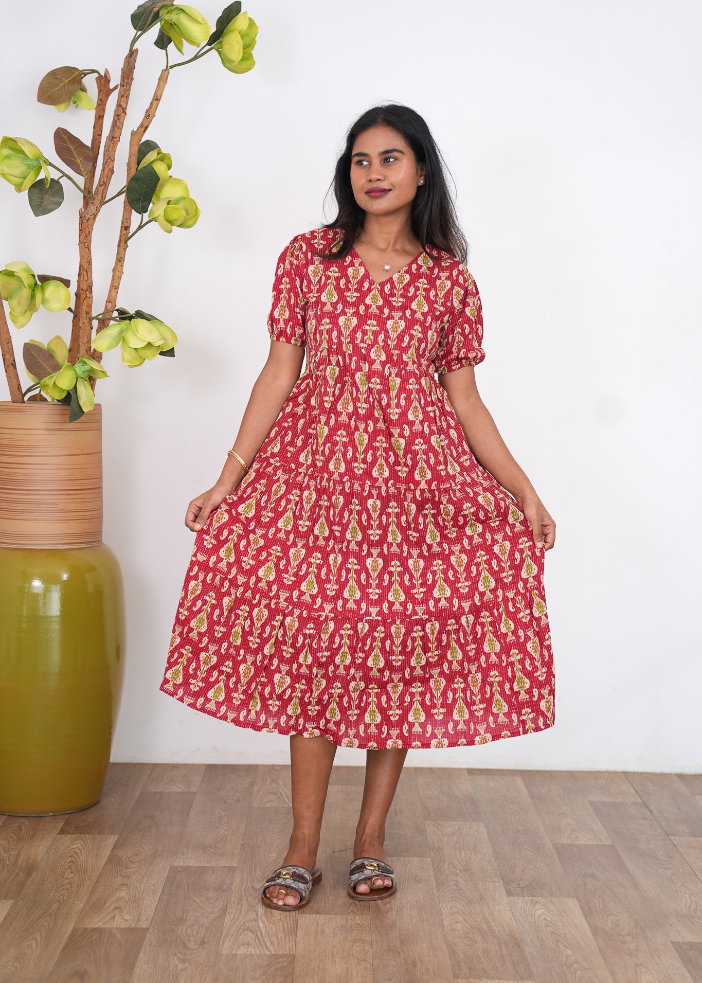 Red katha cotton midi dress
