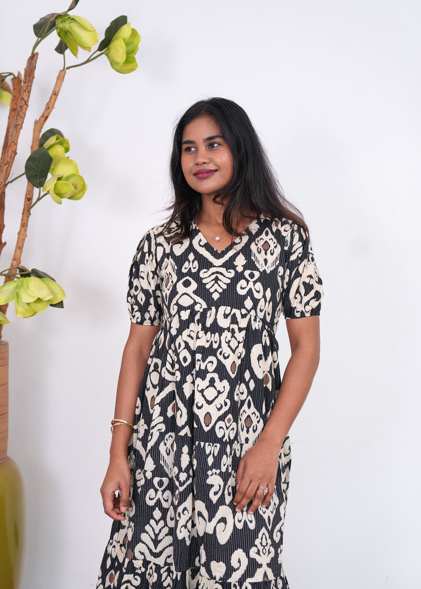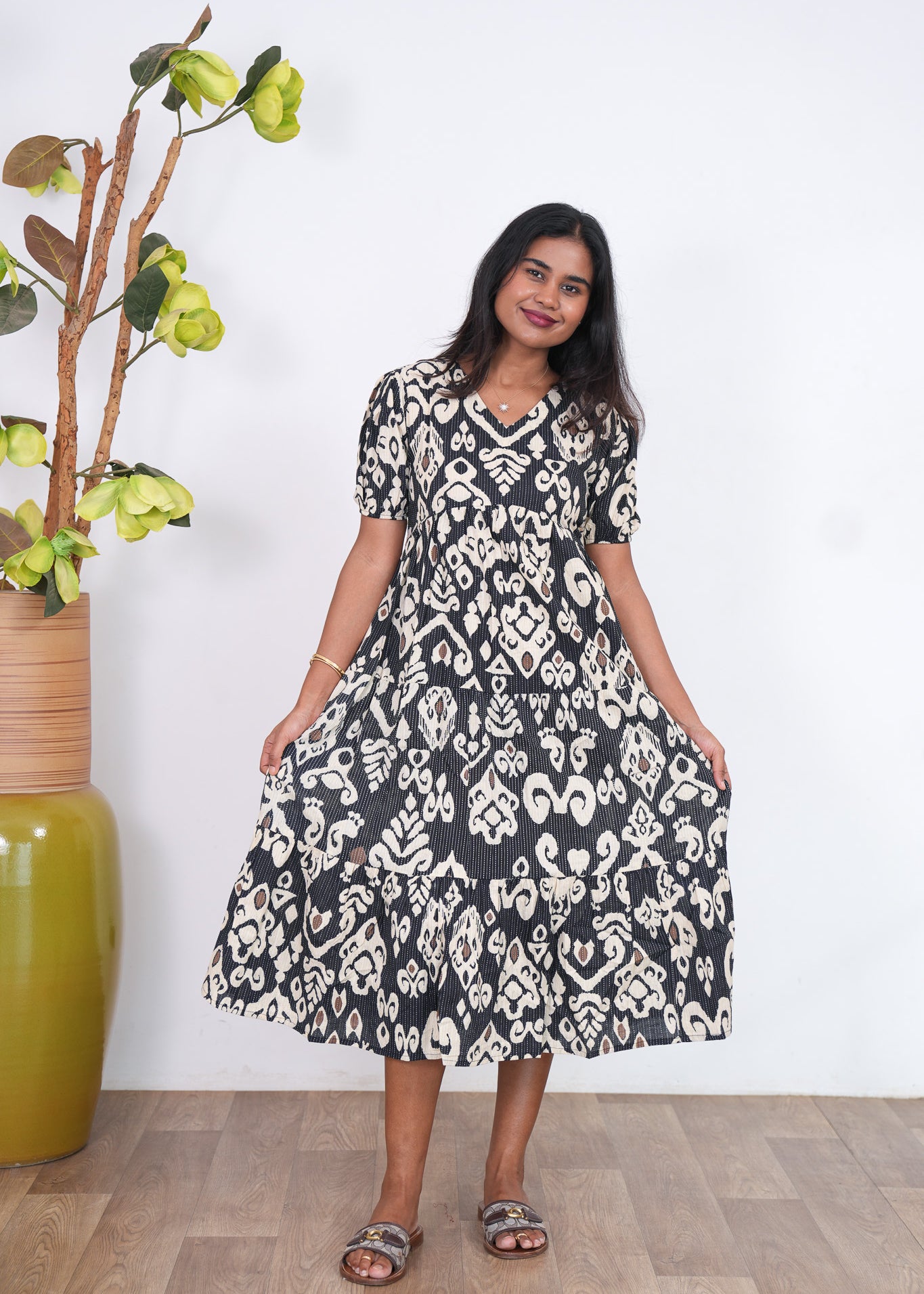 Black katha cotton midi dress