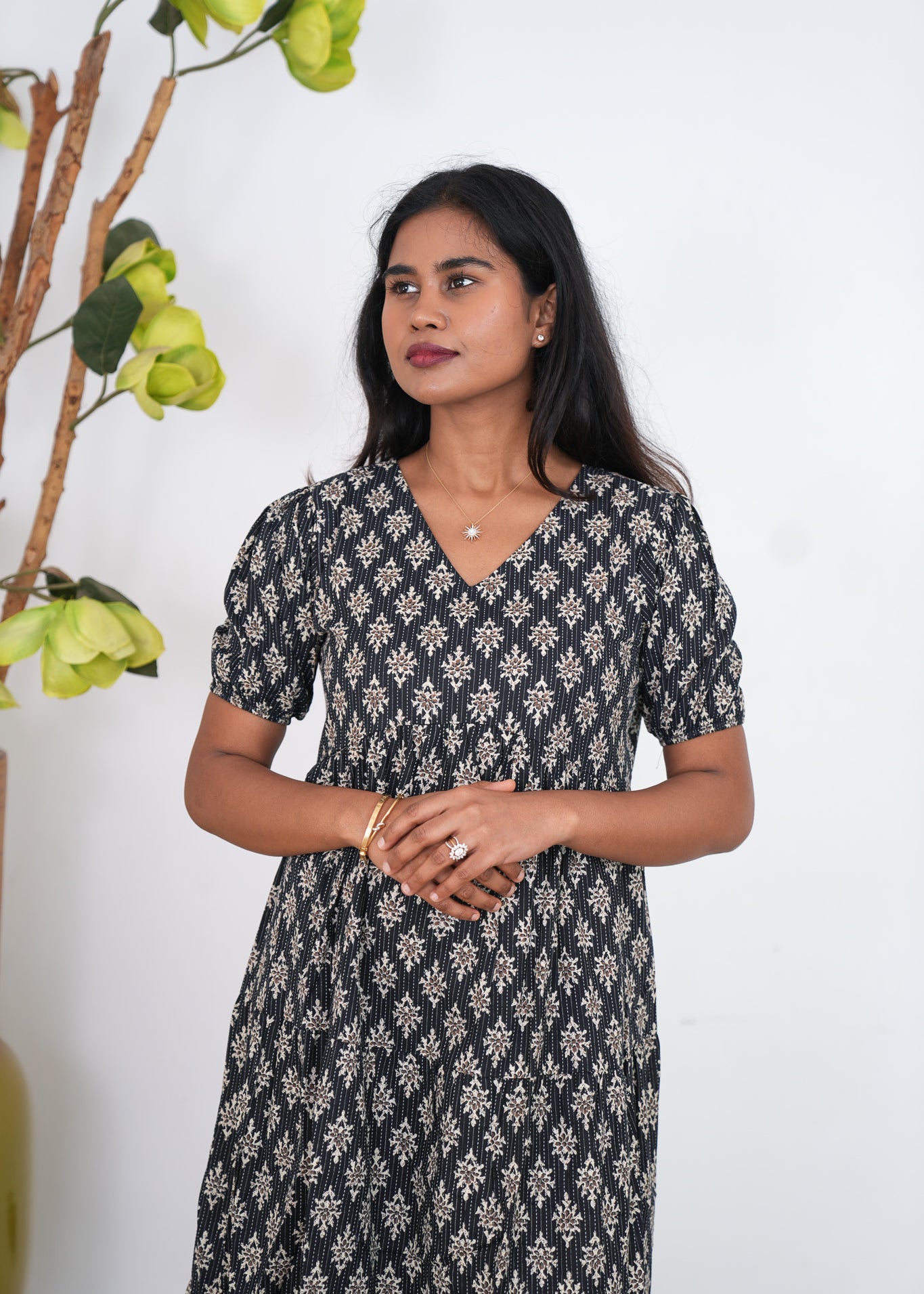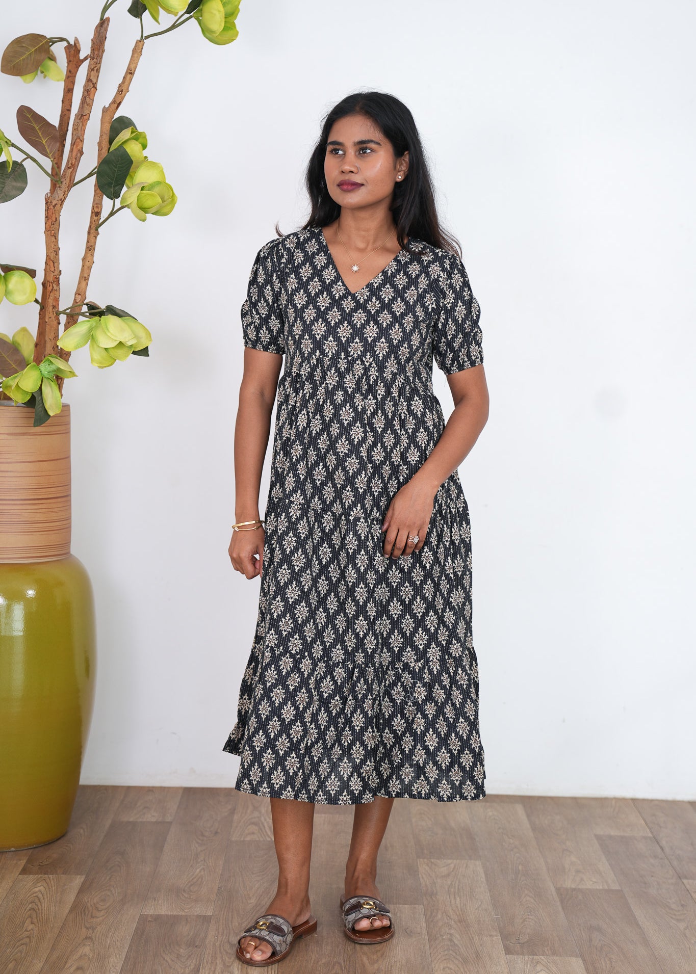 Midnight black katha cotton midi dress