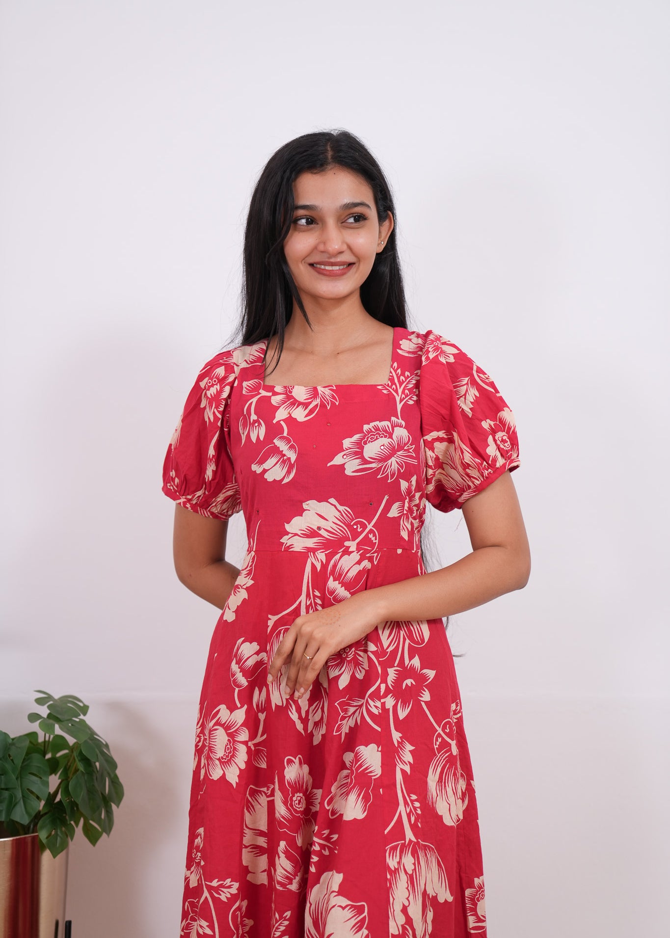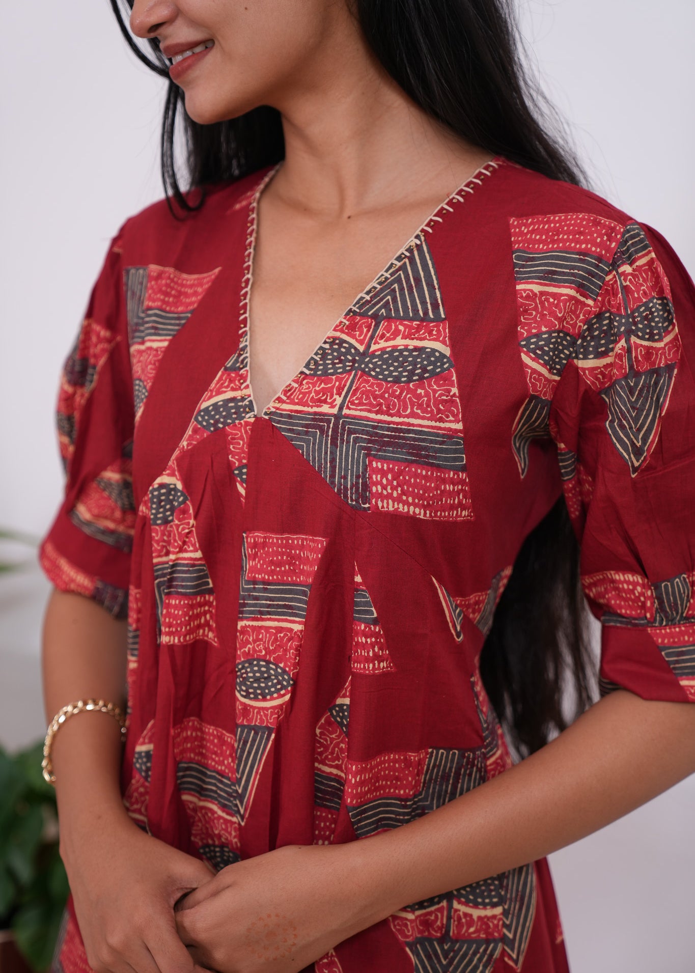 Ira cotton v neck gathered dress-Crimson(attached sleeves)