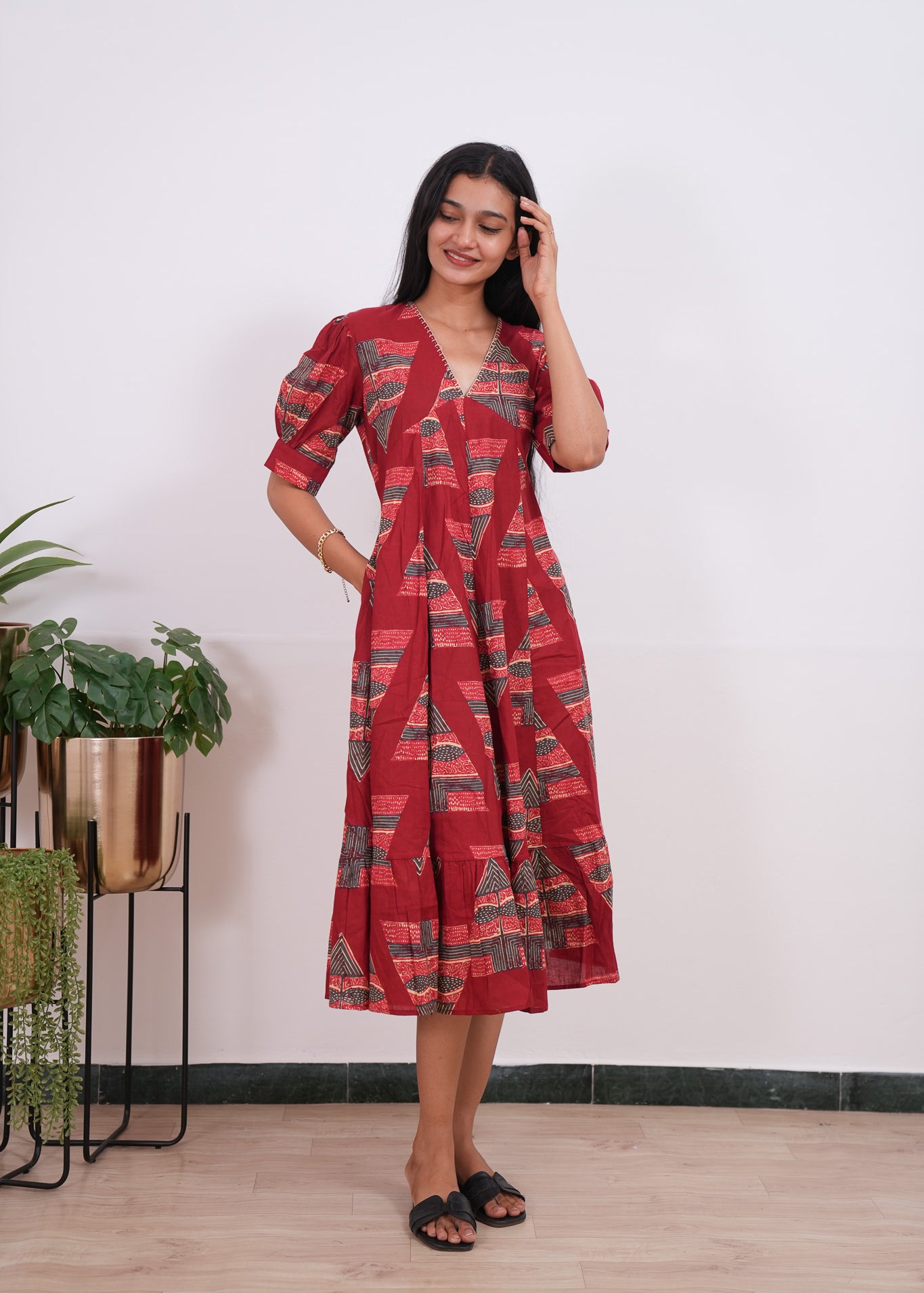 Maroon geometric cotton midi dress