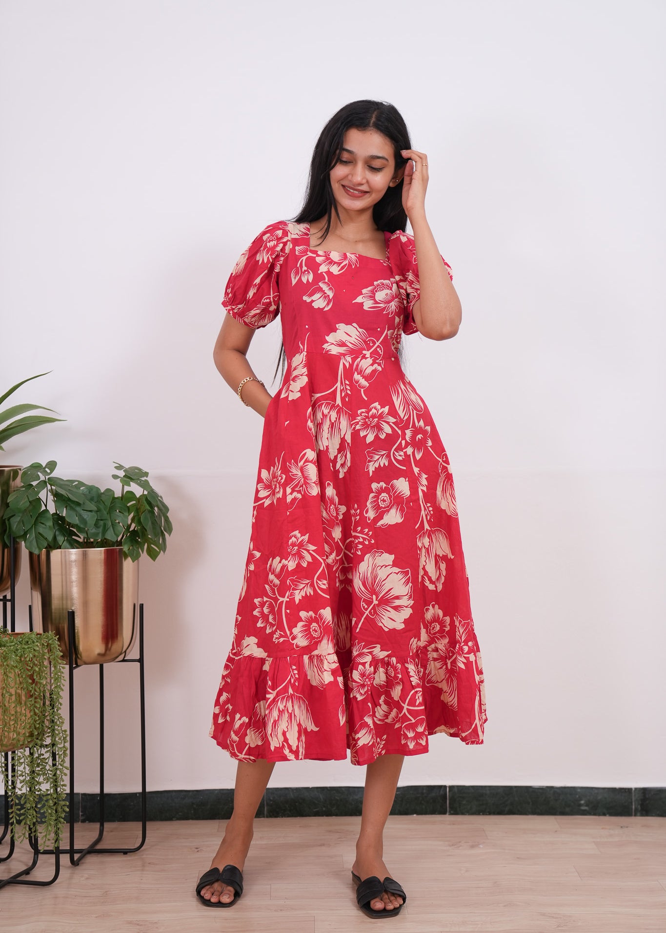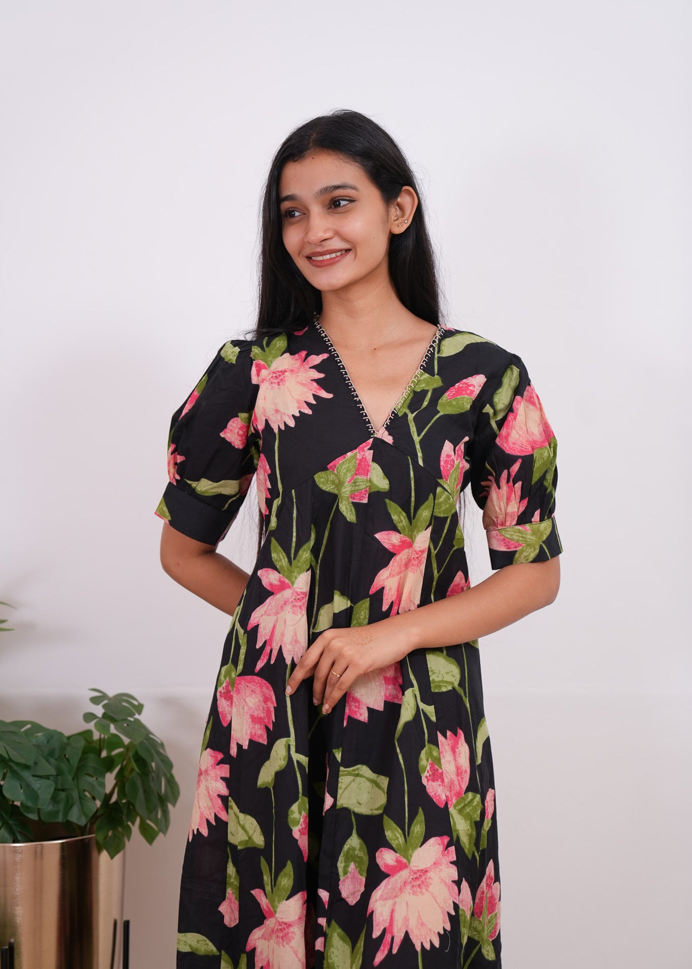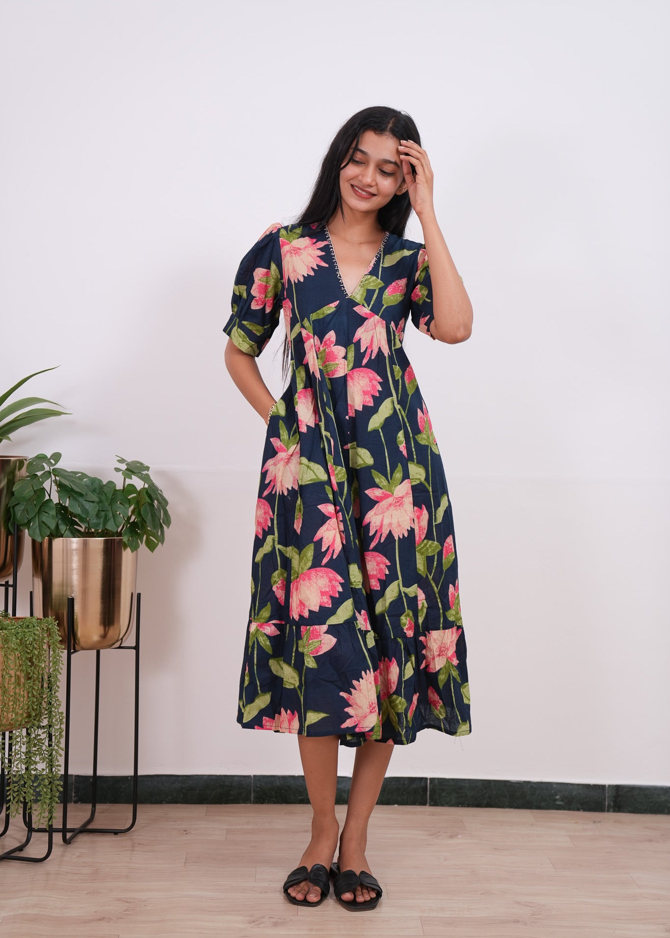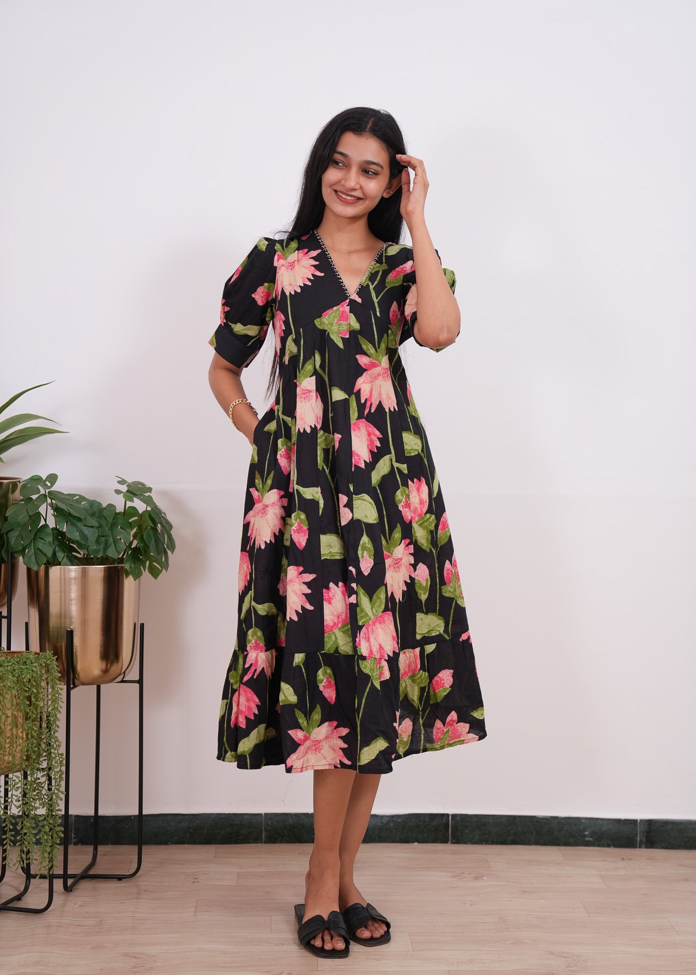 Black lillies cotton midi dress