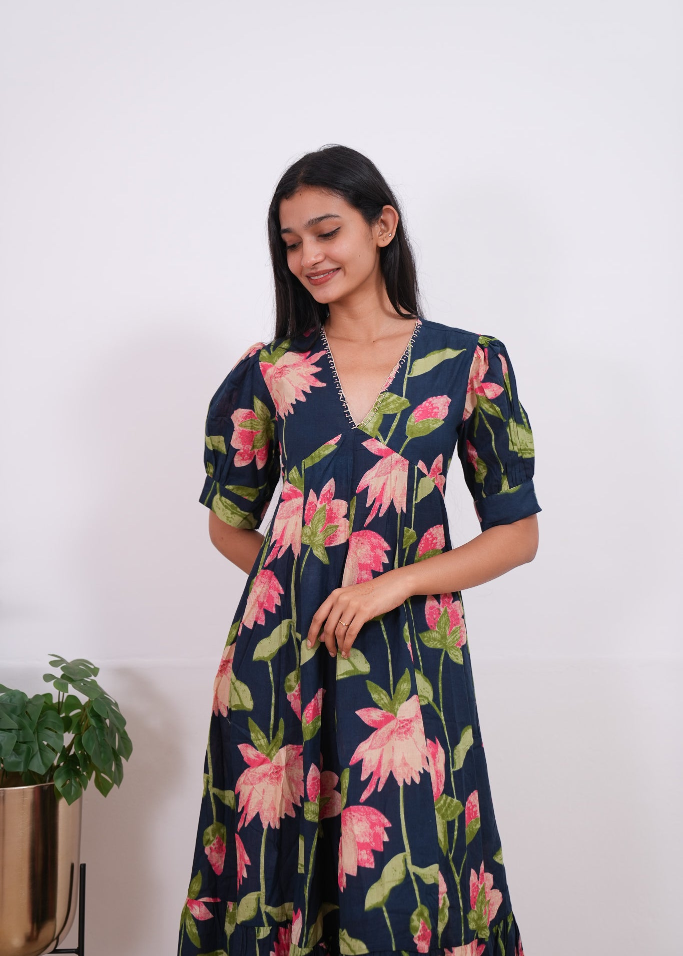 Navy lillies cotton midi dress