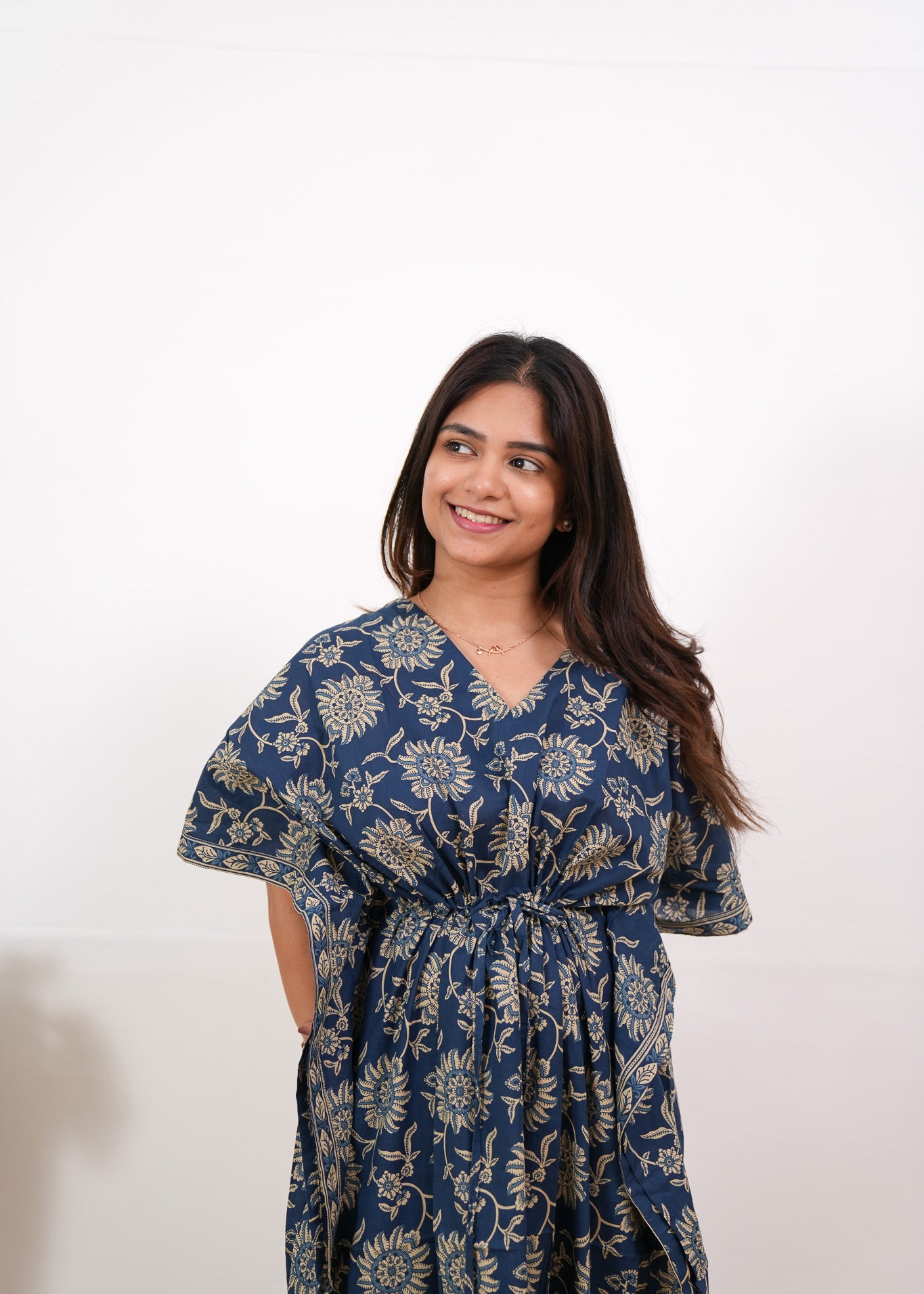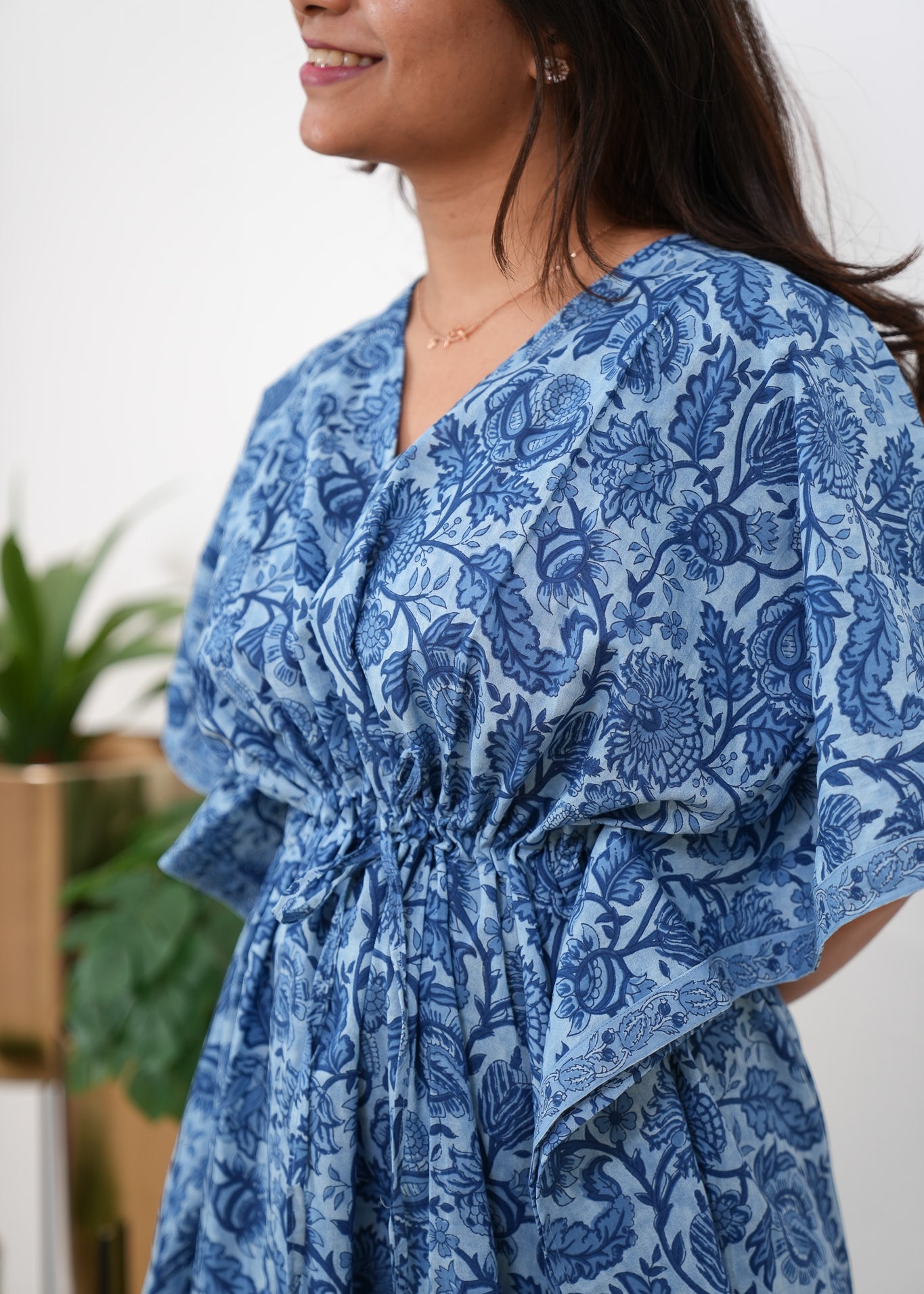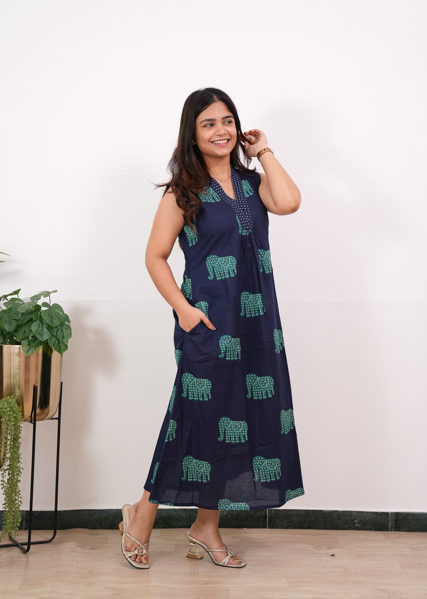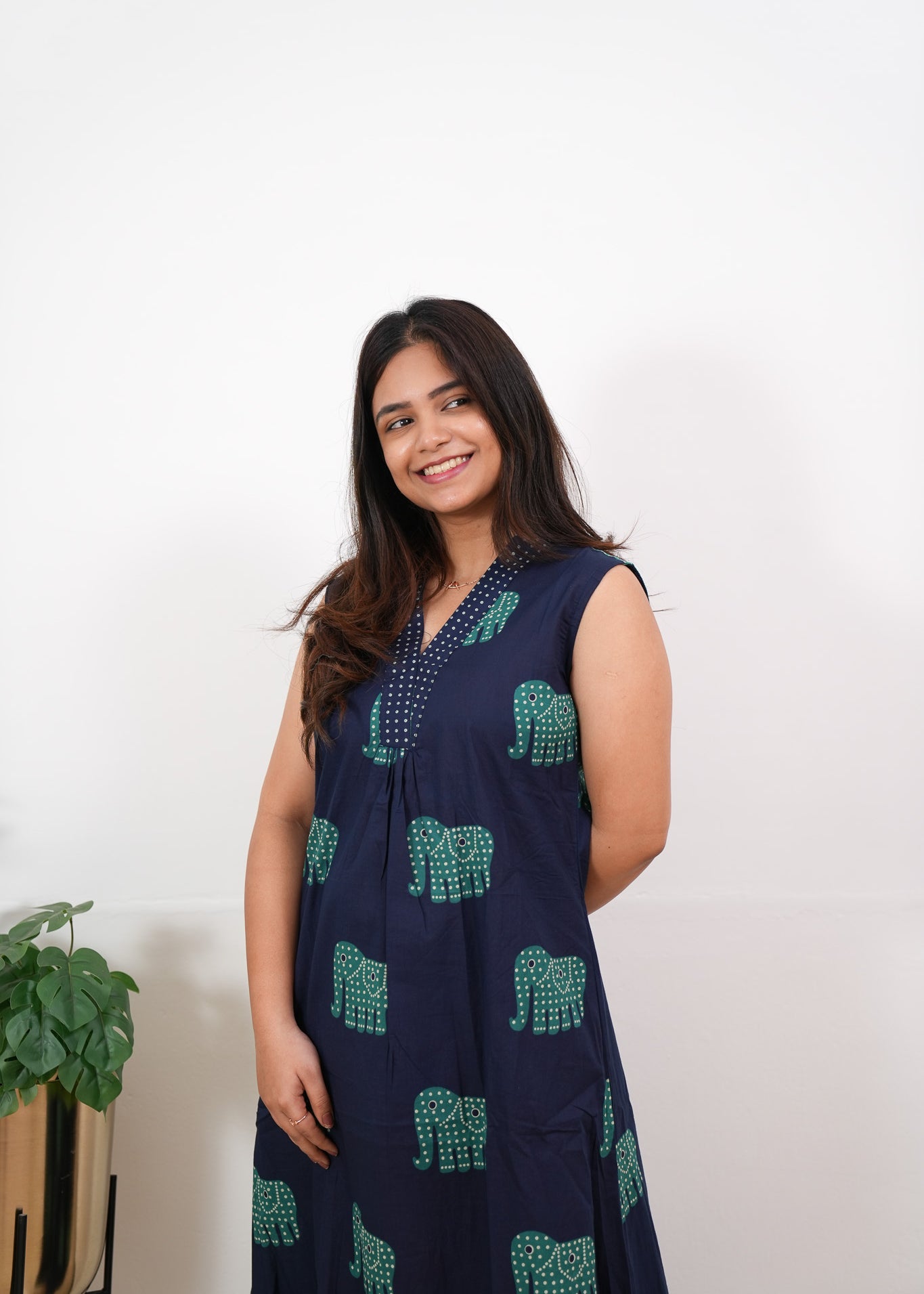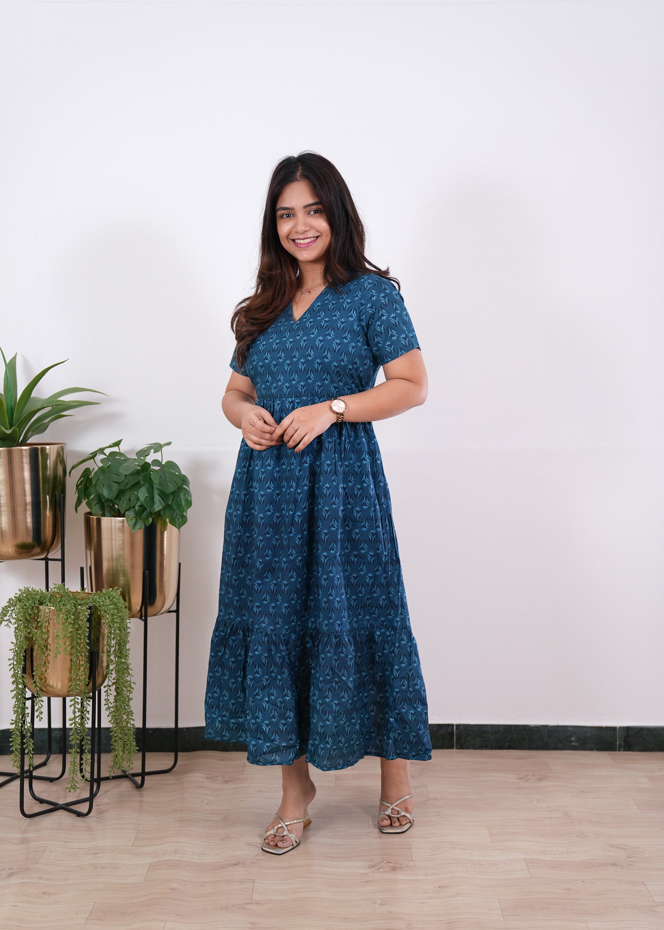Ira cotton v neck gathered dress-Royal elephant(attached sleeves)