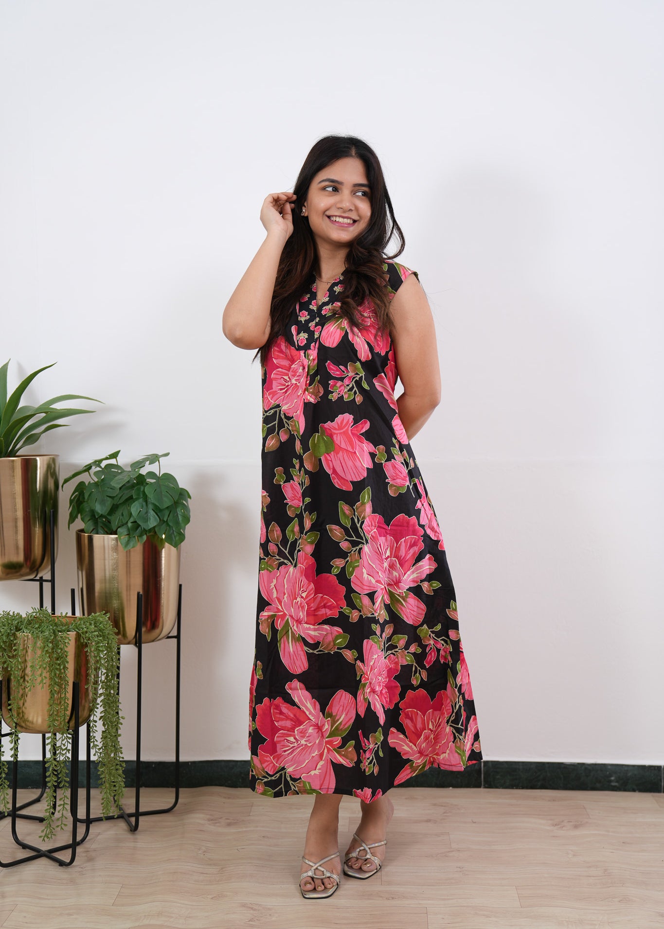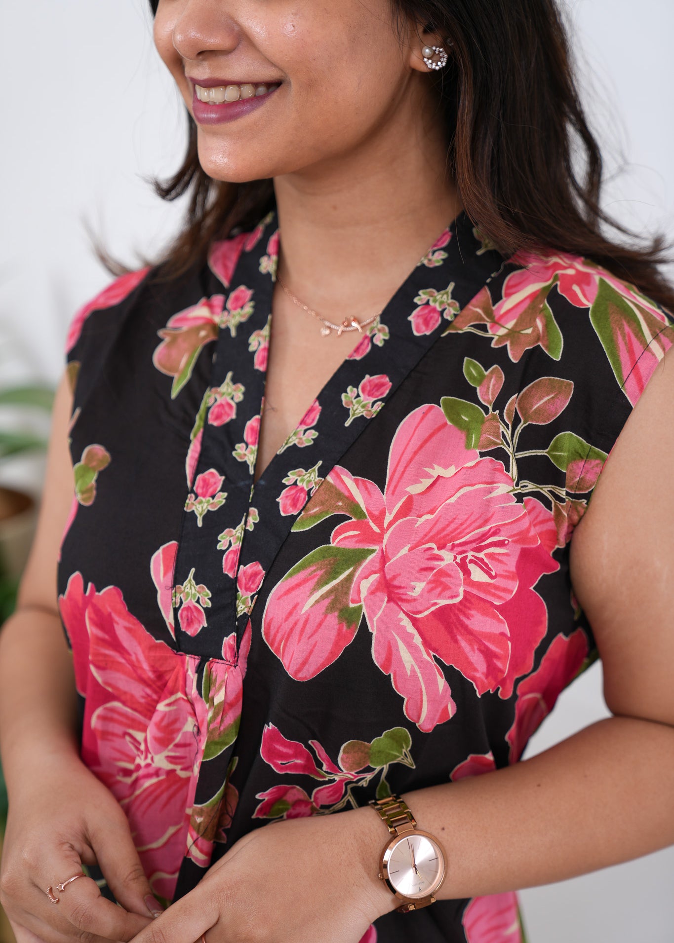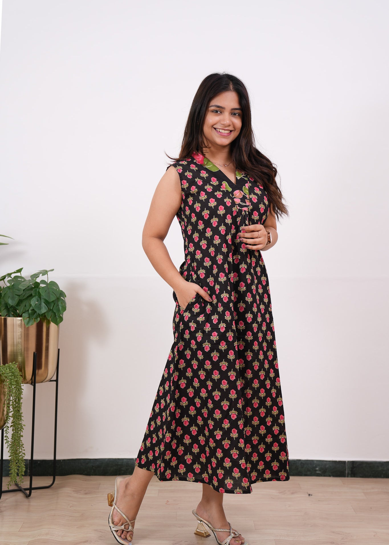 Ira cotton v neck gathered dress-Black rose (attached sleeves)