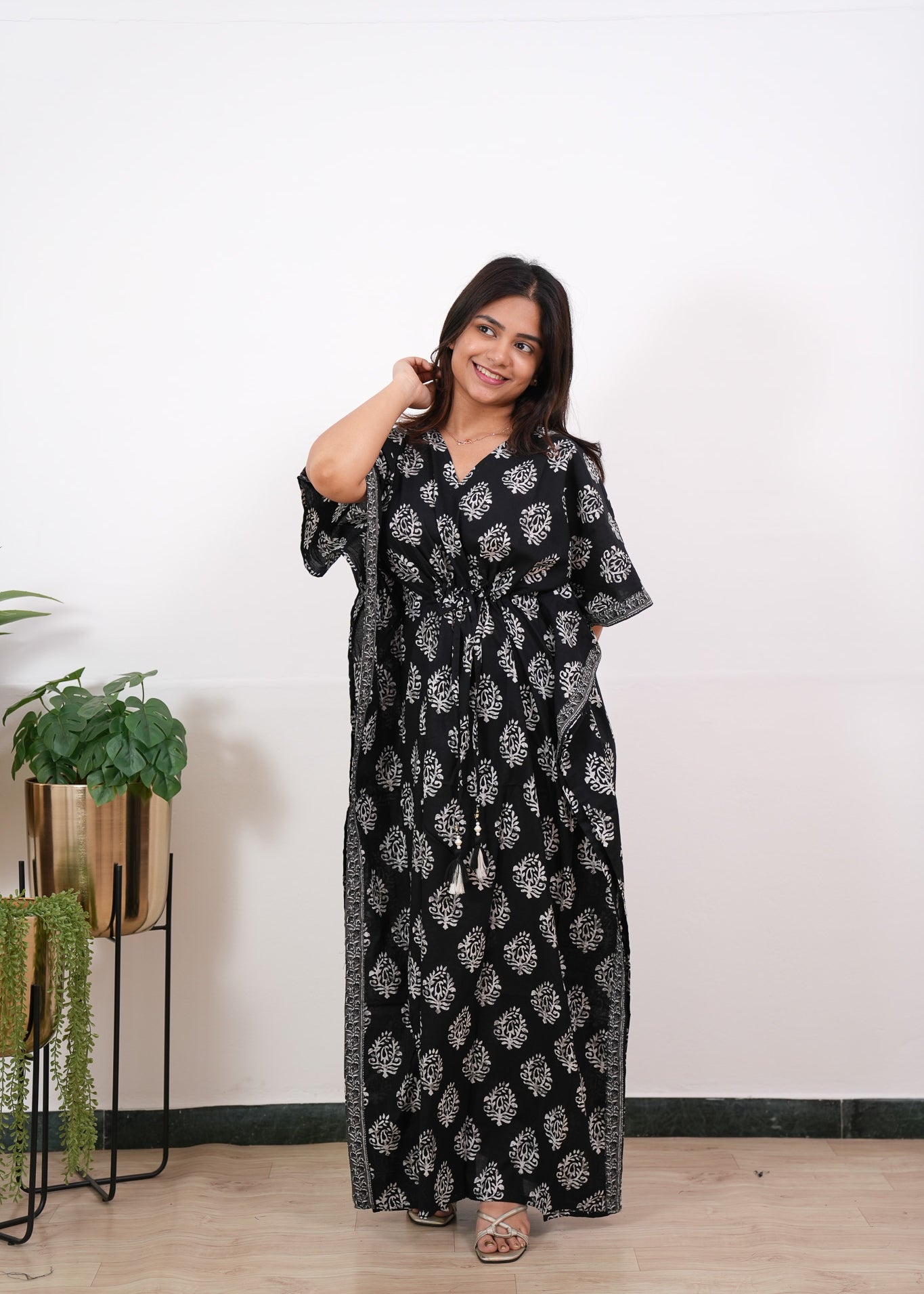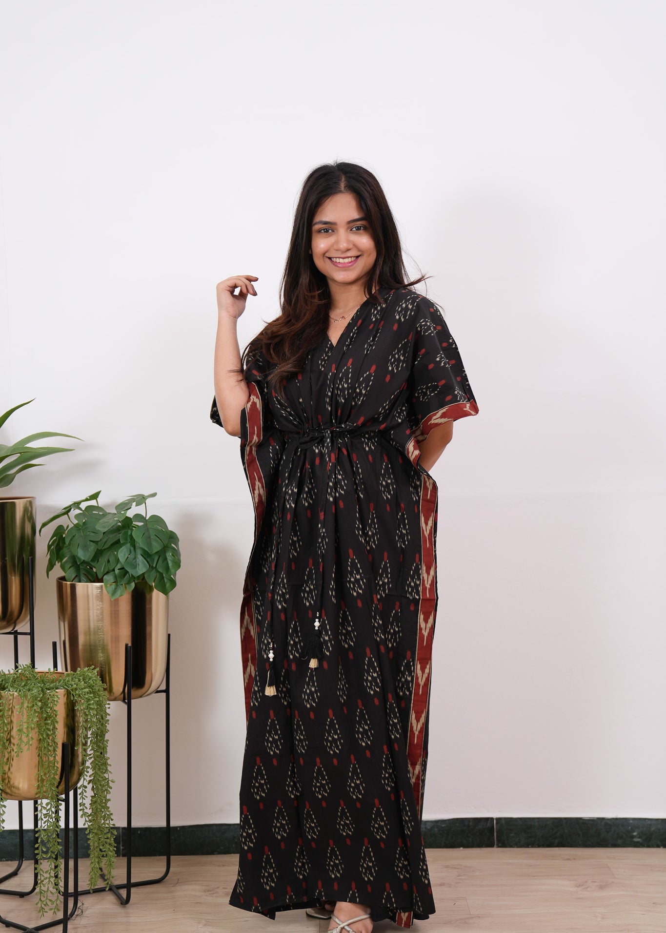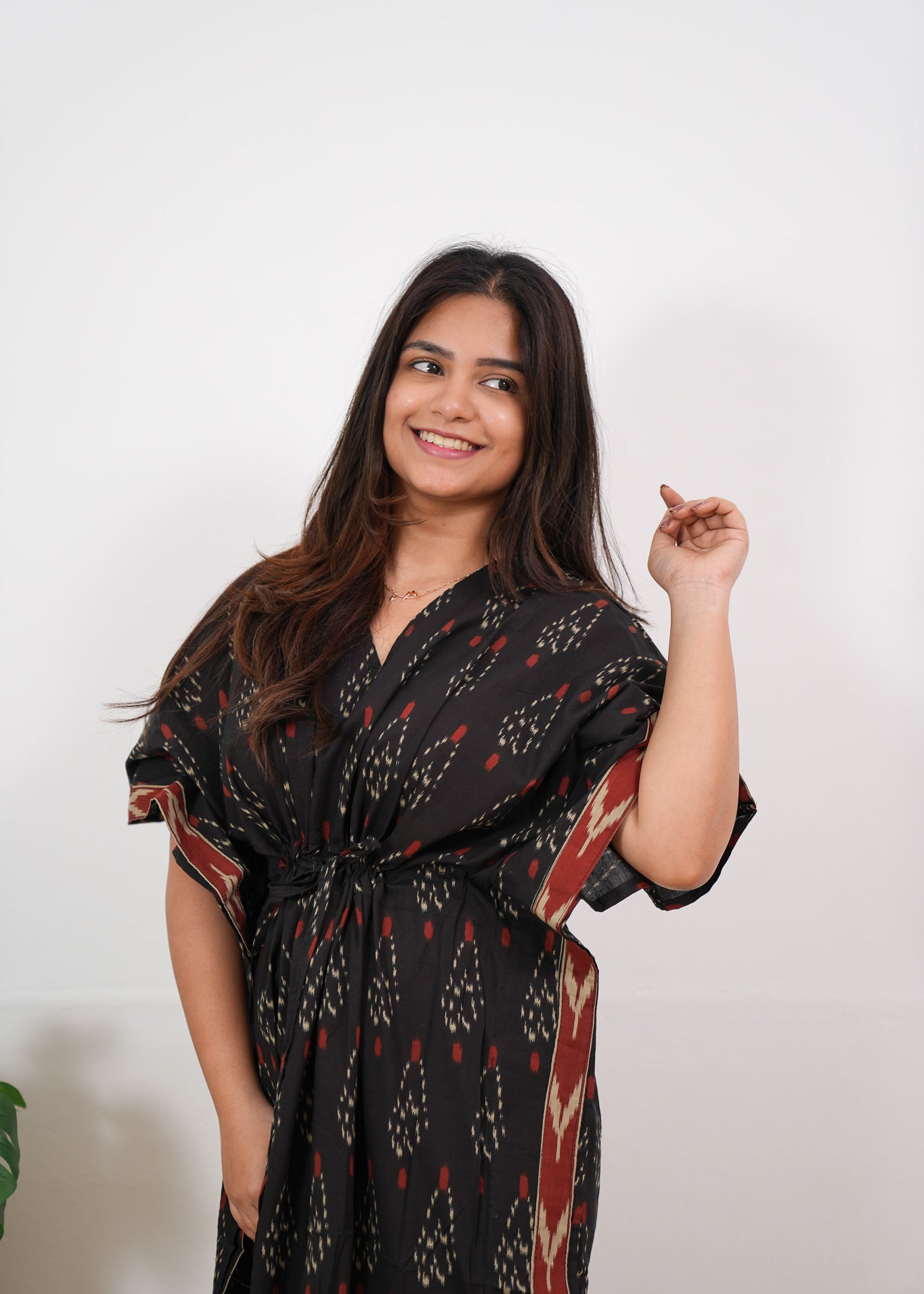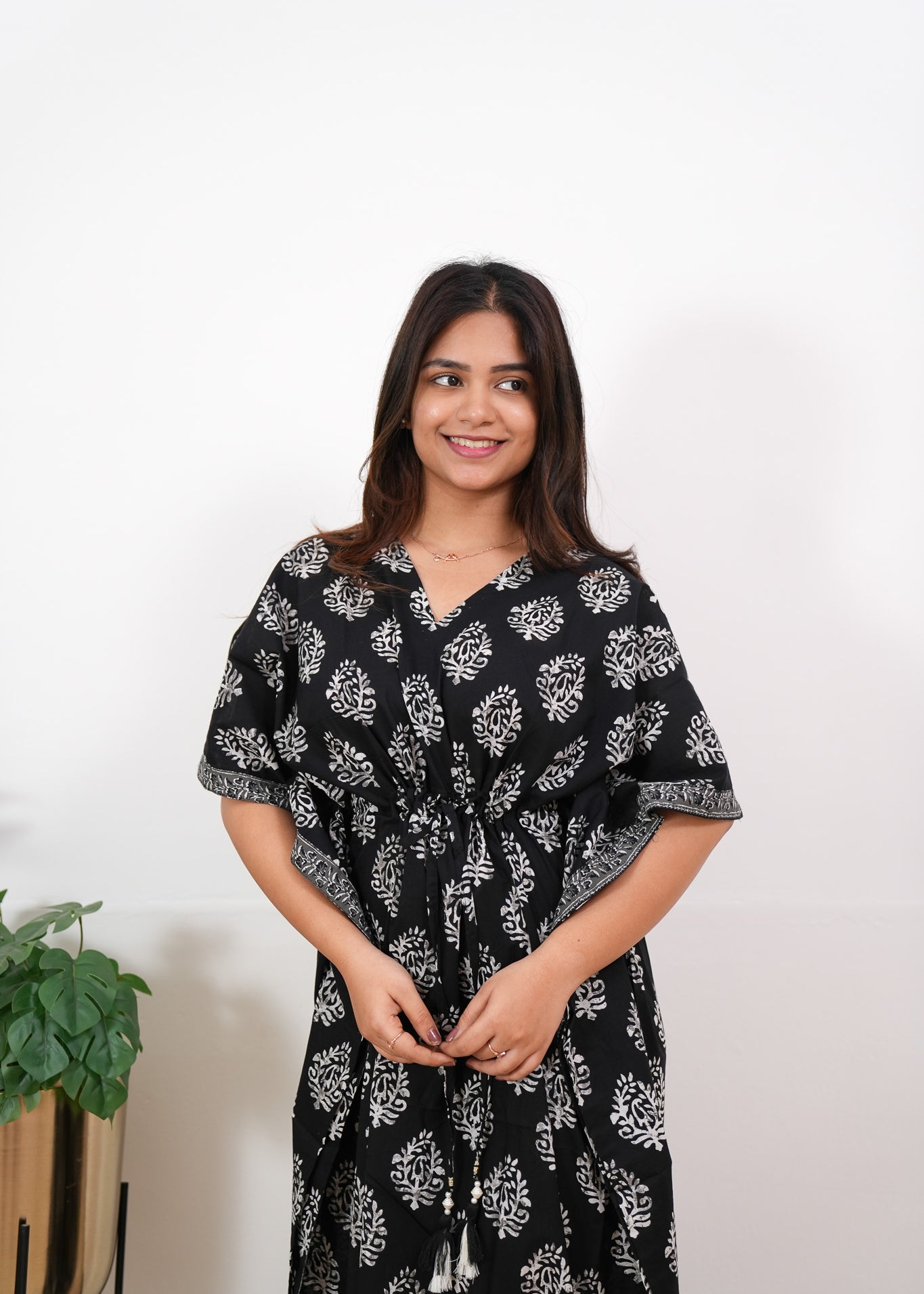 Ira cotton v neck gathered dress-Black rose (attached sleeves)