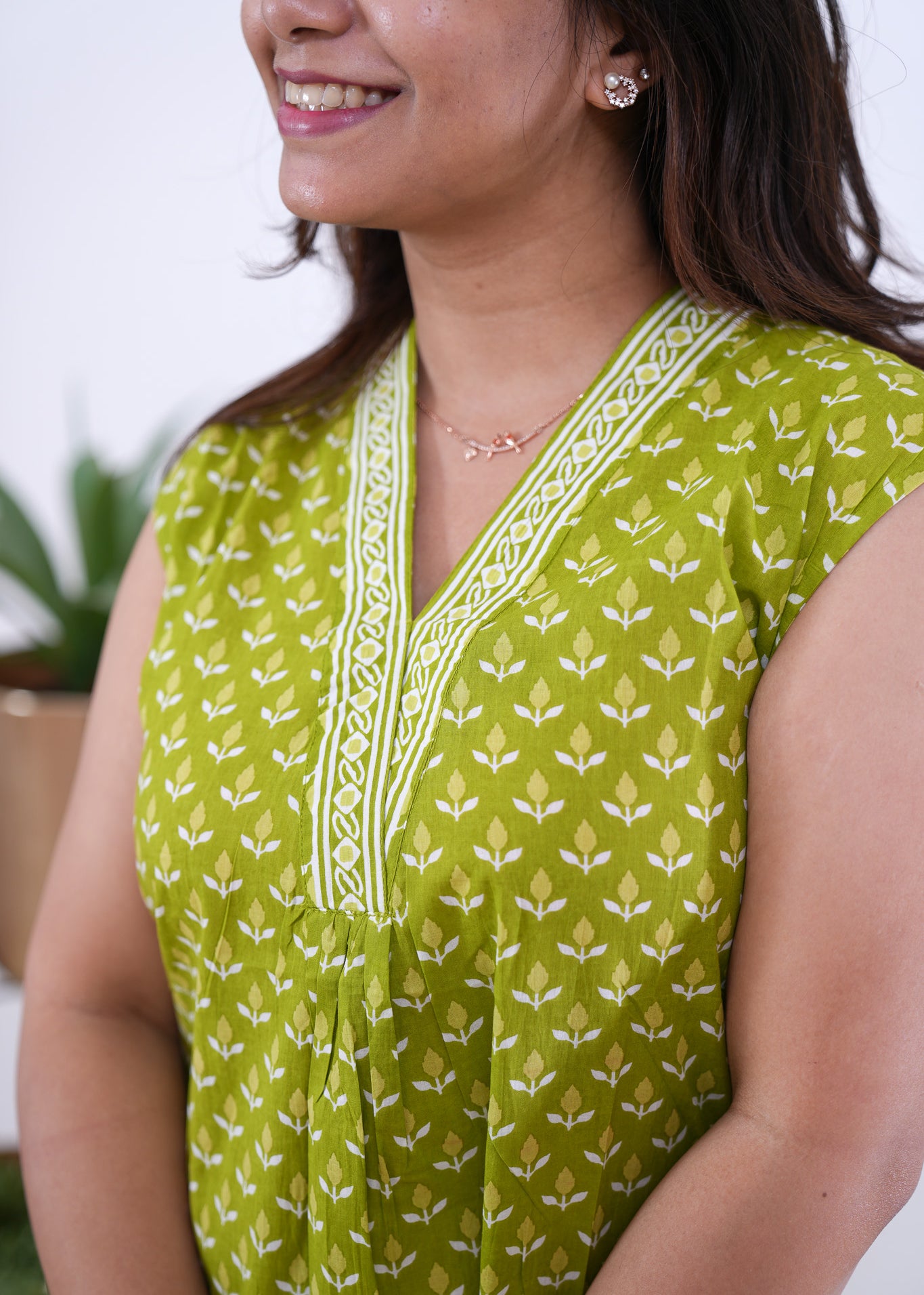 Ira cotton v neck gathered dress-Lime green (attached sleeves)