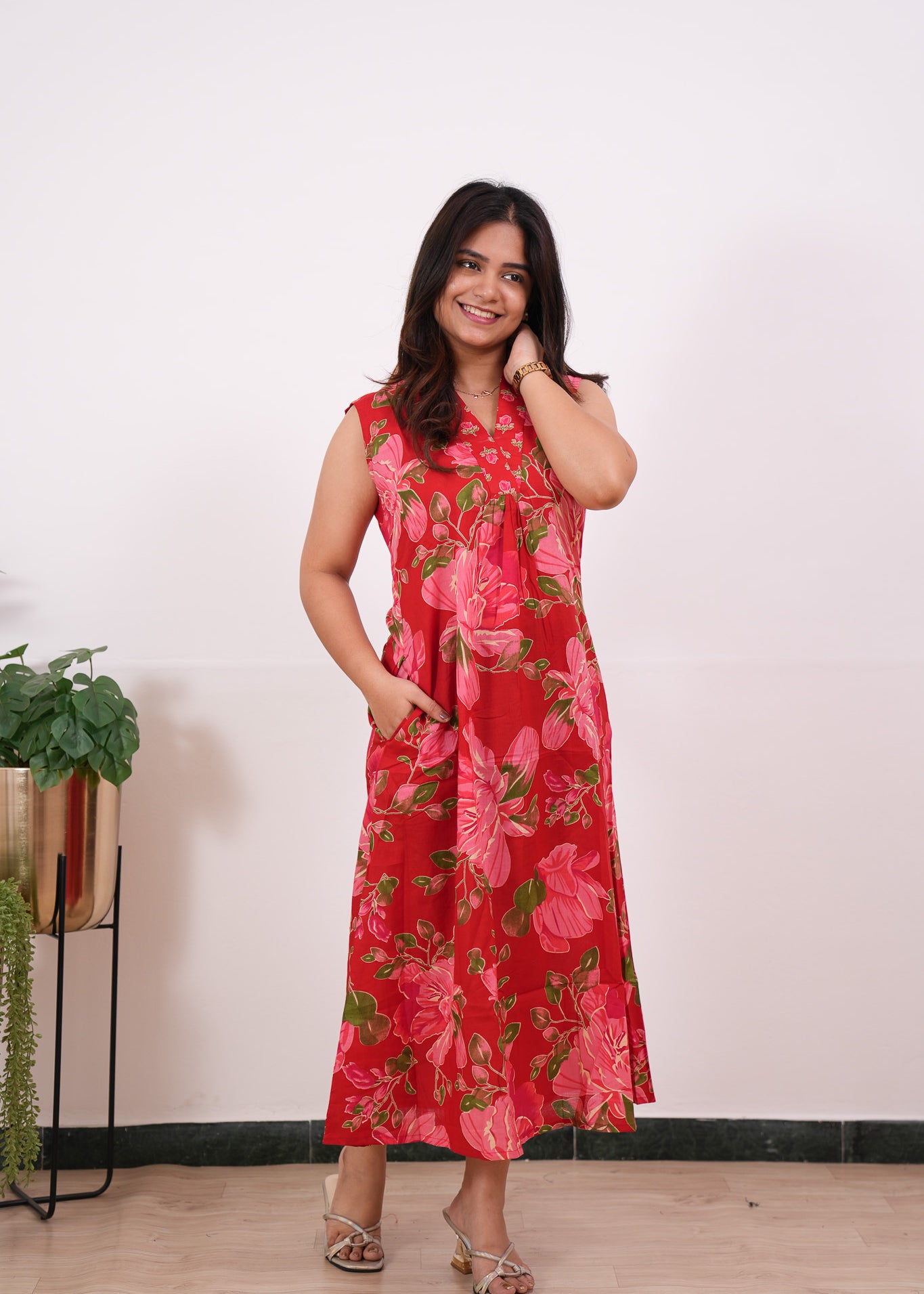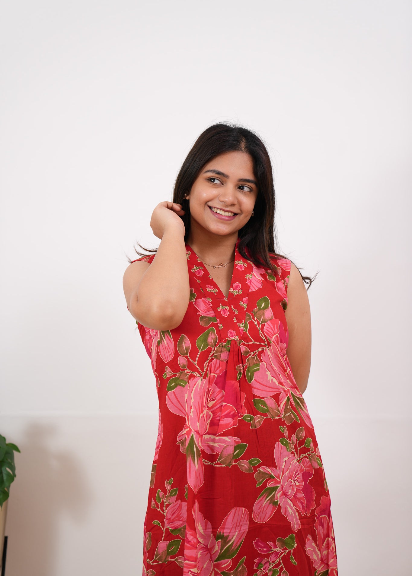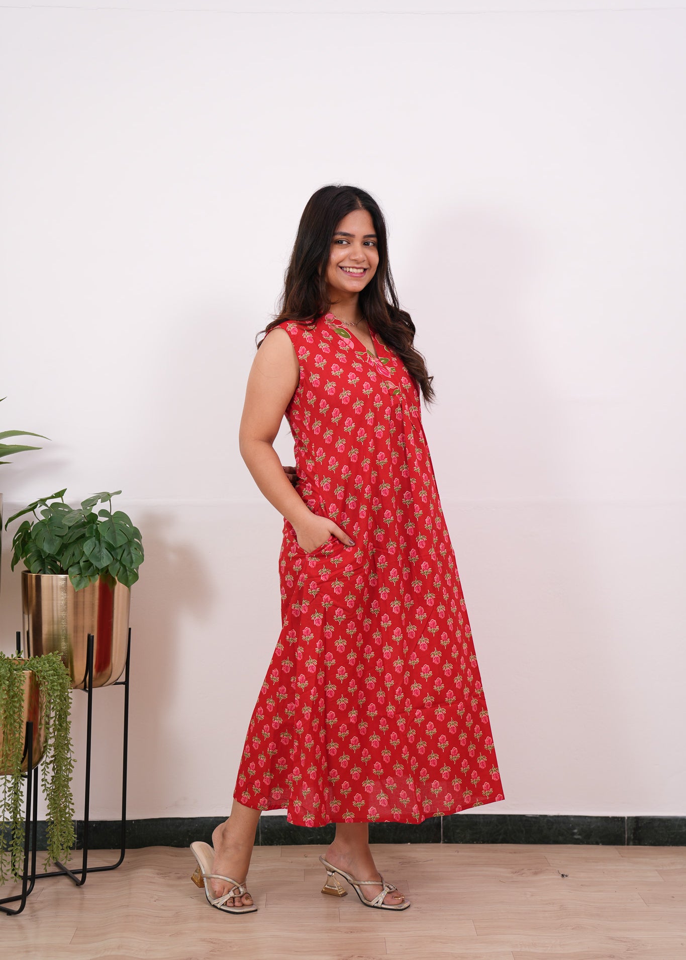 Ira cotton v neck gathered dress-Red rose (attached sleeves)