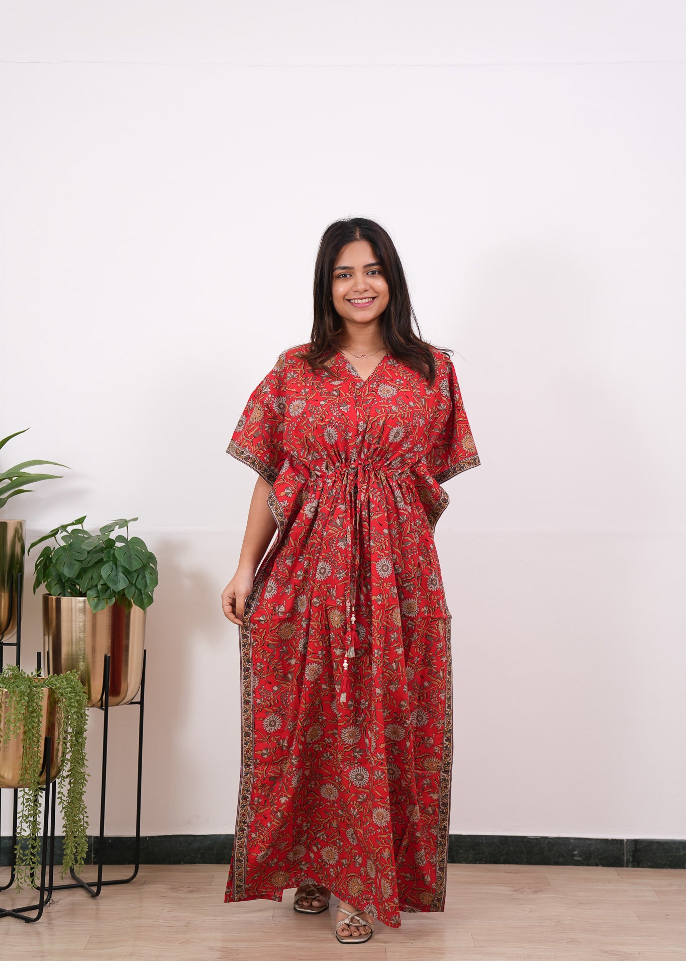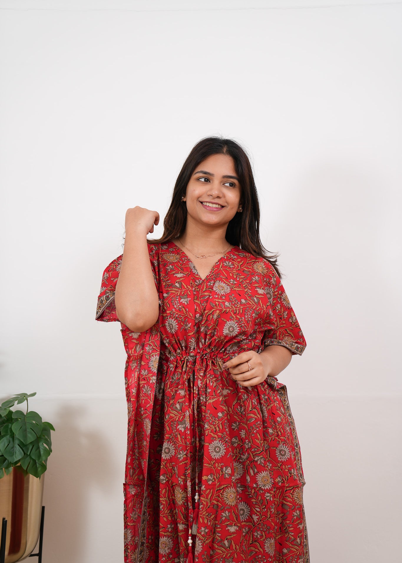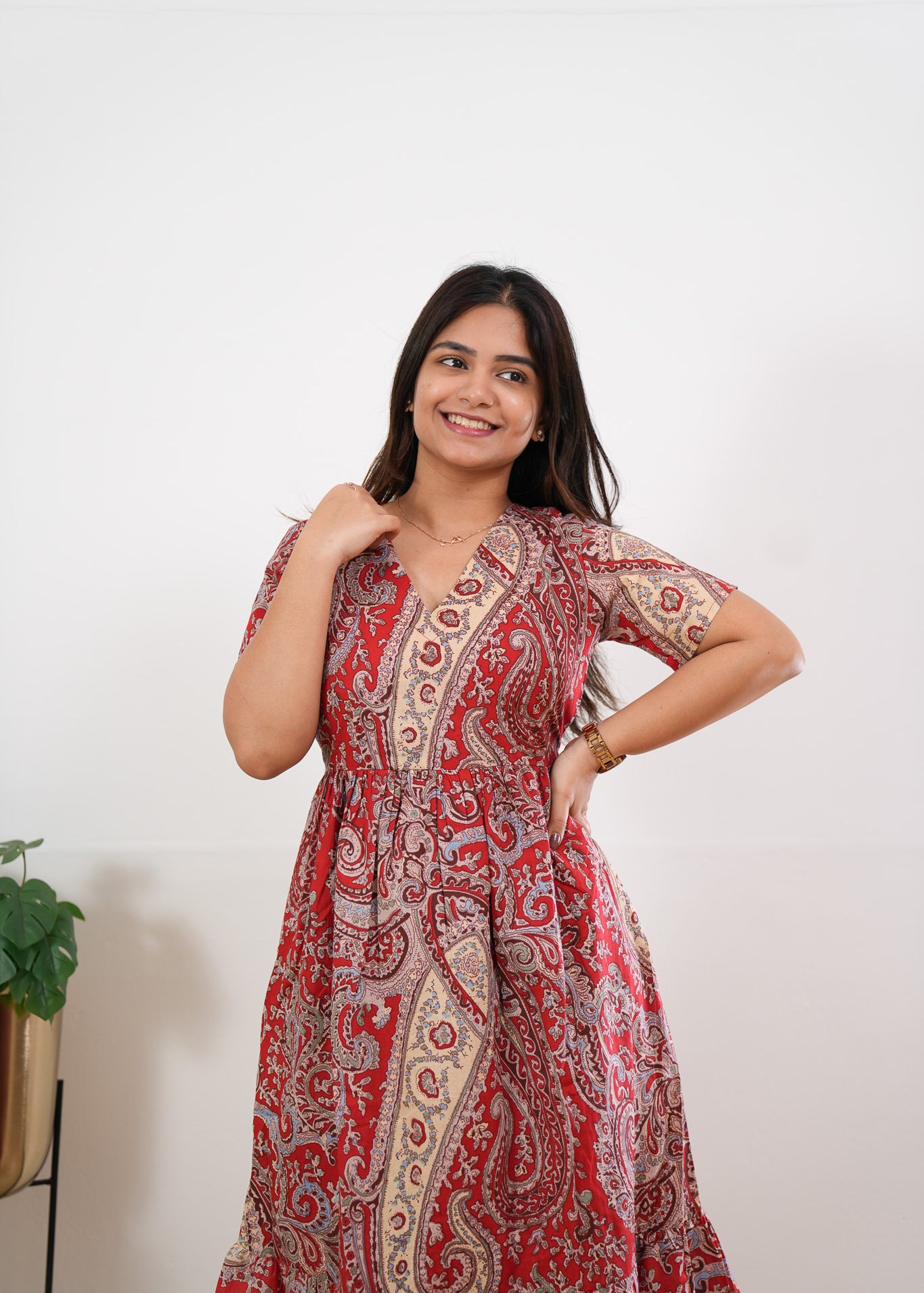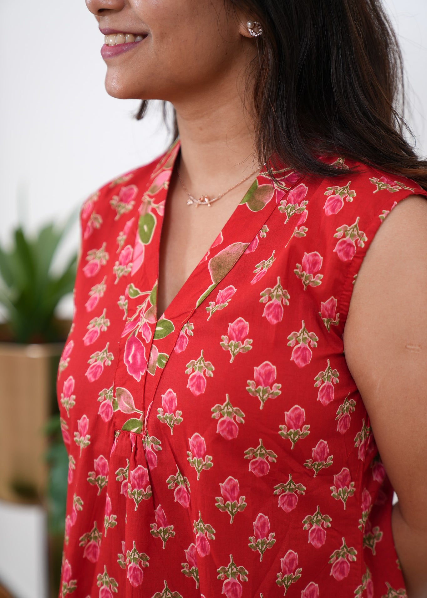Ira cotton v neck gathered dress-Red rose (attached sleeves)
