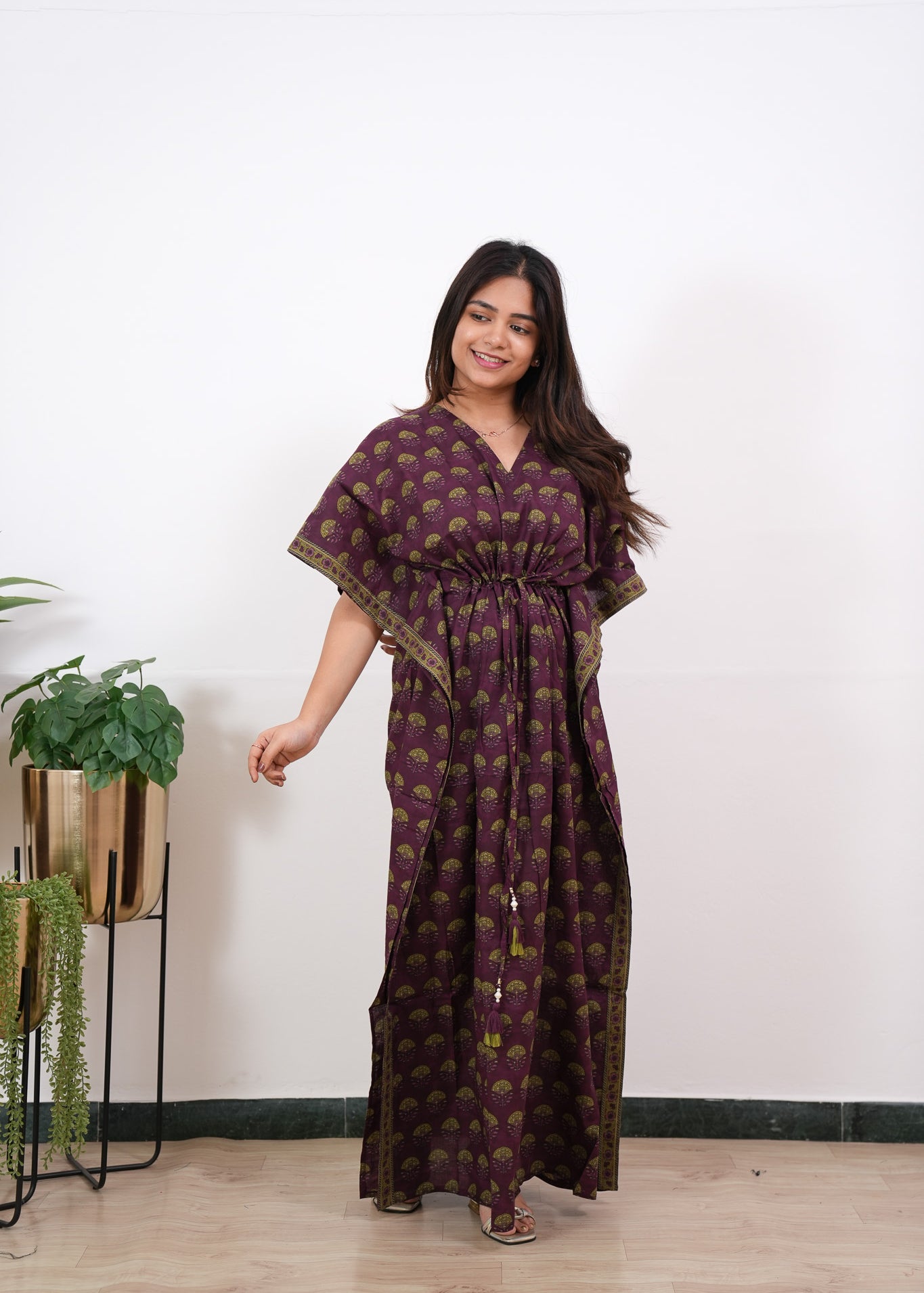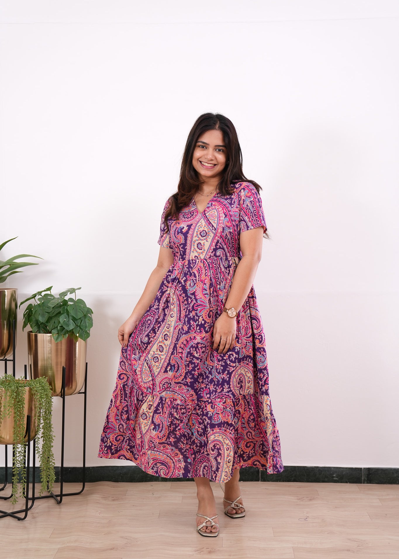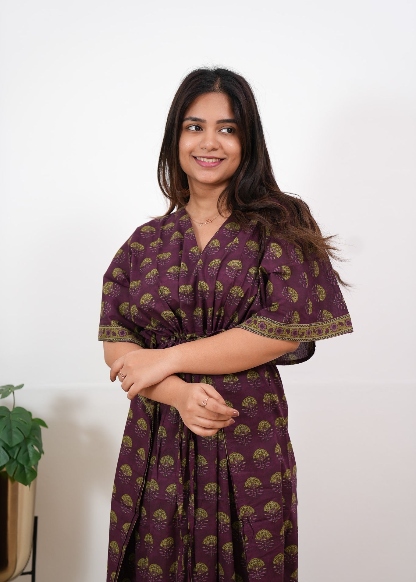 Ira cotton v neck gathered dress-Black orchid (attached sleeves)