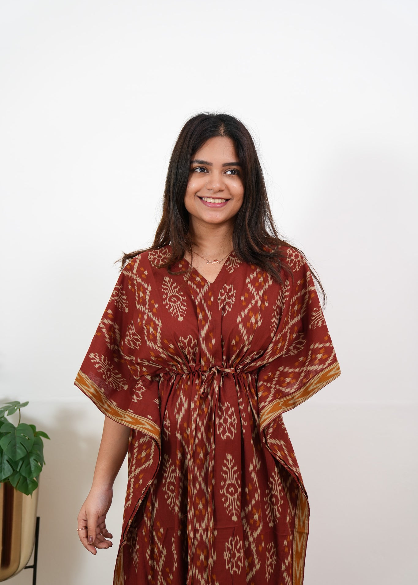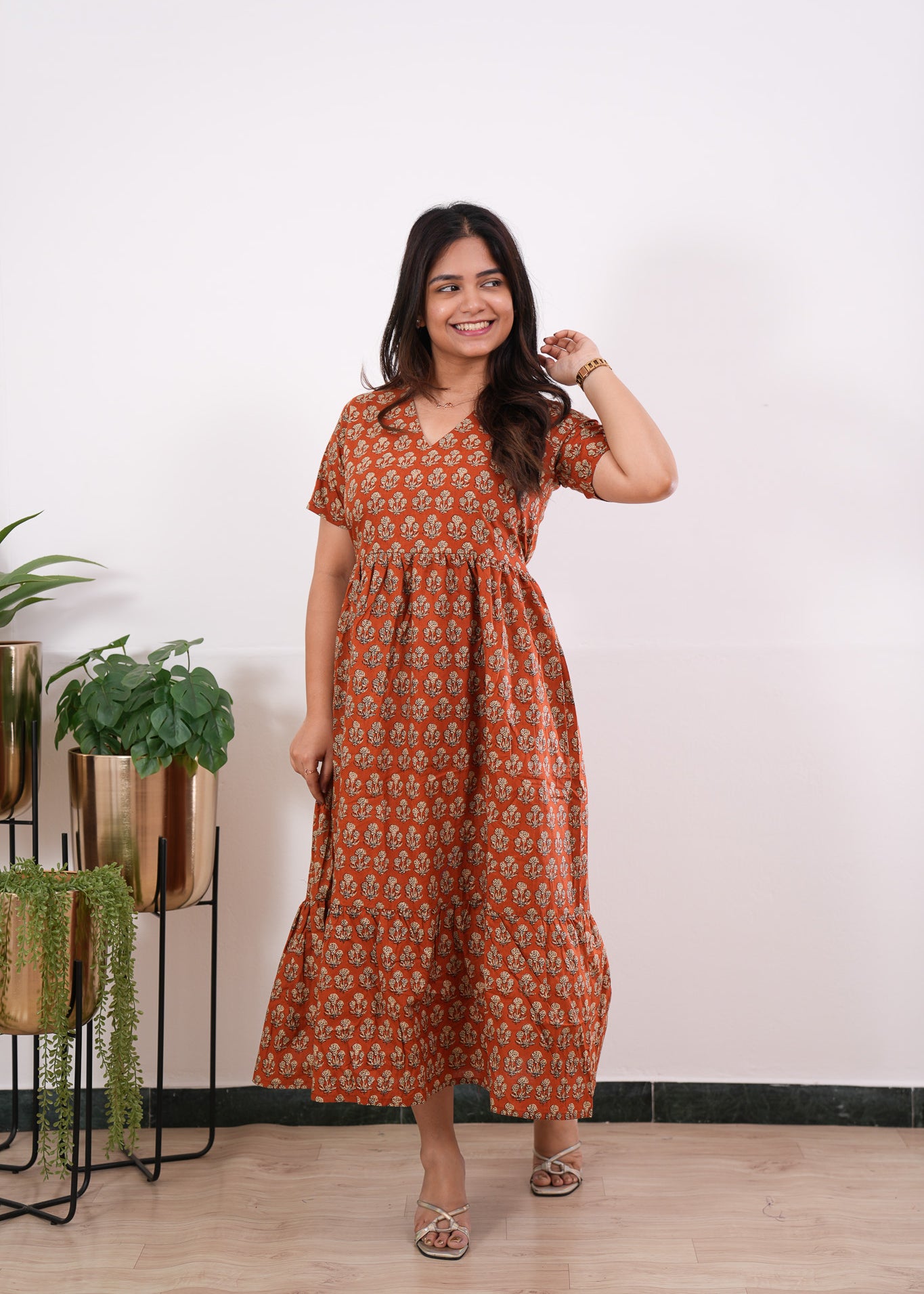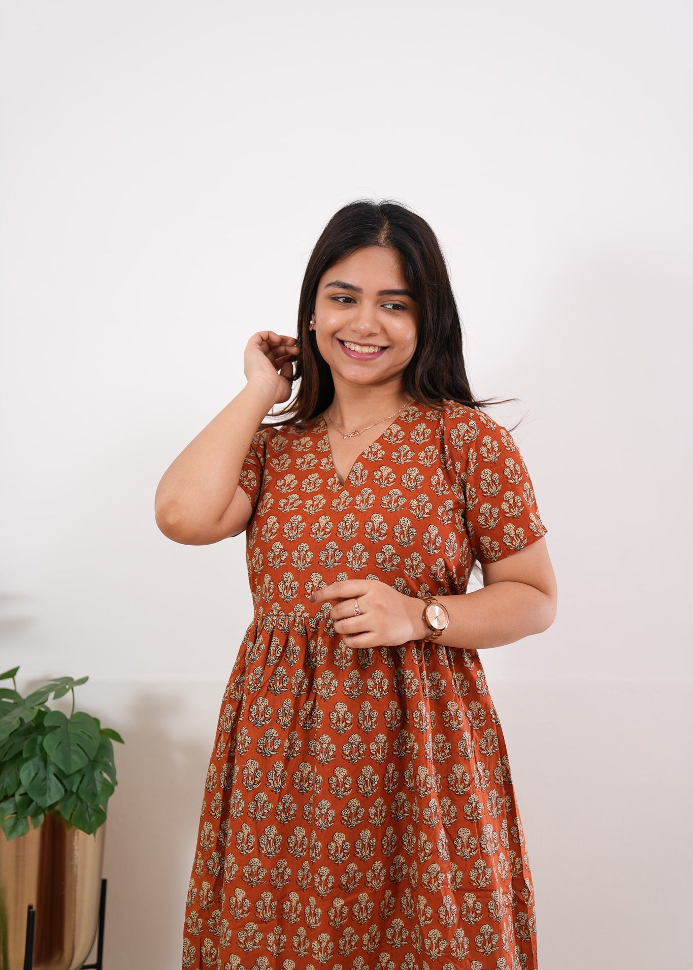 Ira cotton v neck gathered dress-Orange (attached sleeves)