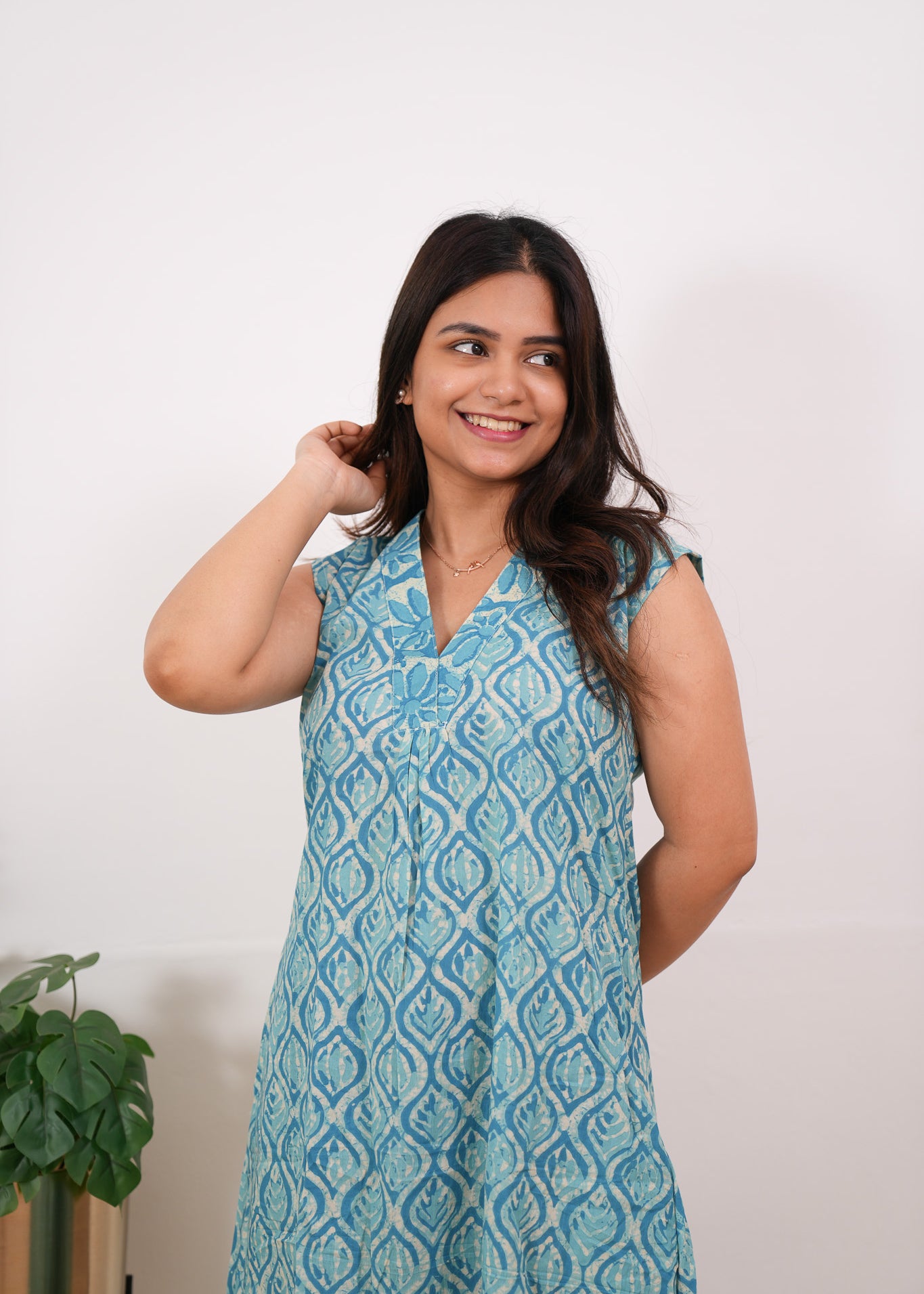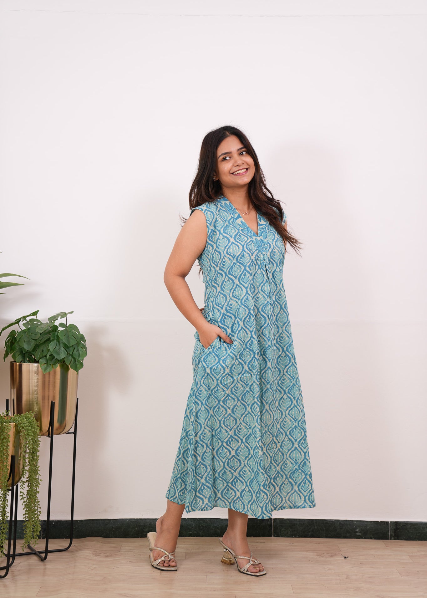 Ira cotton v neck gathered dress-Ocean(attached sleeves)