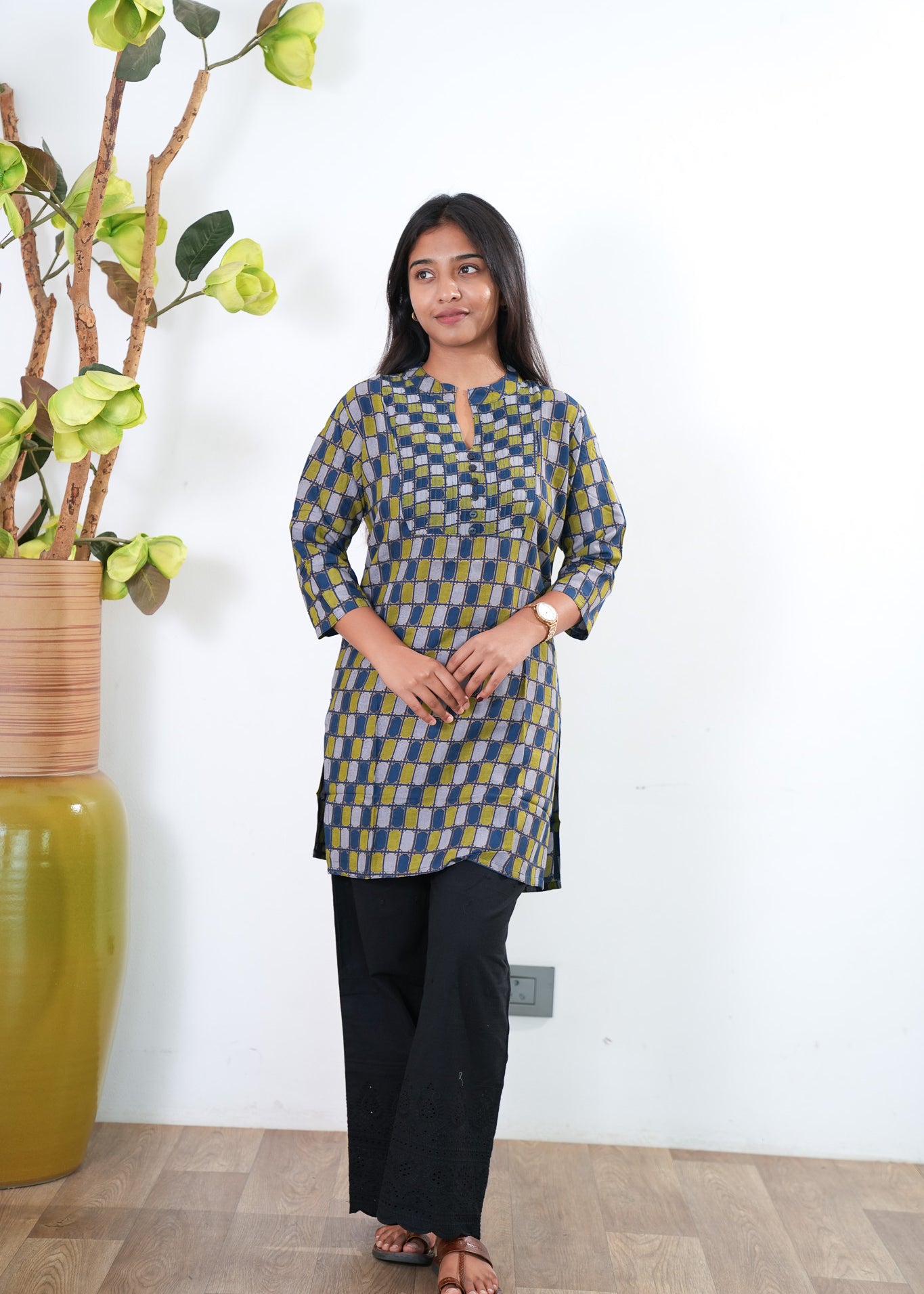 Black and beige block cotton short kurti