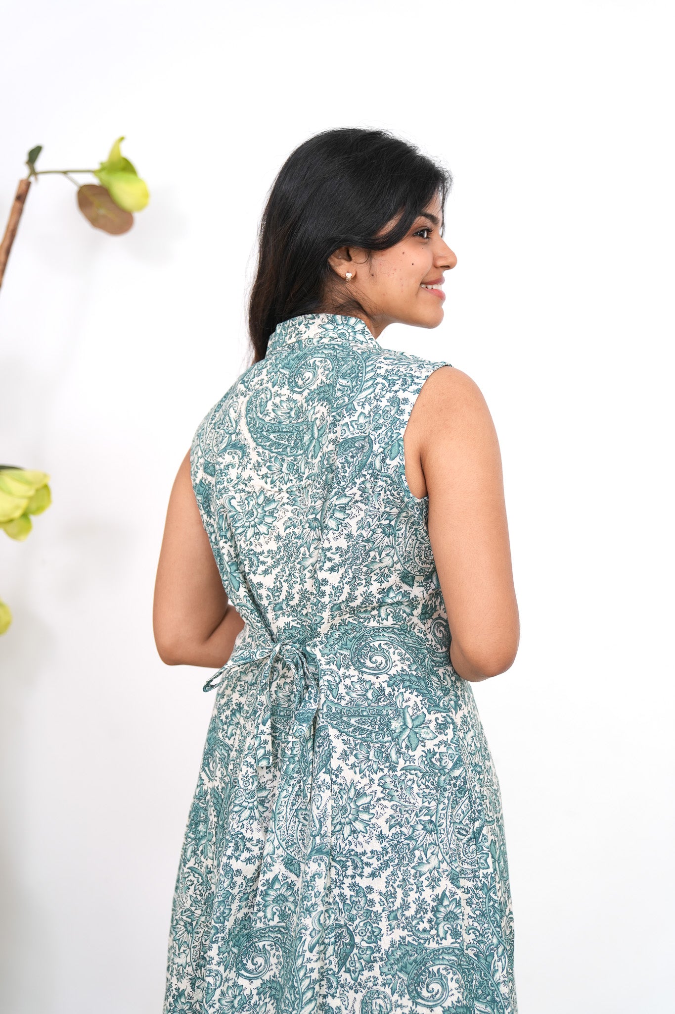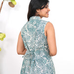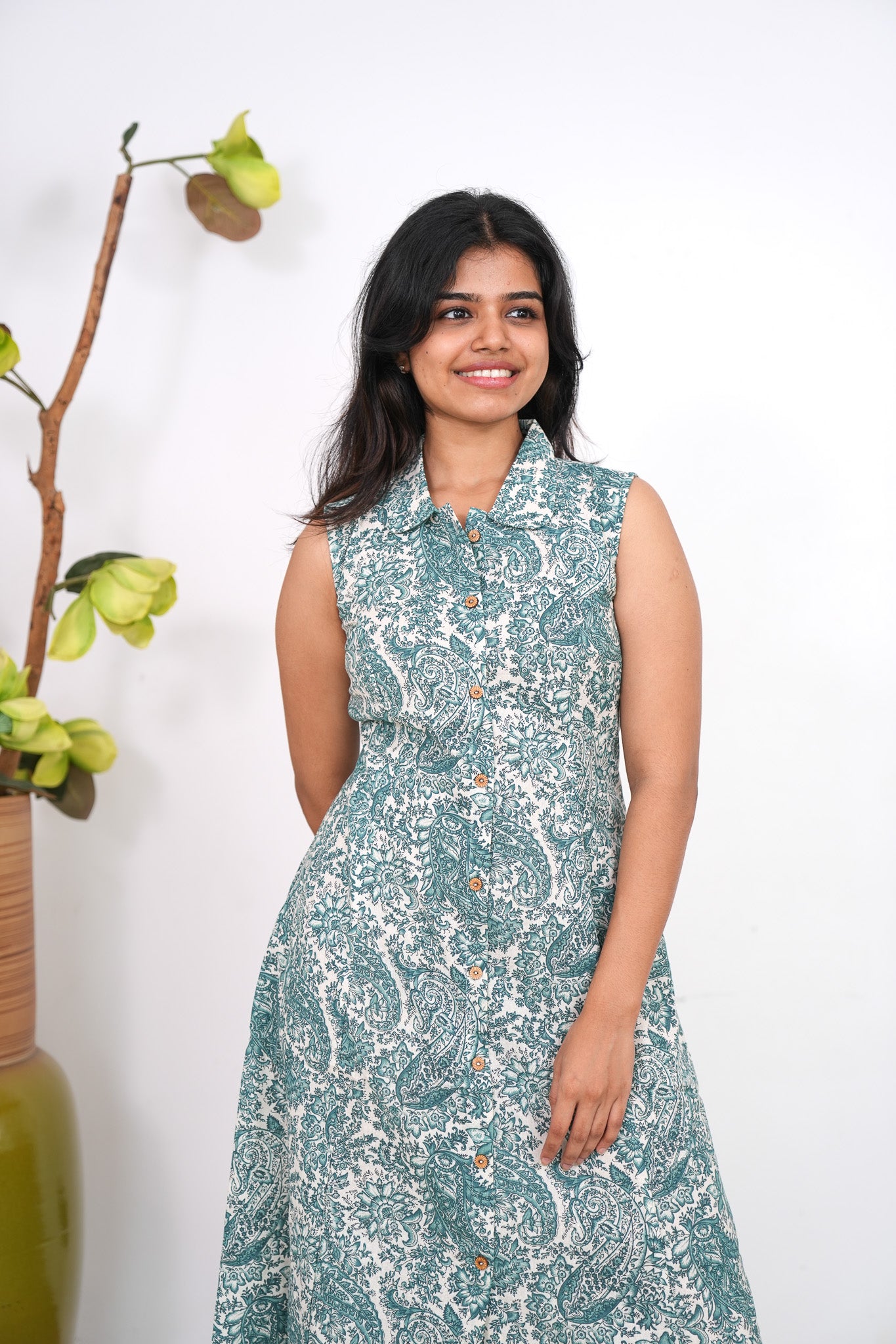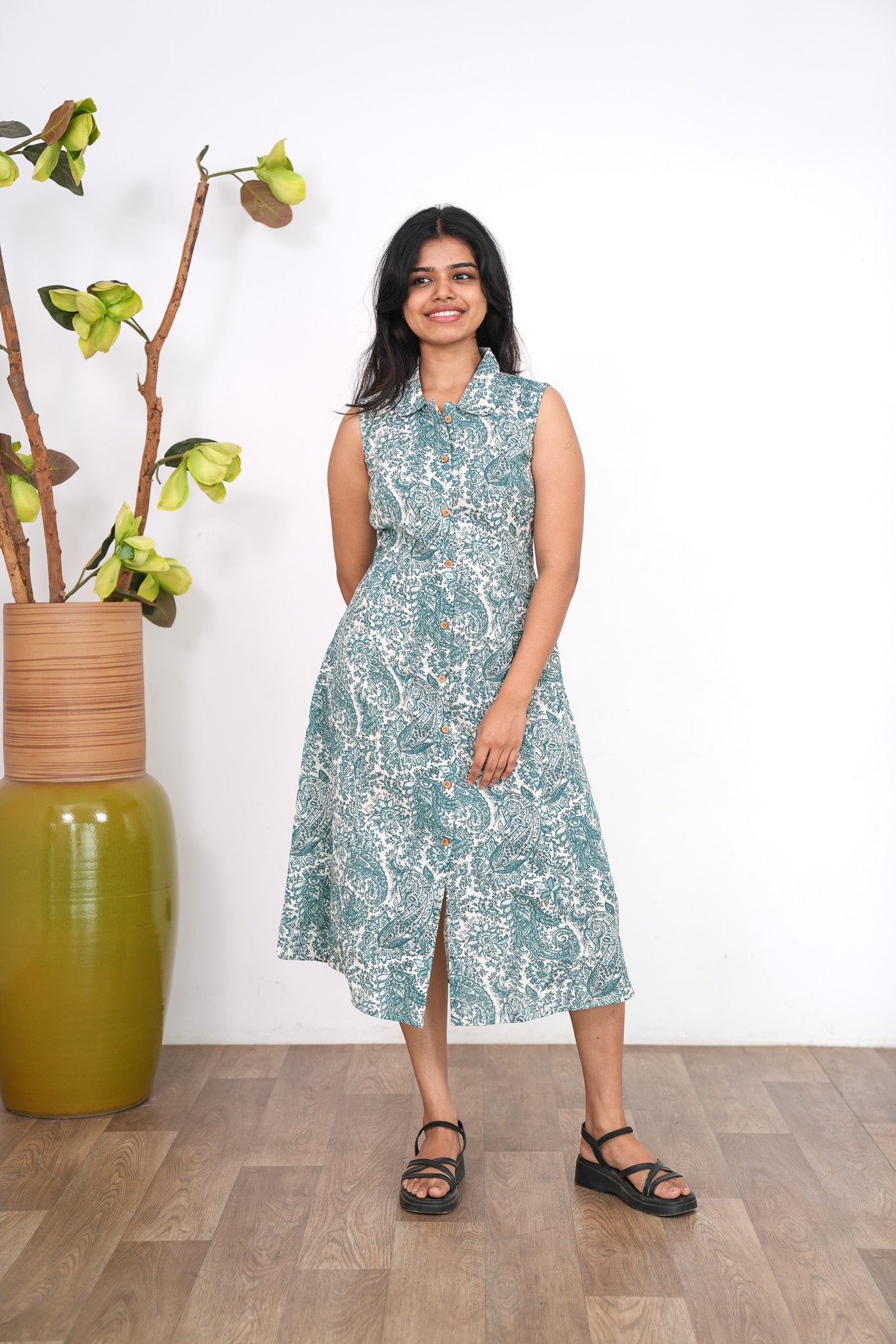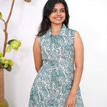 Baby blue cotton shirt dress that exudes elegance and sophistication. It has buttons running down.