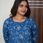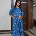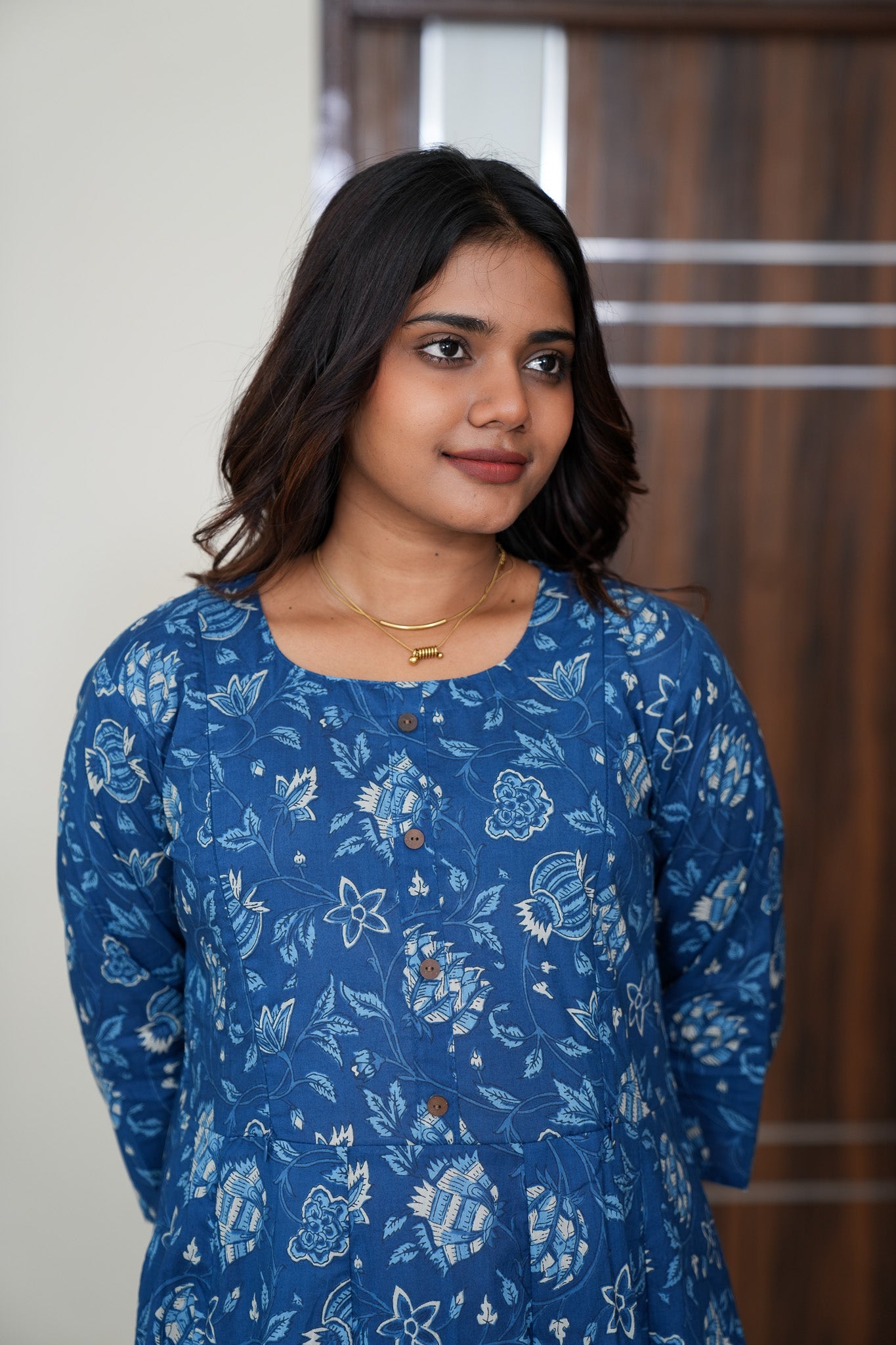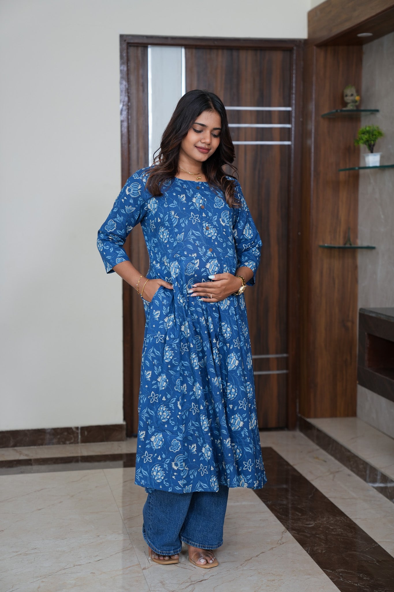 Blue maternity nursing wear with round neck and 3/4 sleeves that accomodates the bump throughout nine months and has invisible zip on both sides to carefully feed baby. It is light weight and soft to help you get through pregnancy and breastfeeding journey with ease.