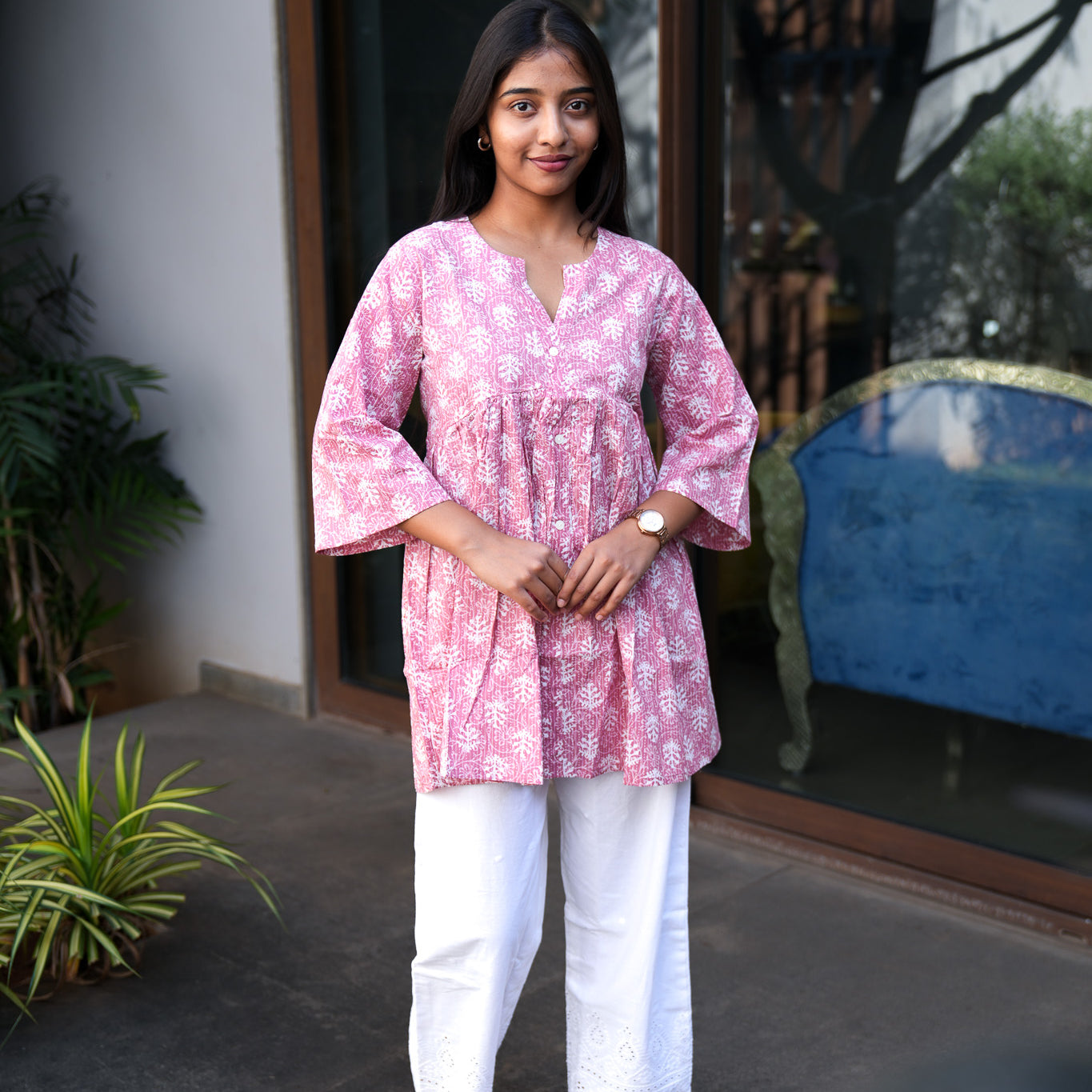 Pink coloured peplum style cotton short kurti with round neck and elbow length sleeves, they are extremely breathable and light weight making it perfect for all day comfort.