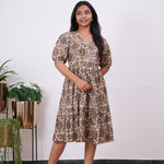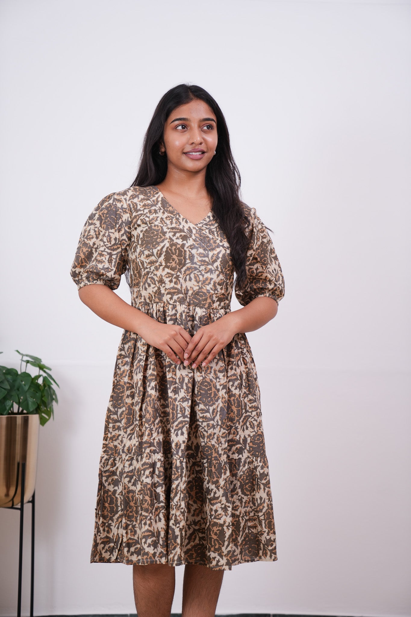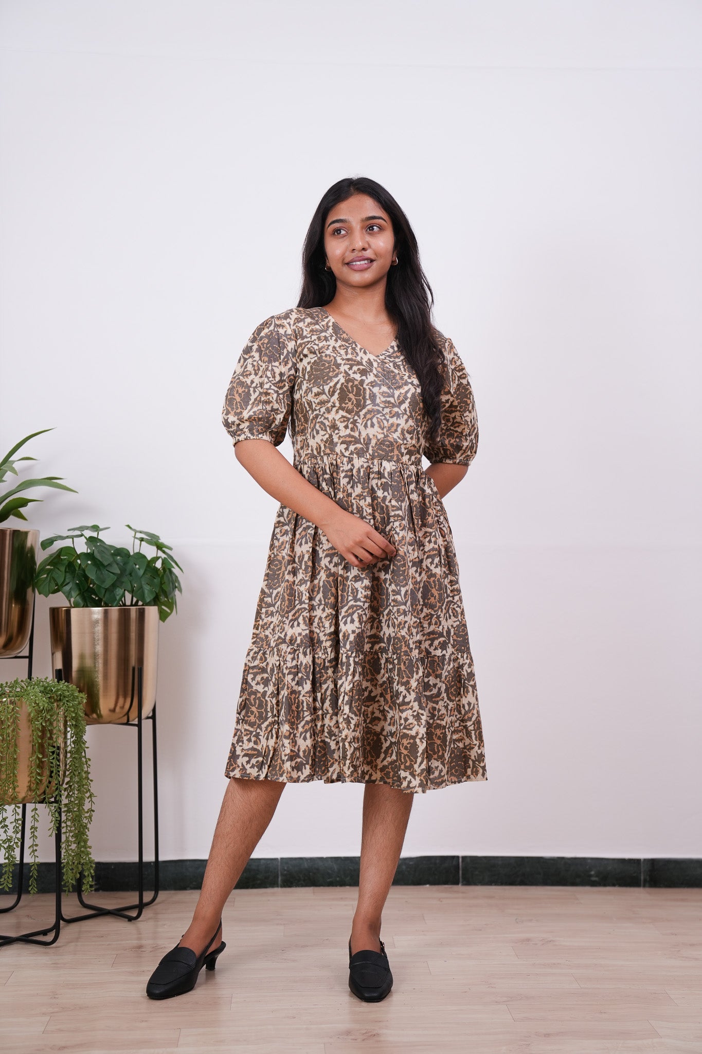 Beige and mustard V neck cotton dress with half sleeves. The fabric and prints are top notch.. which are perfect for brunch, shopping or just a cozy day at home!! You can wear just as a dress or add jeans to add some modesty whichever you find it suitable and comfortable..