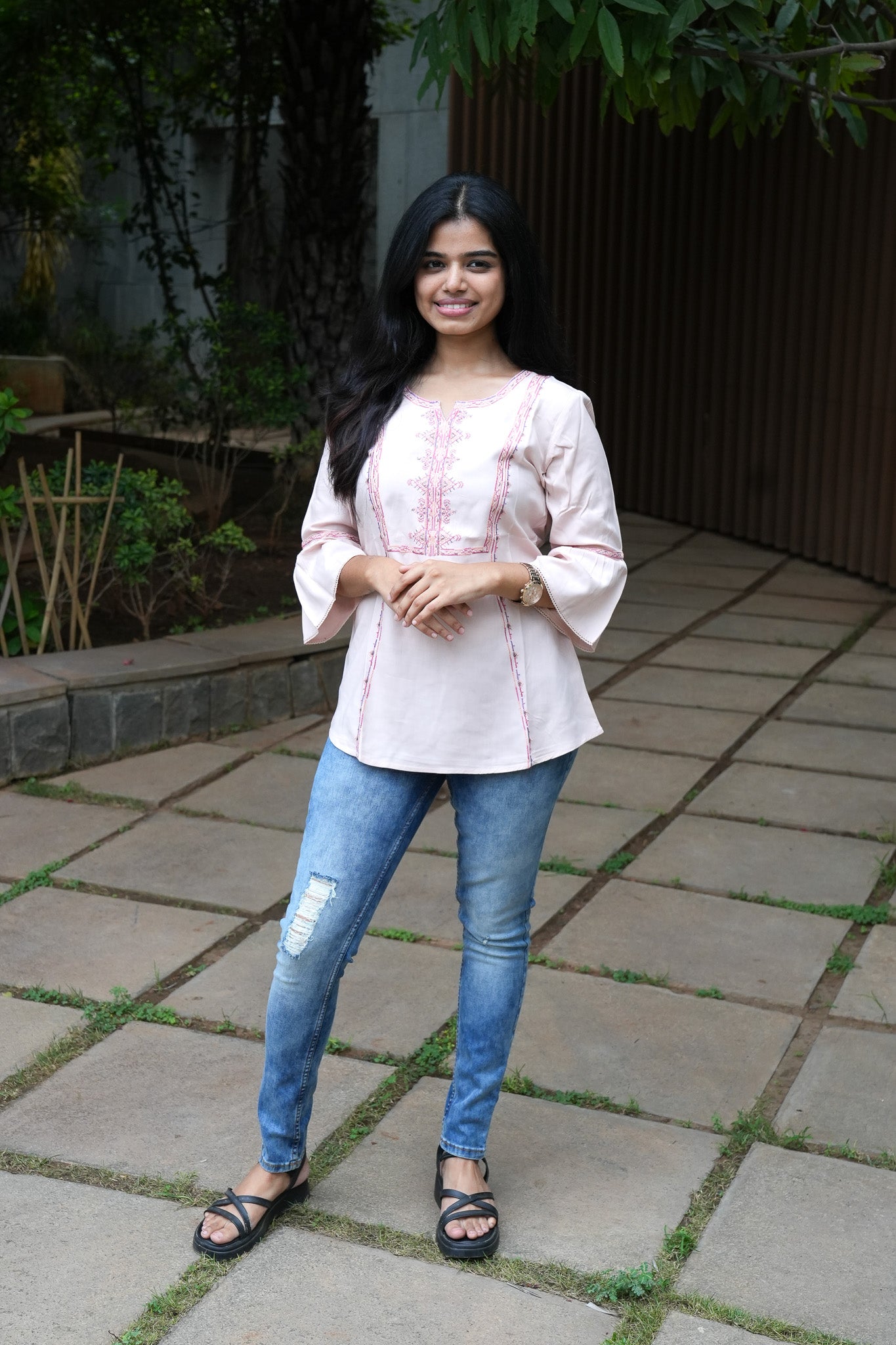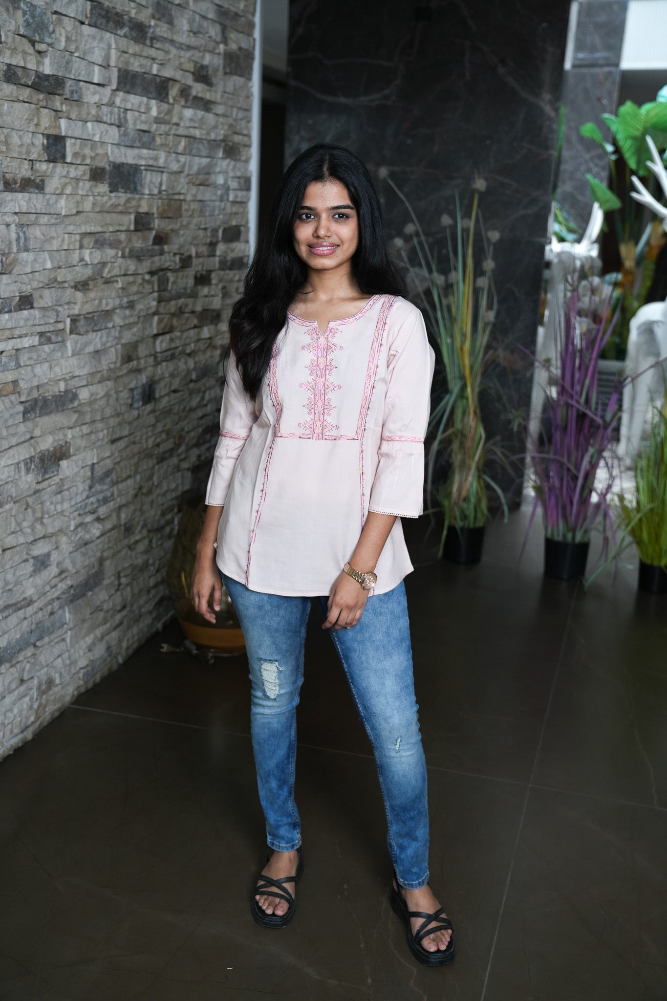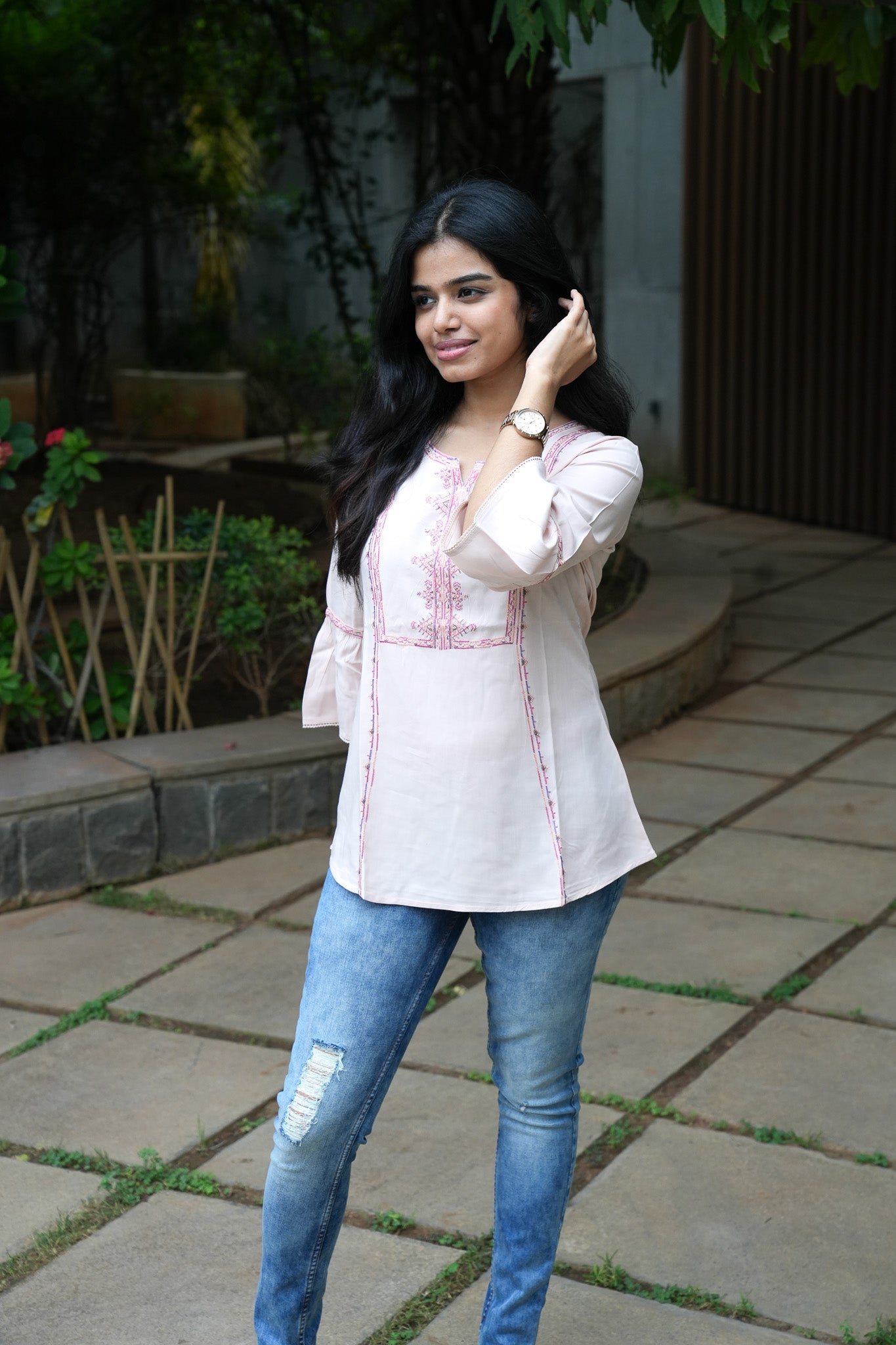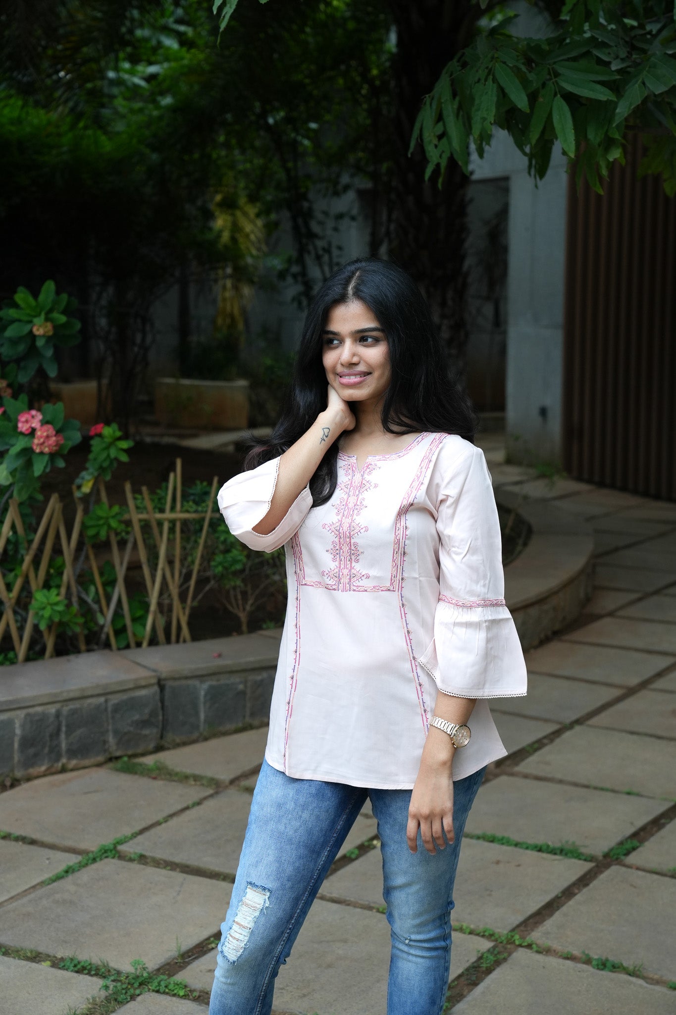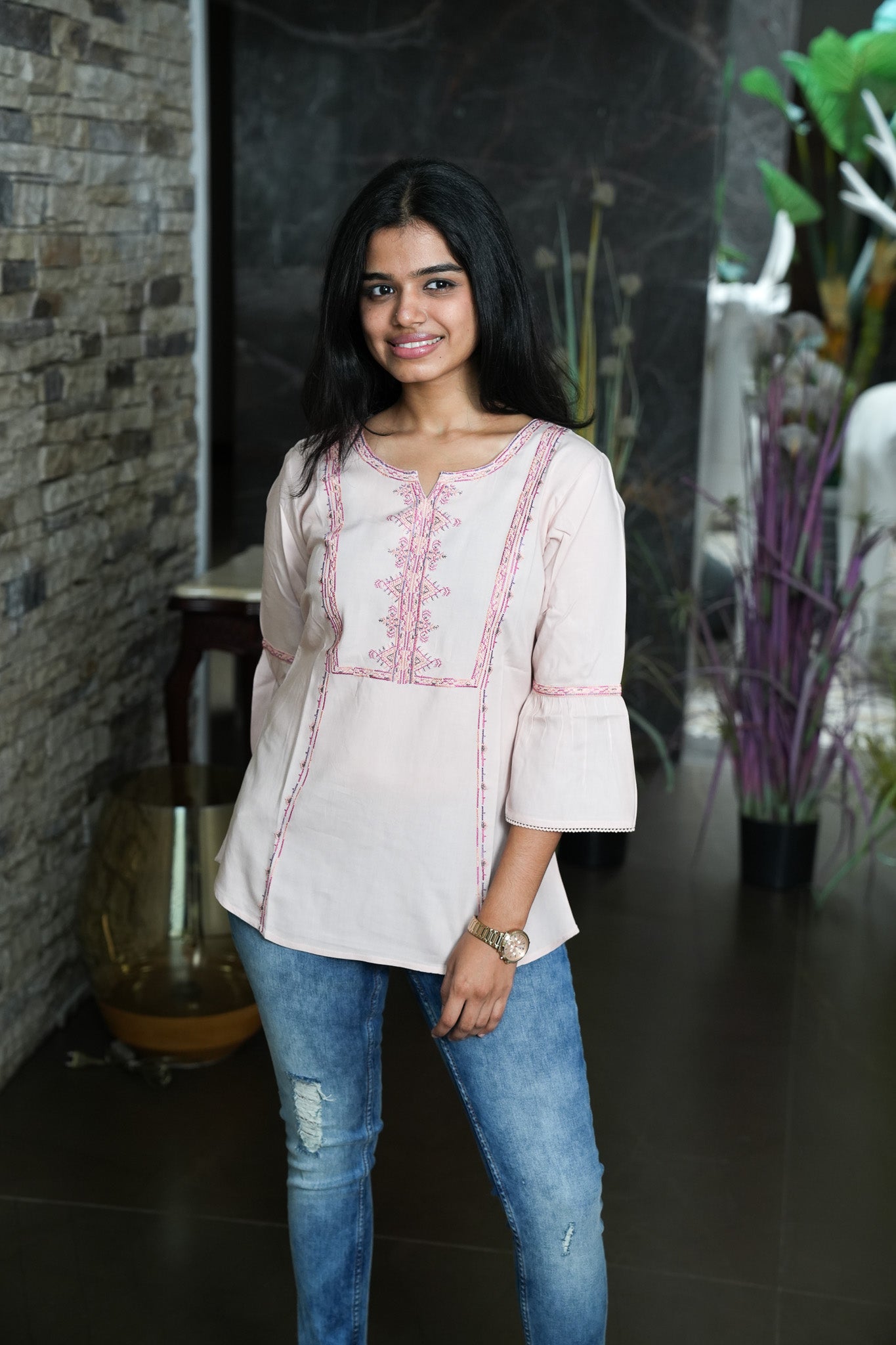 Beige embroidered cotton top with round neck and elbow length flared sleeves. These are so chic, comfortable and luxurious at the same time. Pair it with denim or cotton pants and the look is complete!!