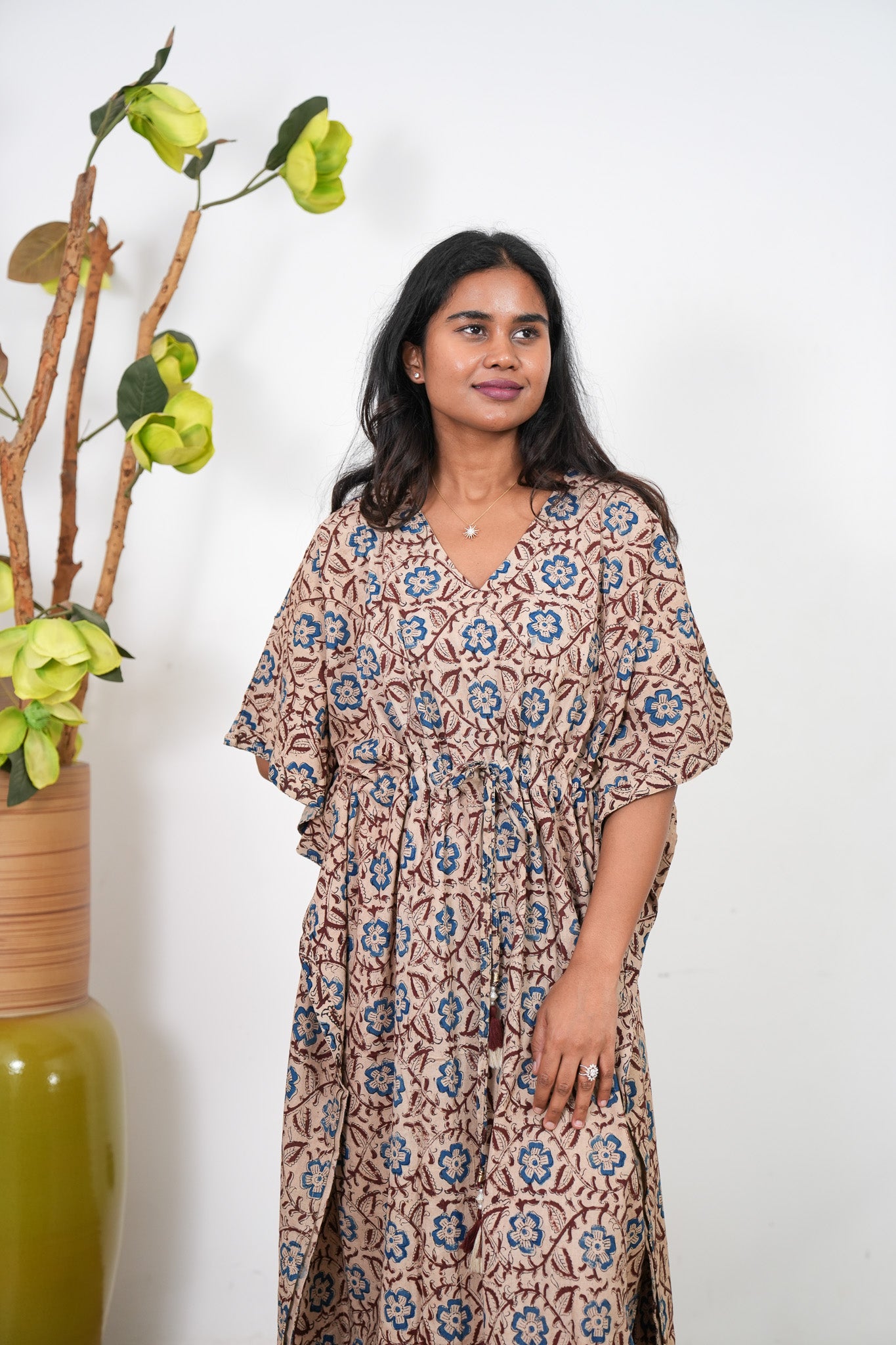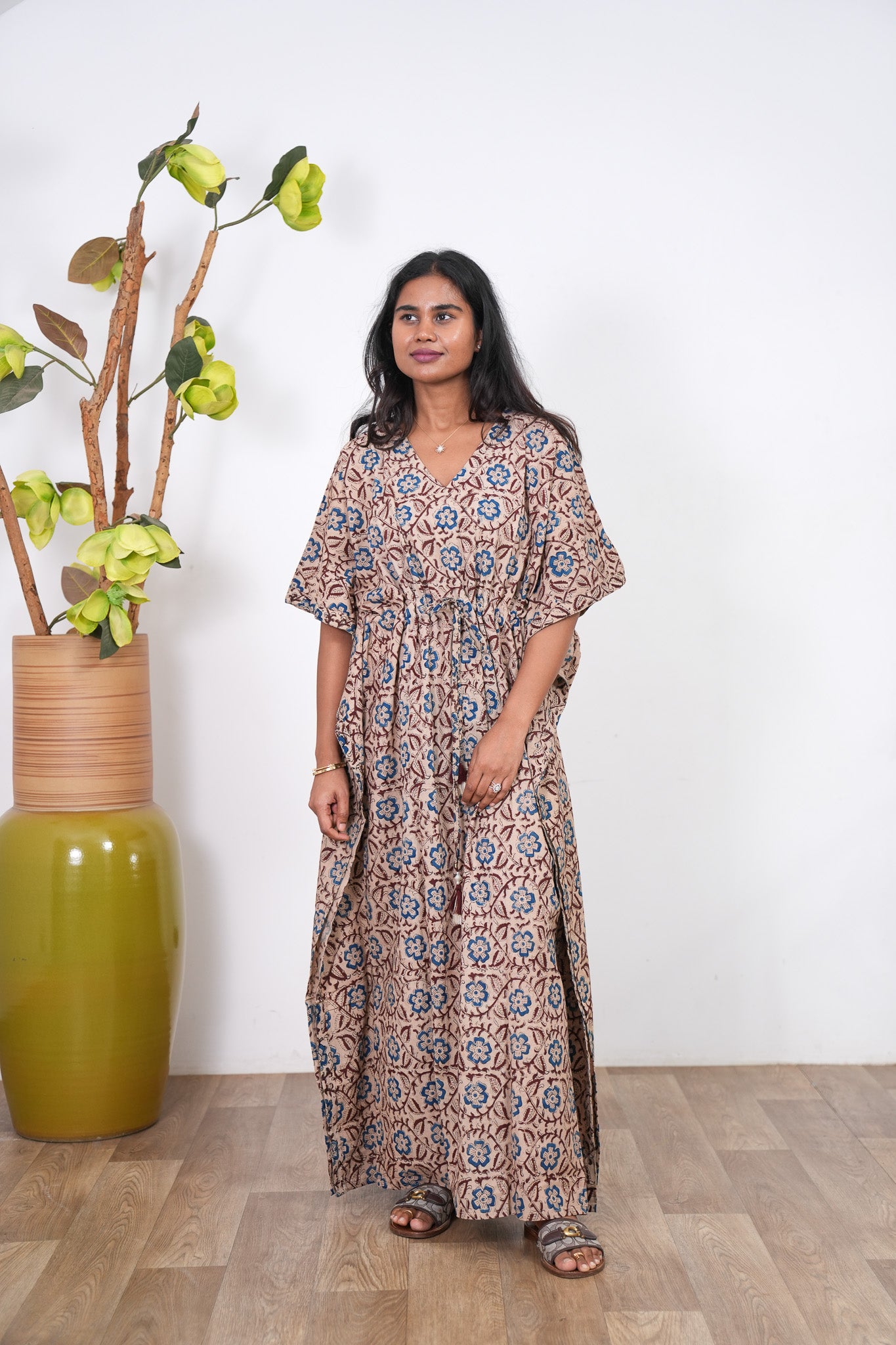 Easy breezy cotton kaftan made for you to feel absolute comfort, elegance and a total stunner at the same time. It comes V neck and tie in the centre with flowy silhouette and floral prints all over. Hand block technique used all over the kaftan.